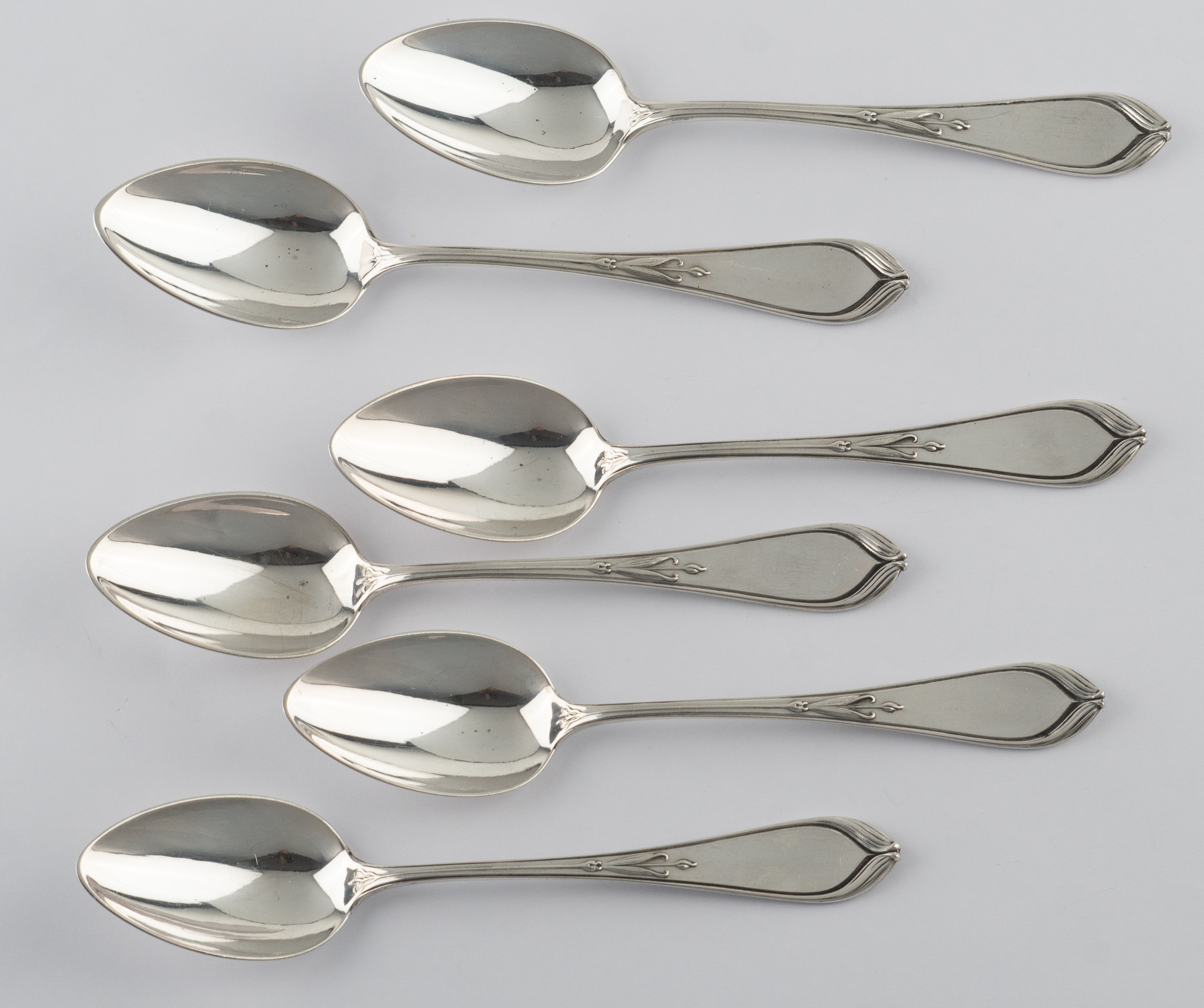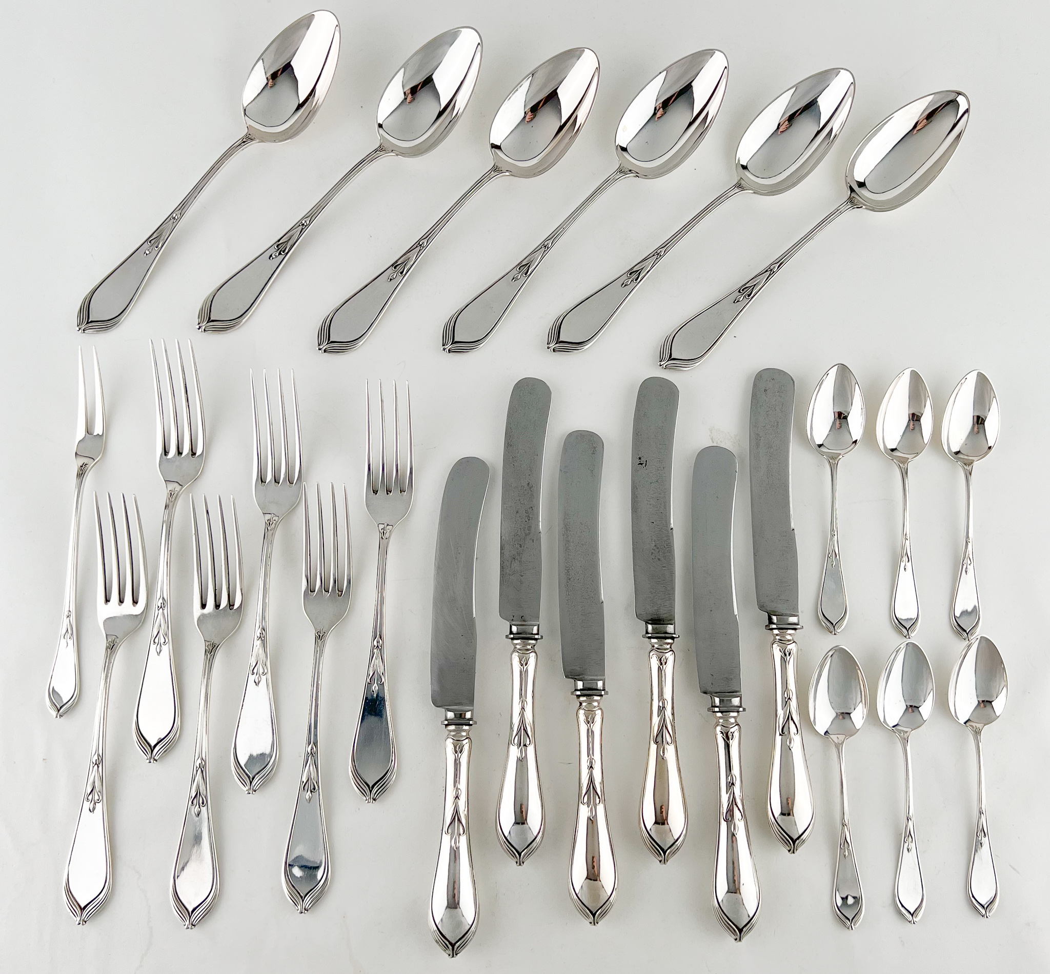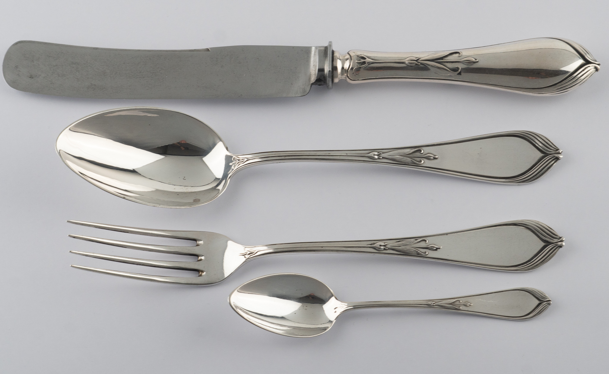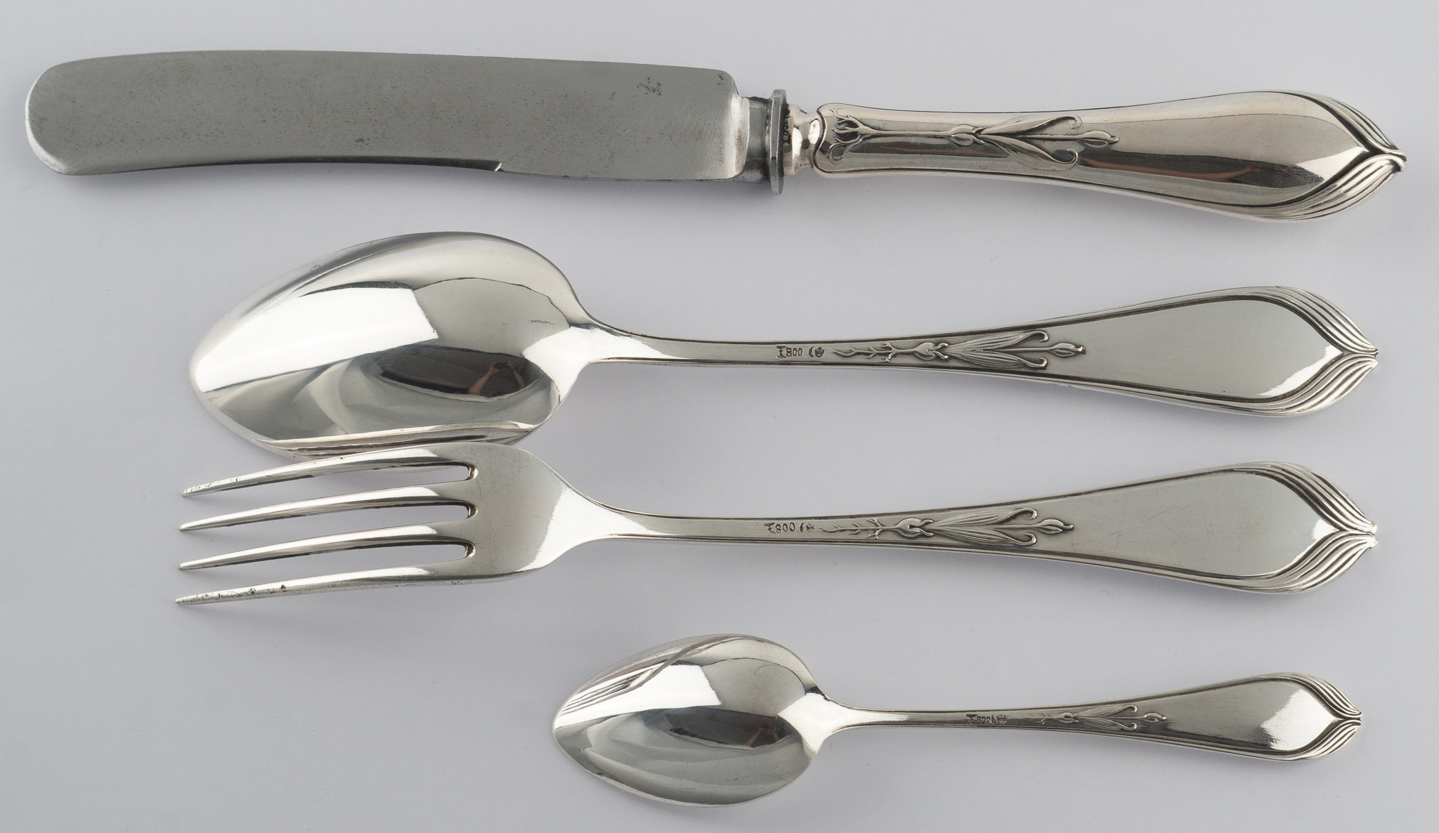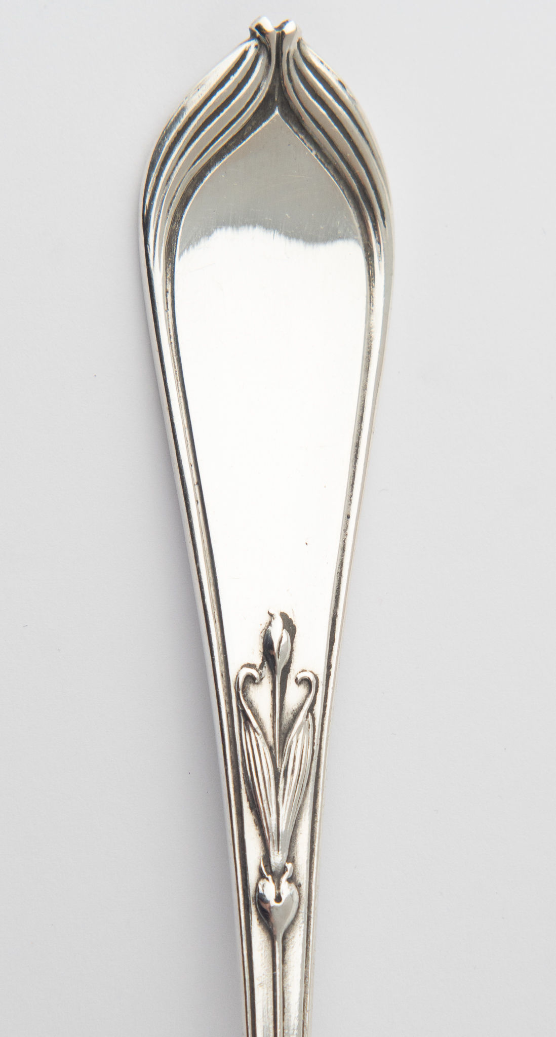 Ein 25-teiliges Besteck gearbeitet in 800er Silber im Dekor Bremer Lilie von Koch und Bergfeld. Entworfen von Hugo Leven zur Jahrhundertwende 1900 im „neuen Stil“, dem Jugendstil.