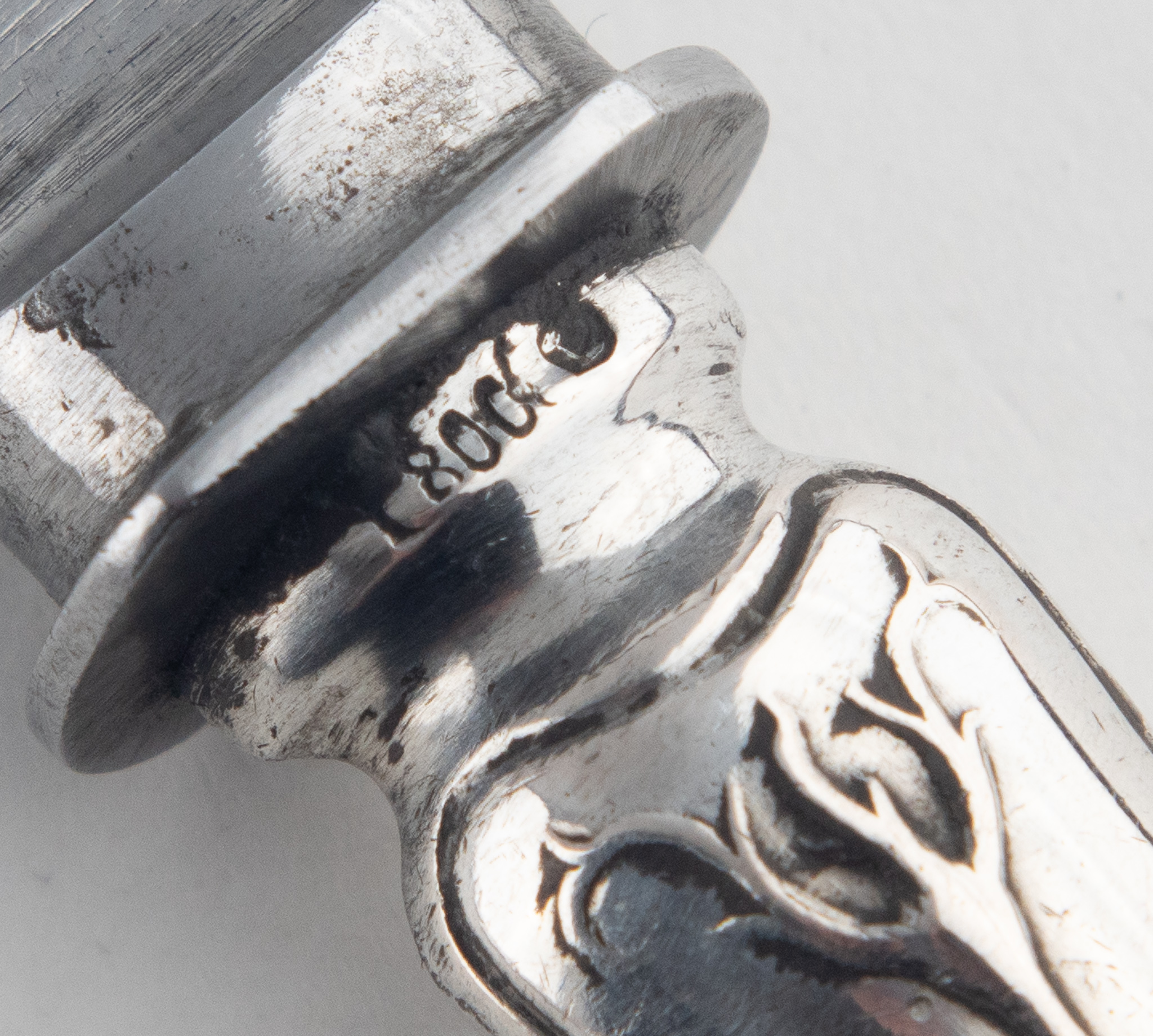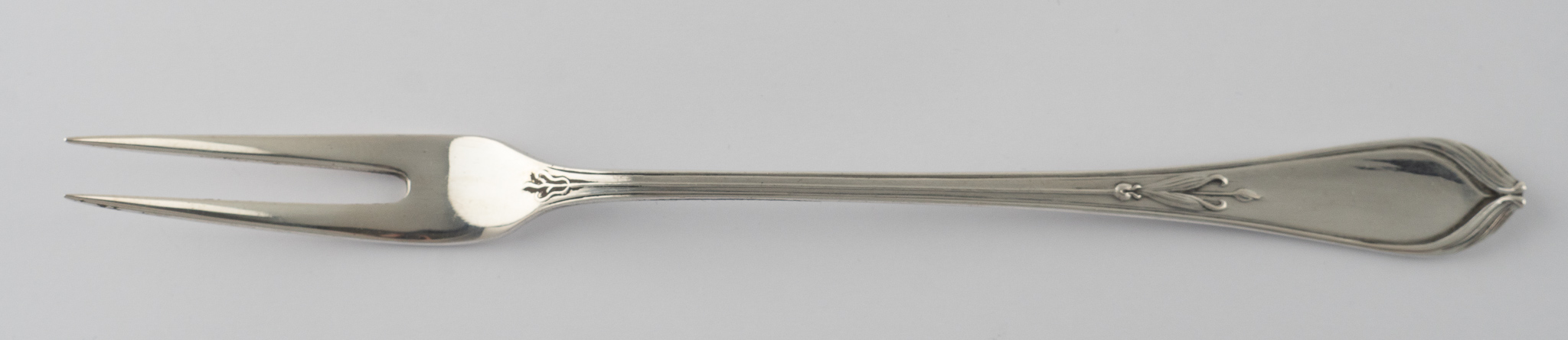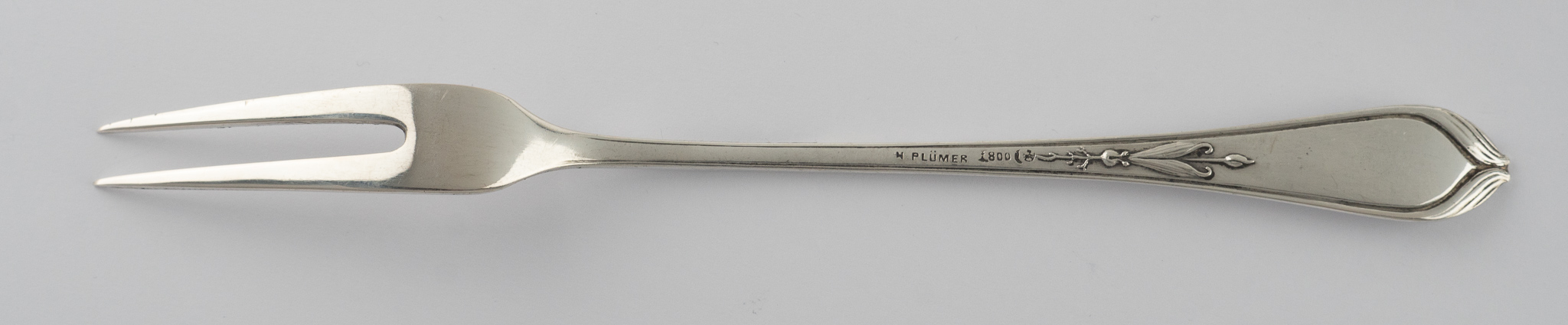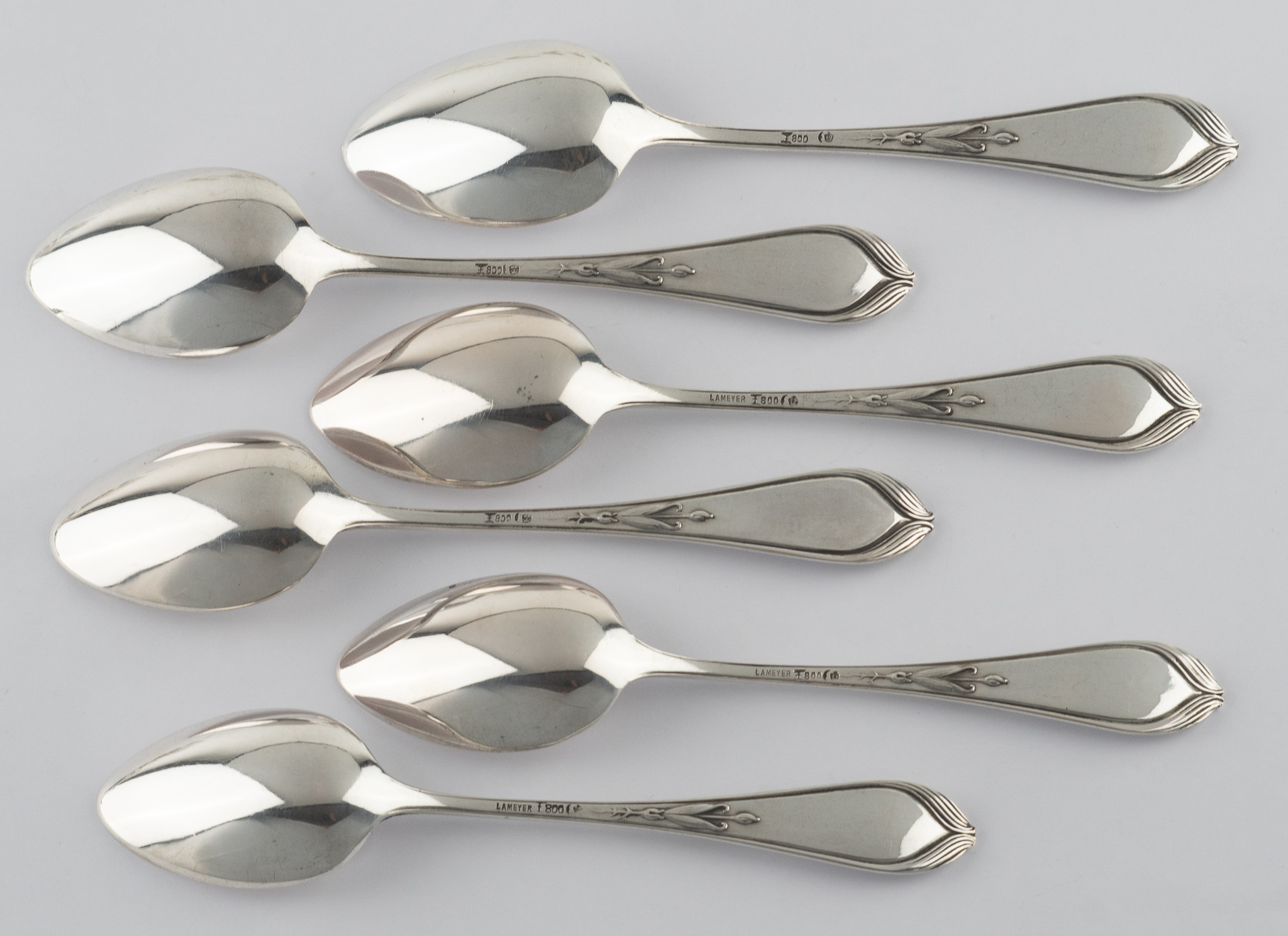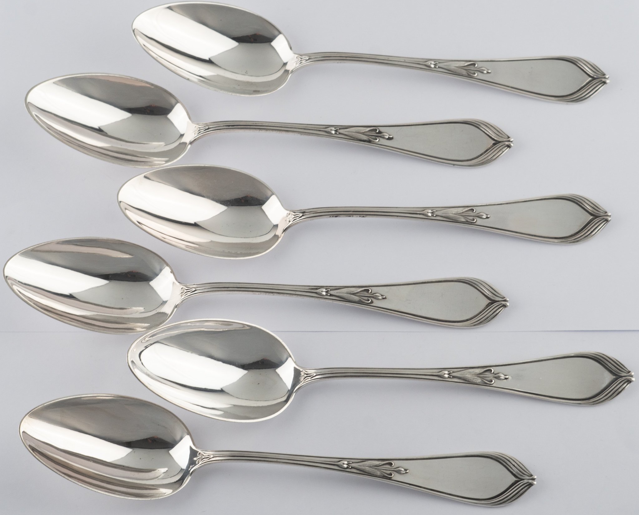 Ein 25-teiliges Besteck gearbeitet in 800er Silber im Dekor Bremer Lilie von Koch und Bergfeld. Entworfen von Hugo Leven zur Jahrhundertwende 1900 im „neuen Stil“, dem Jugendstil.