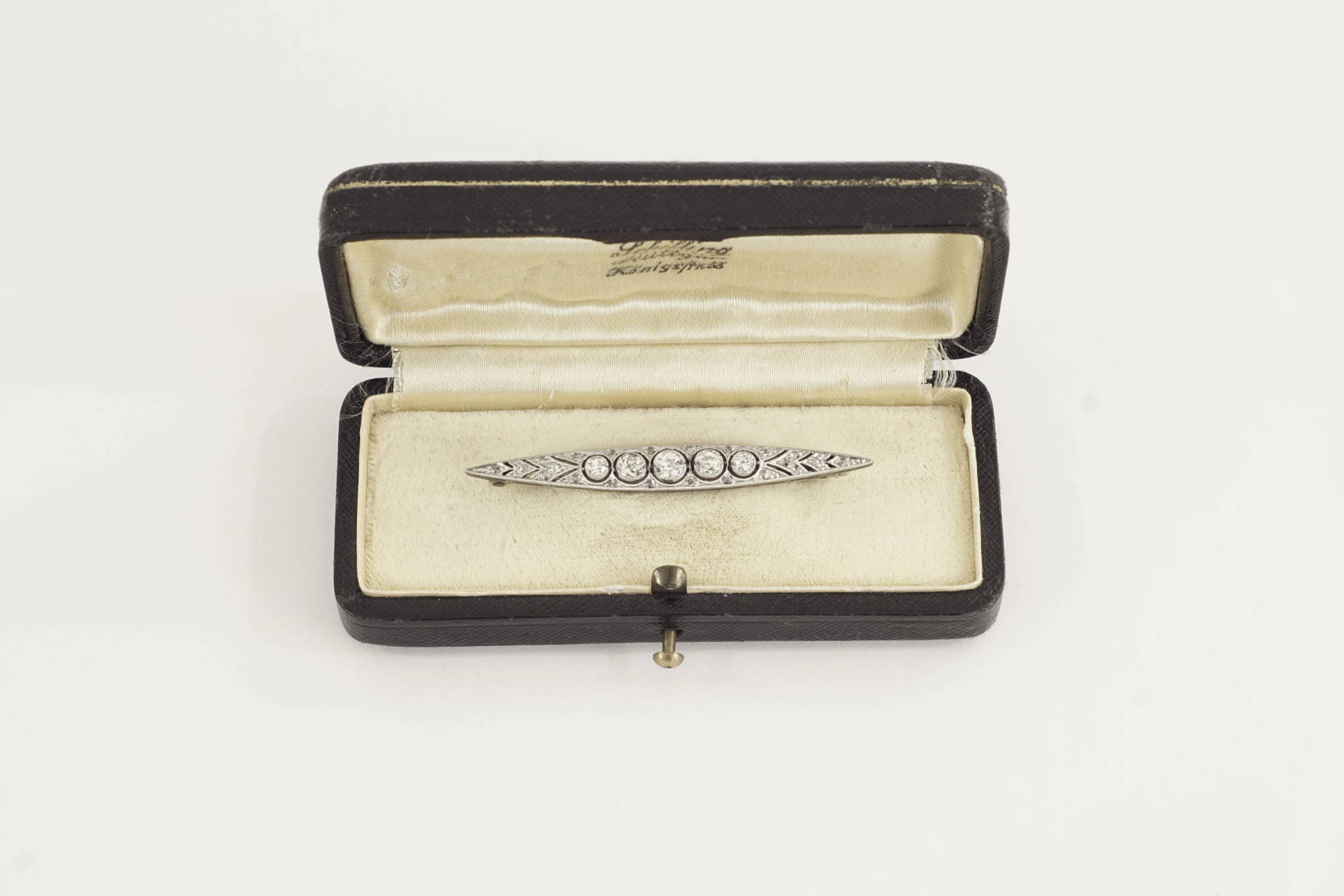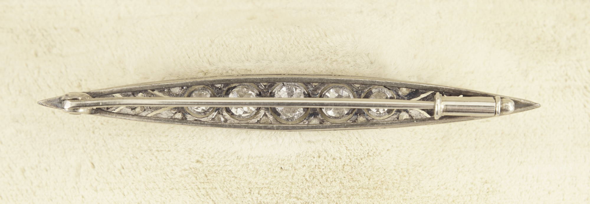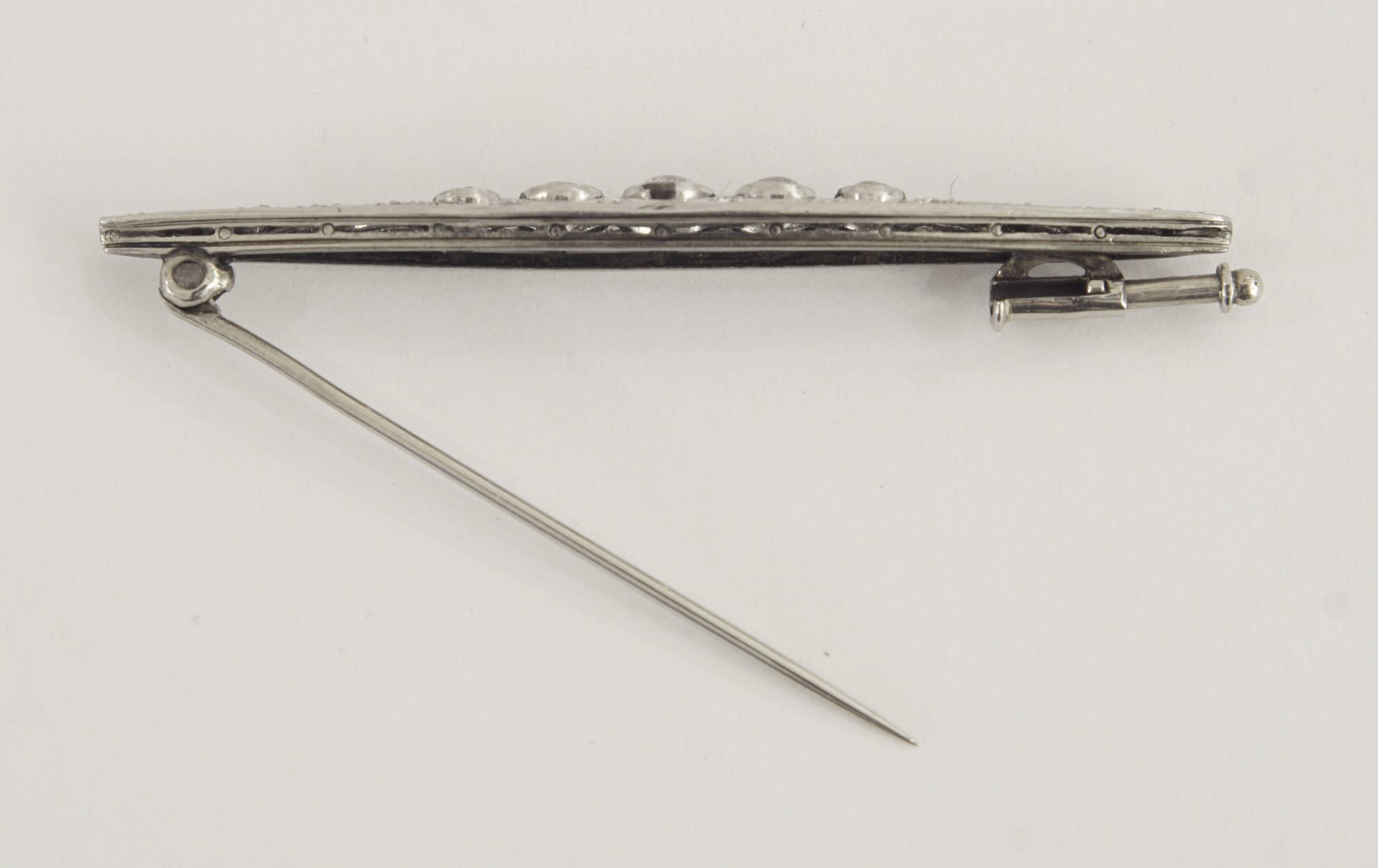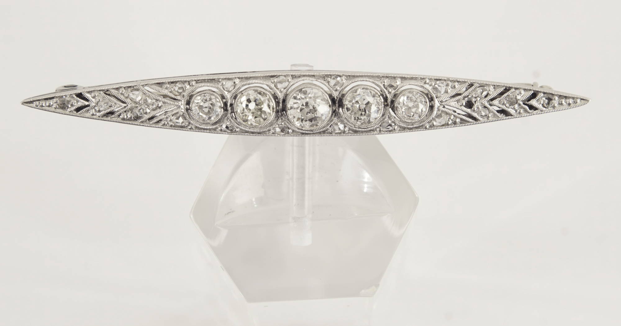 Eine aparte Belle-Epoque Stabnadel, Fassung „á jour“ gesägt, in Platin gearbeitet.