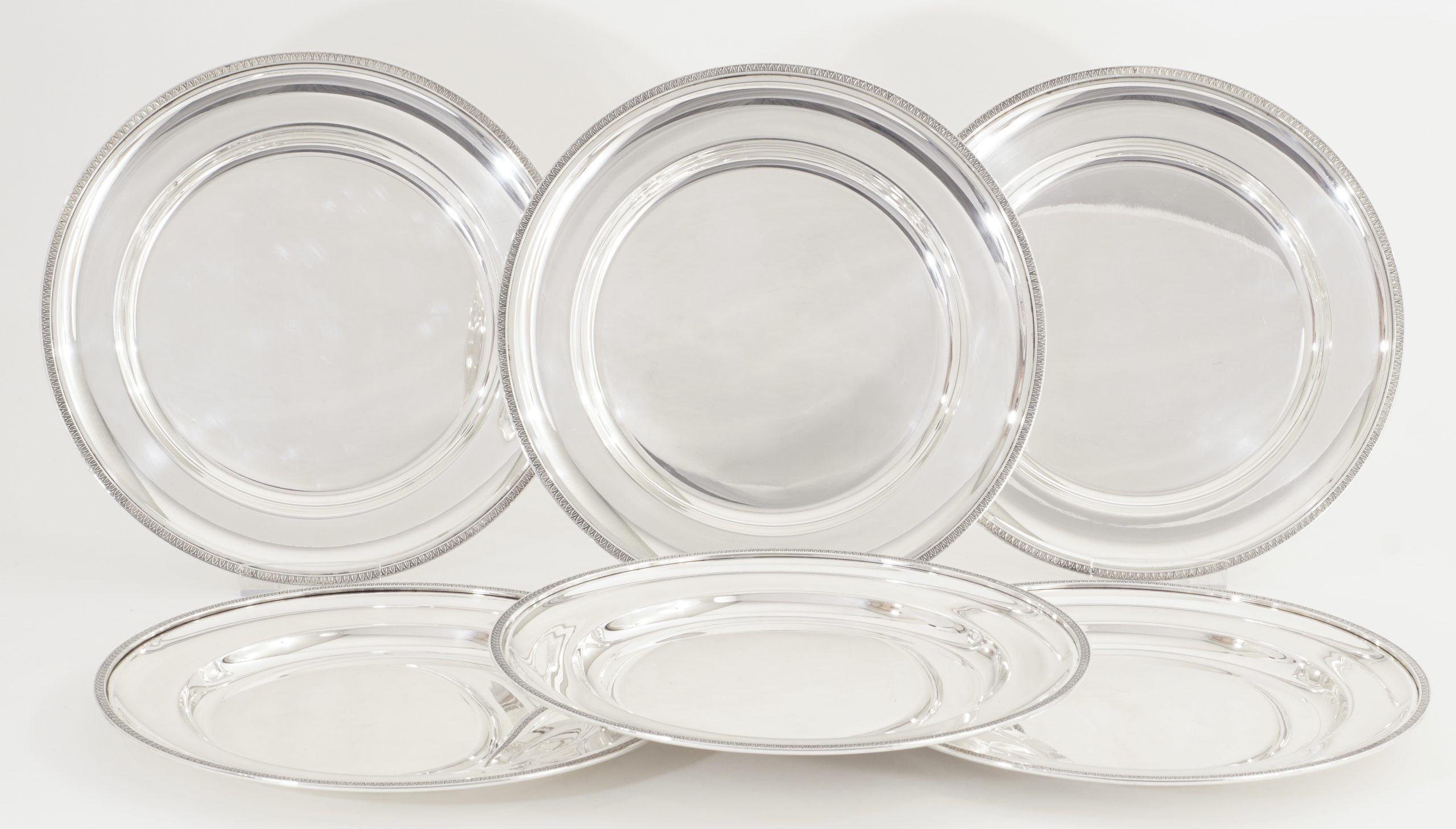 Ein Satz von 6 Platztellern, glatt hochpoliert mit Lorbeer-Bordüre.