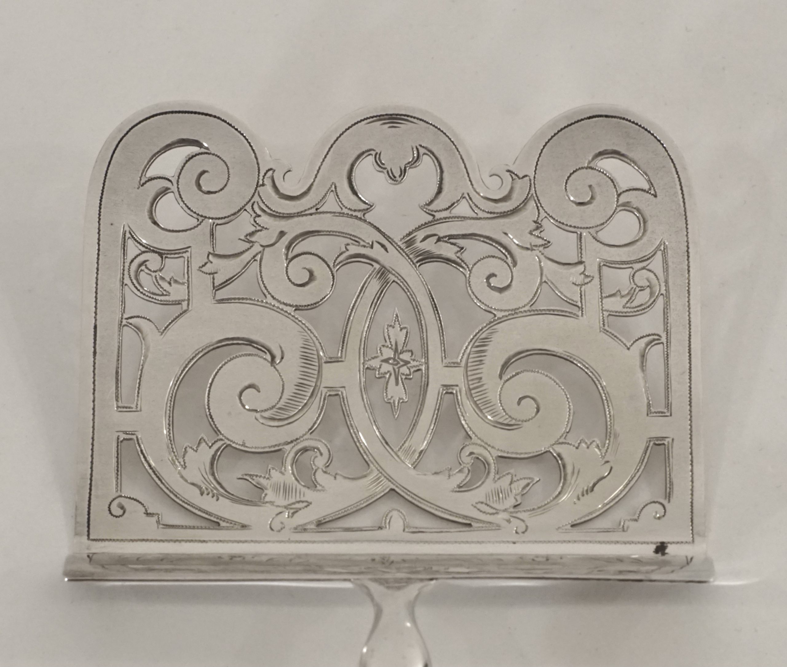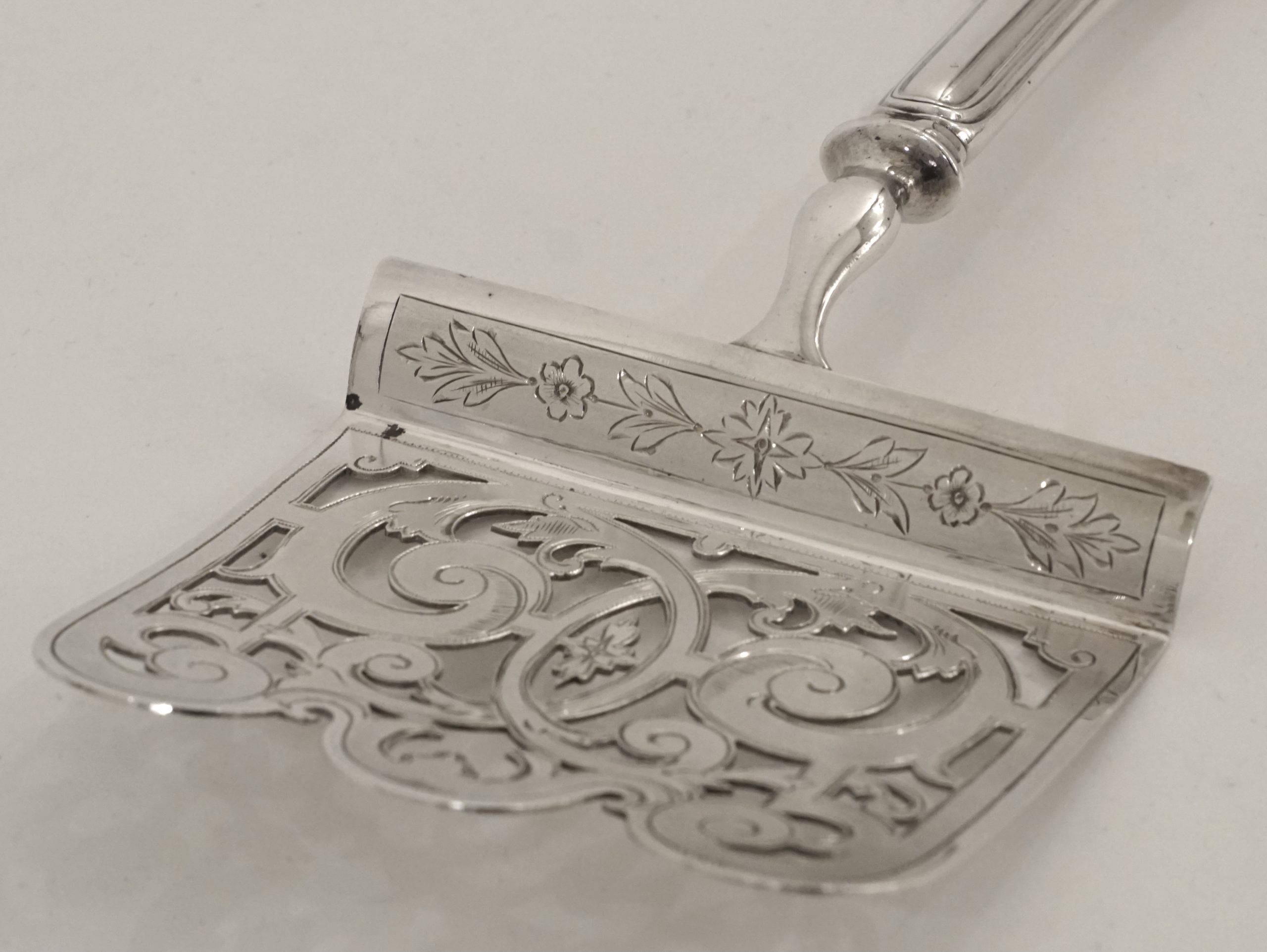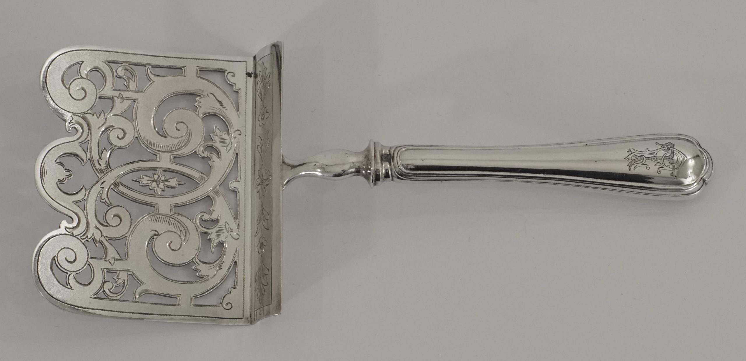 Ein Wiener Spargelheber in 800er Silber, Griff mit glattem hochpoliertem Dekor, Heber durchbrochen gearbeitet, Oberseite gefrostet/mattierte und fein ziseliert.