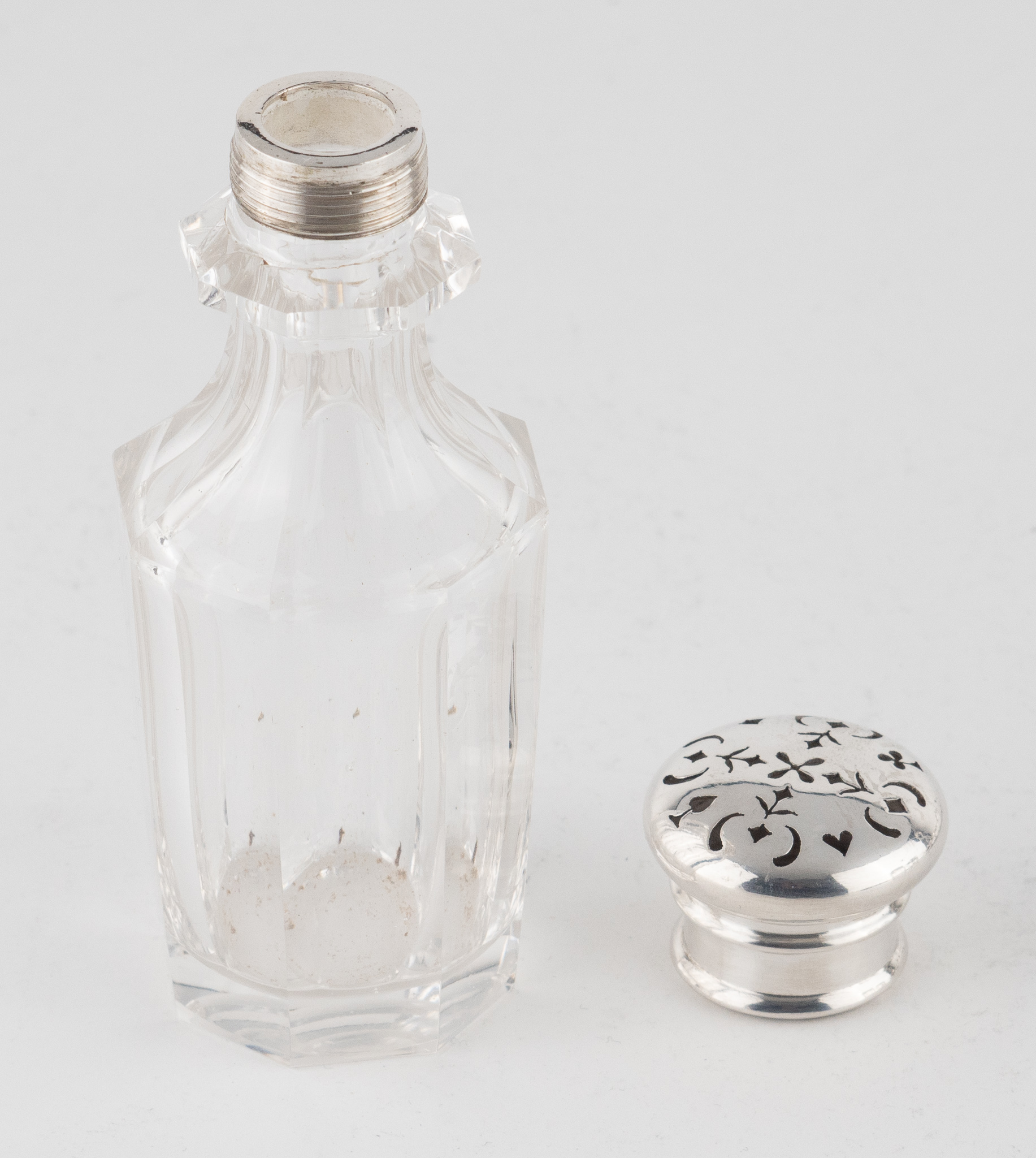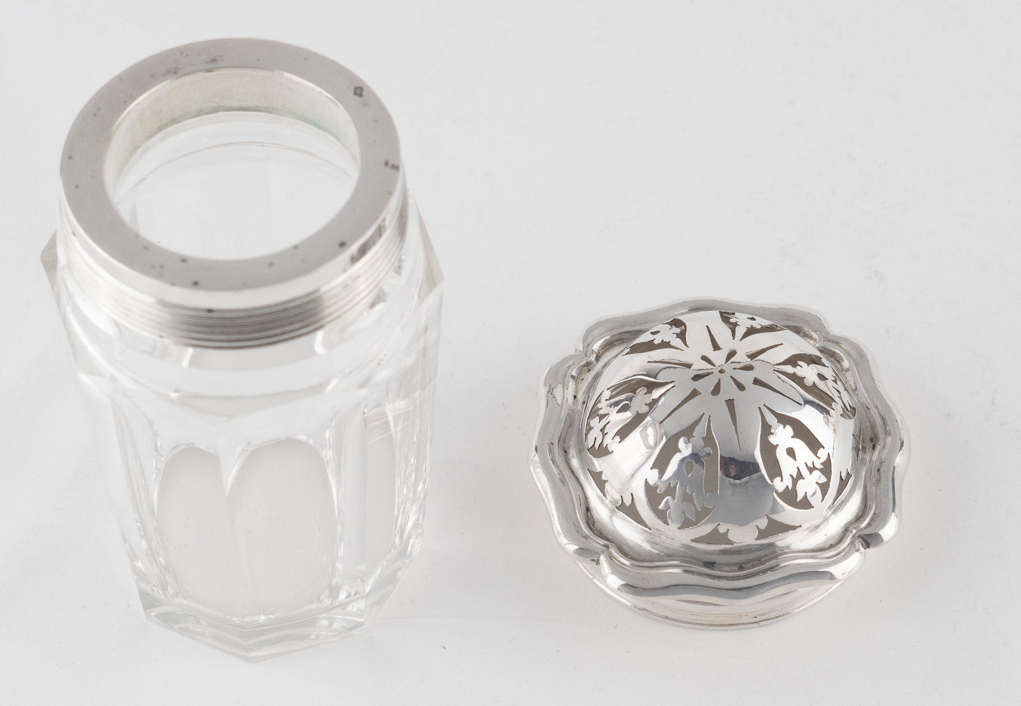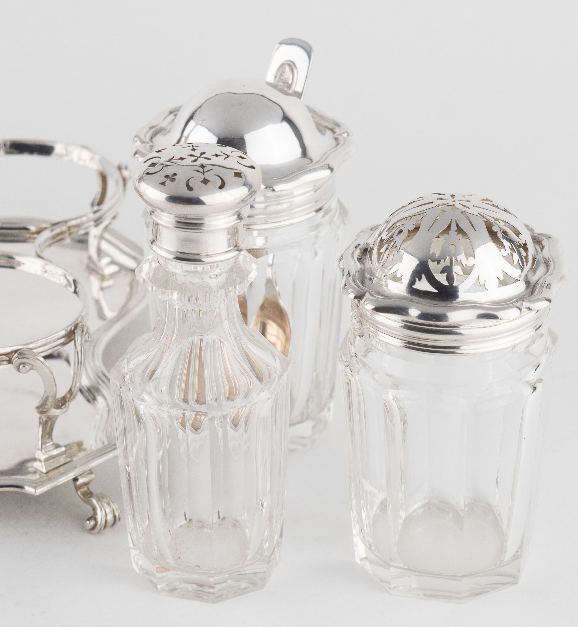 Bestehend aus 3 Glaskaraffen mit Stöpsel, zwei Steuer mit Silbermontierung und Silberdeckel, ein Senfgefäß mit Silberdeckel und Silberlöffel.