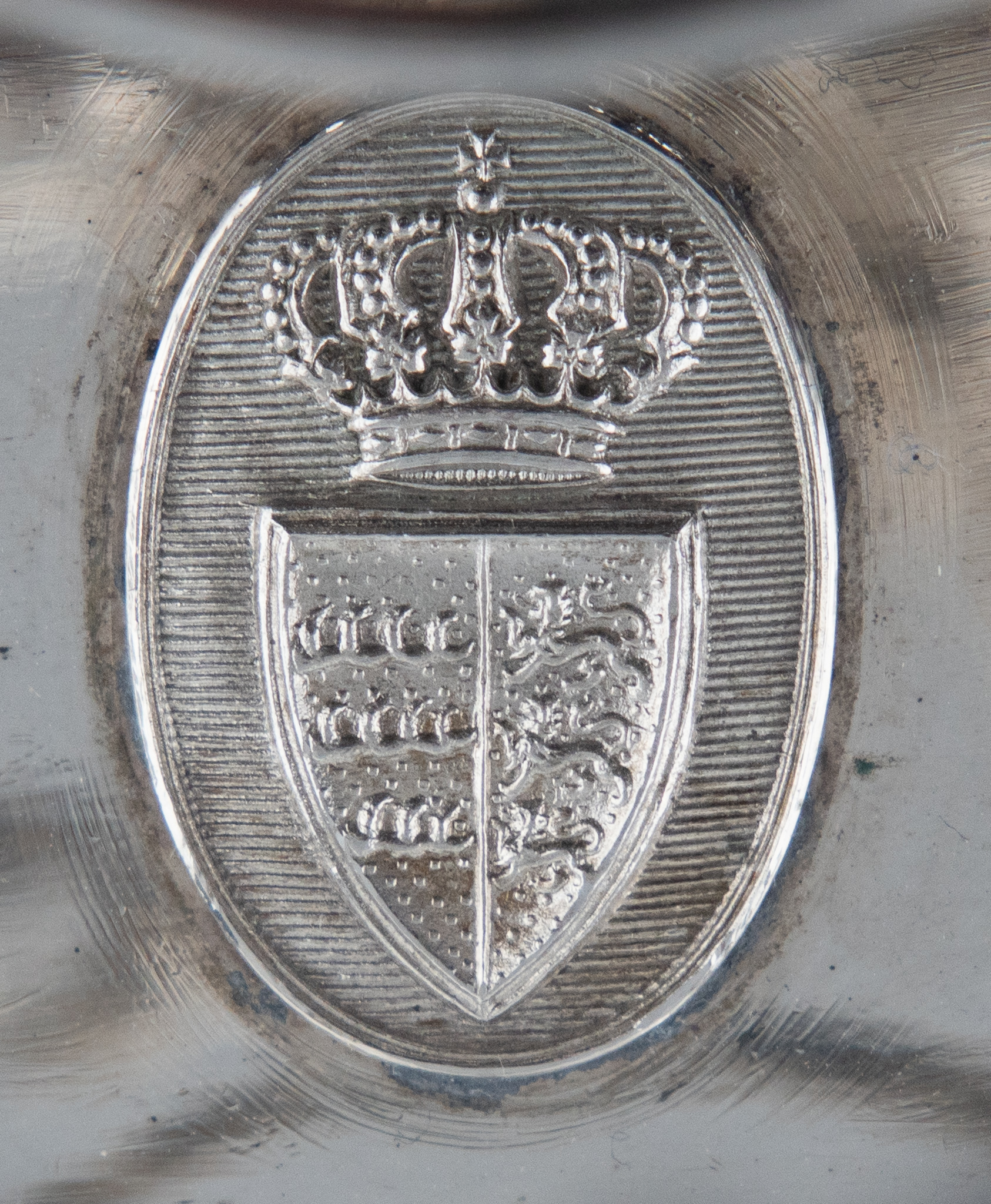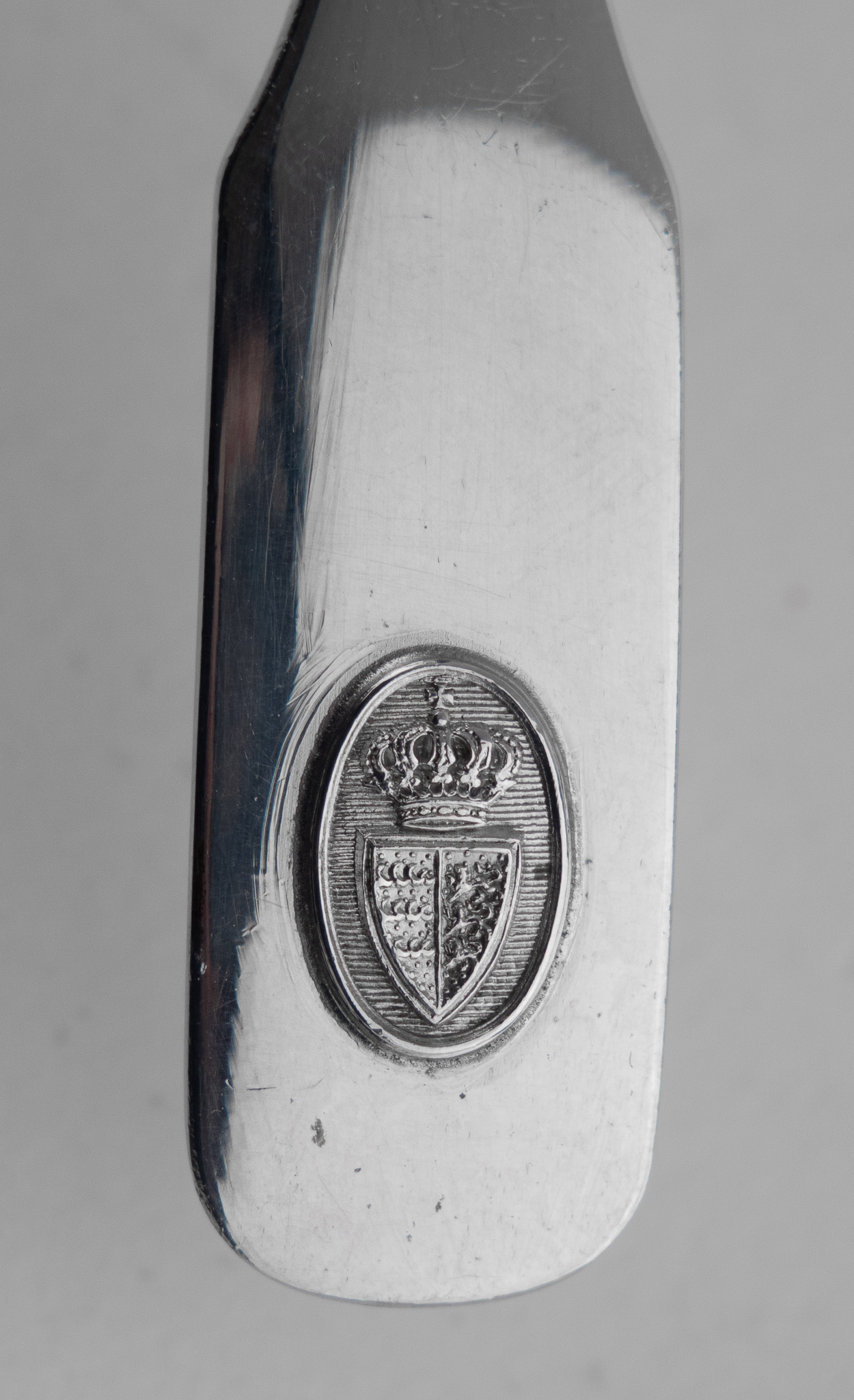 Eine elegante 7-teilige Menage, solide gearbeitet in 13 Lot (812,5/1000) Silber, aus dem herzoglichen Haus Württemberg. Mittig auf der Menage und dem Senflöffel das aufgelegte bekrönte Württembergische Wappen.