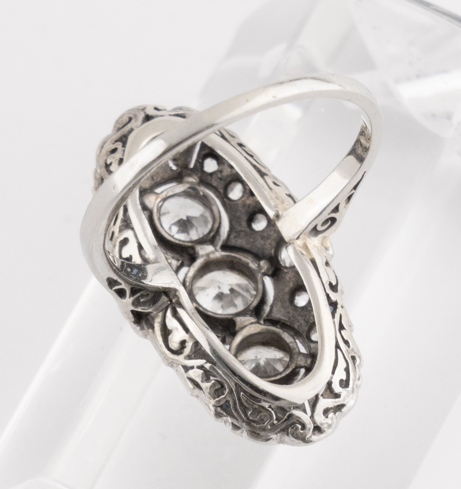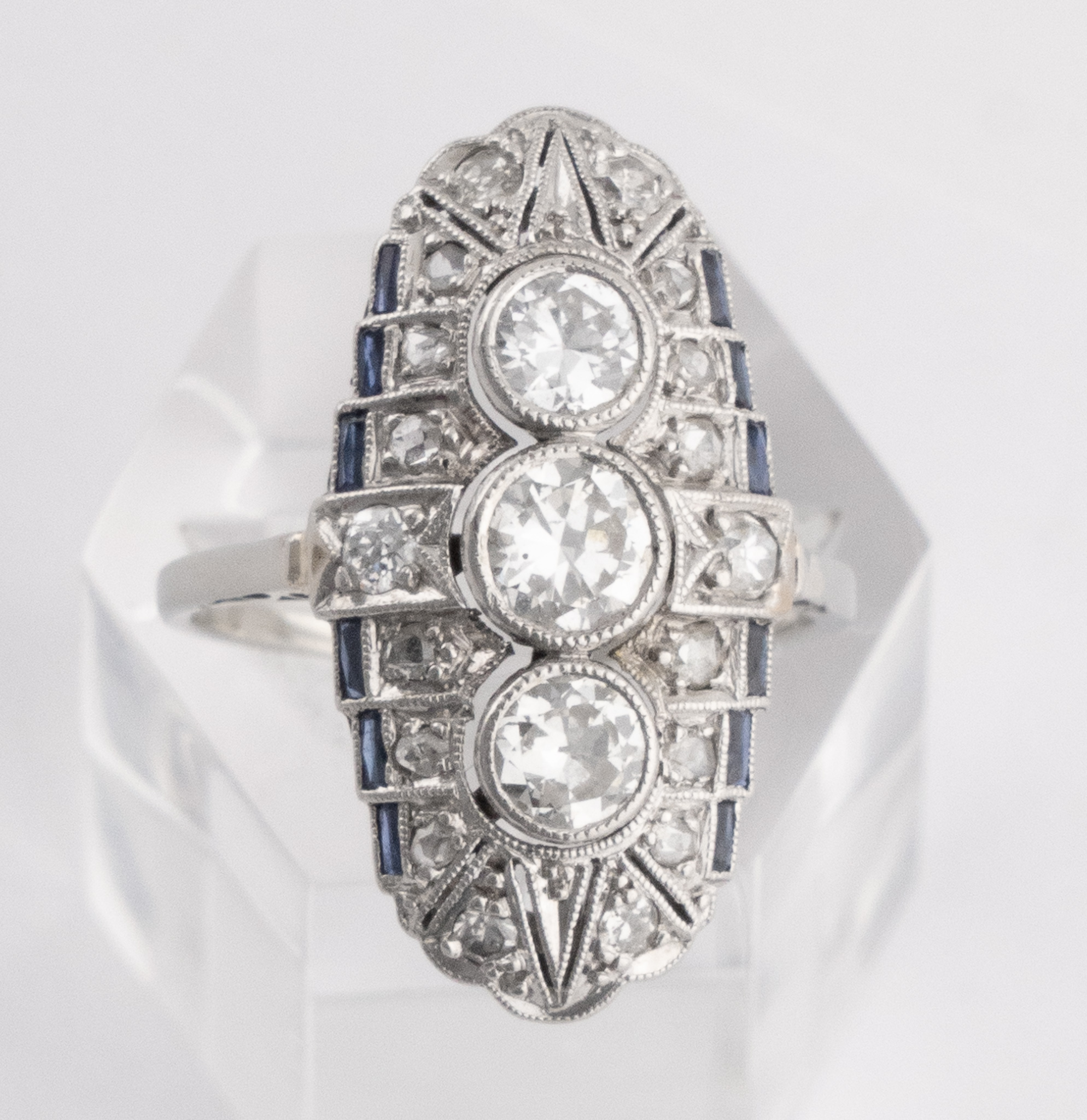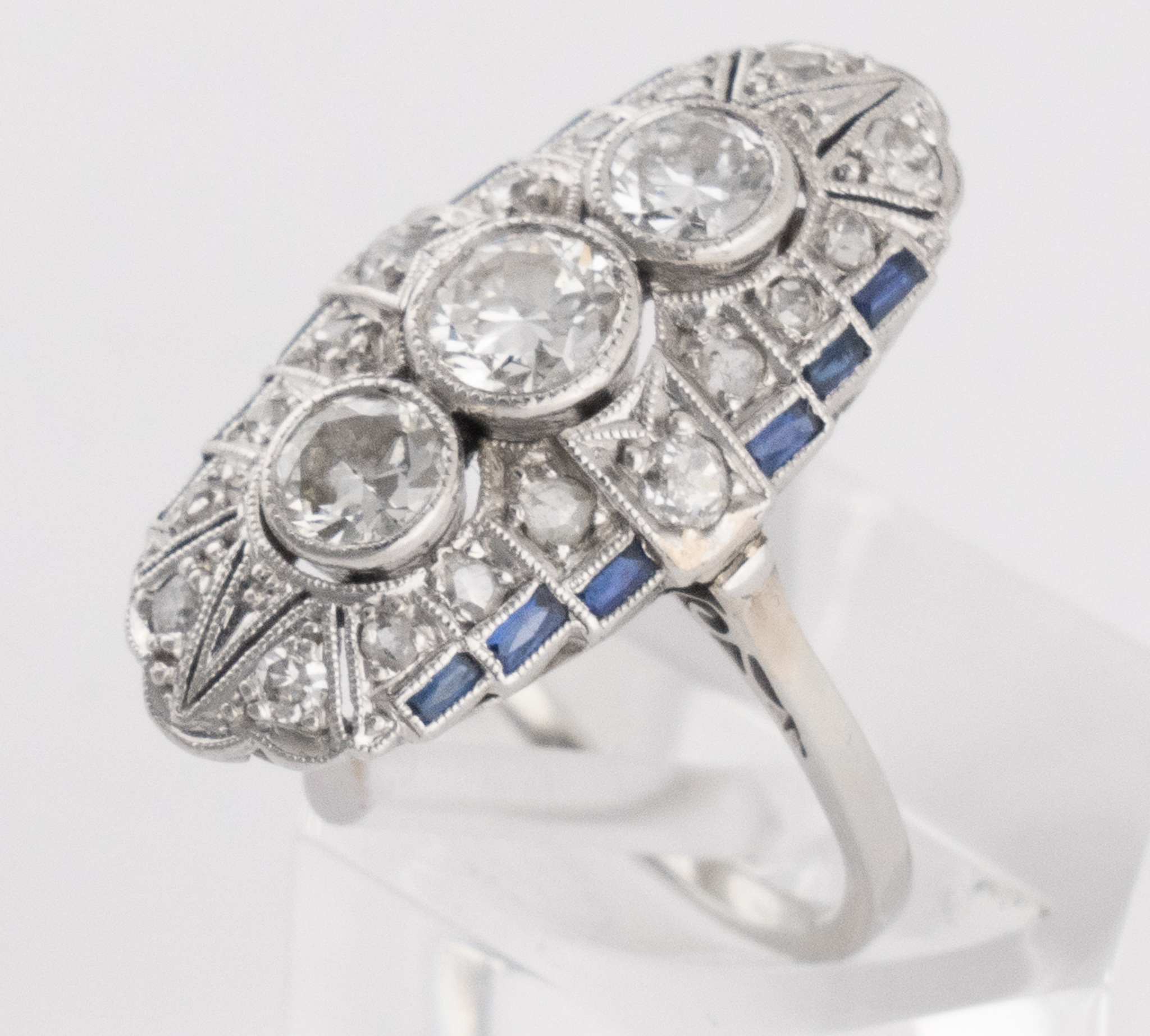 Ein Art-déco Ring in 18 Kt. Weißgold mit 3 Altschliff Diamanten von zus. ca. 0.45 ct. sowie Rosendiamanten und Saphire.