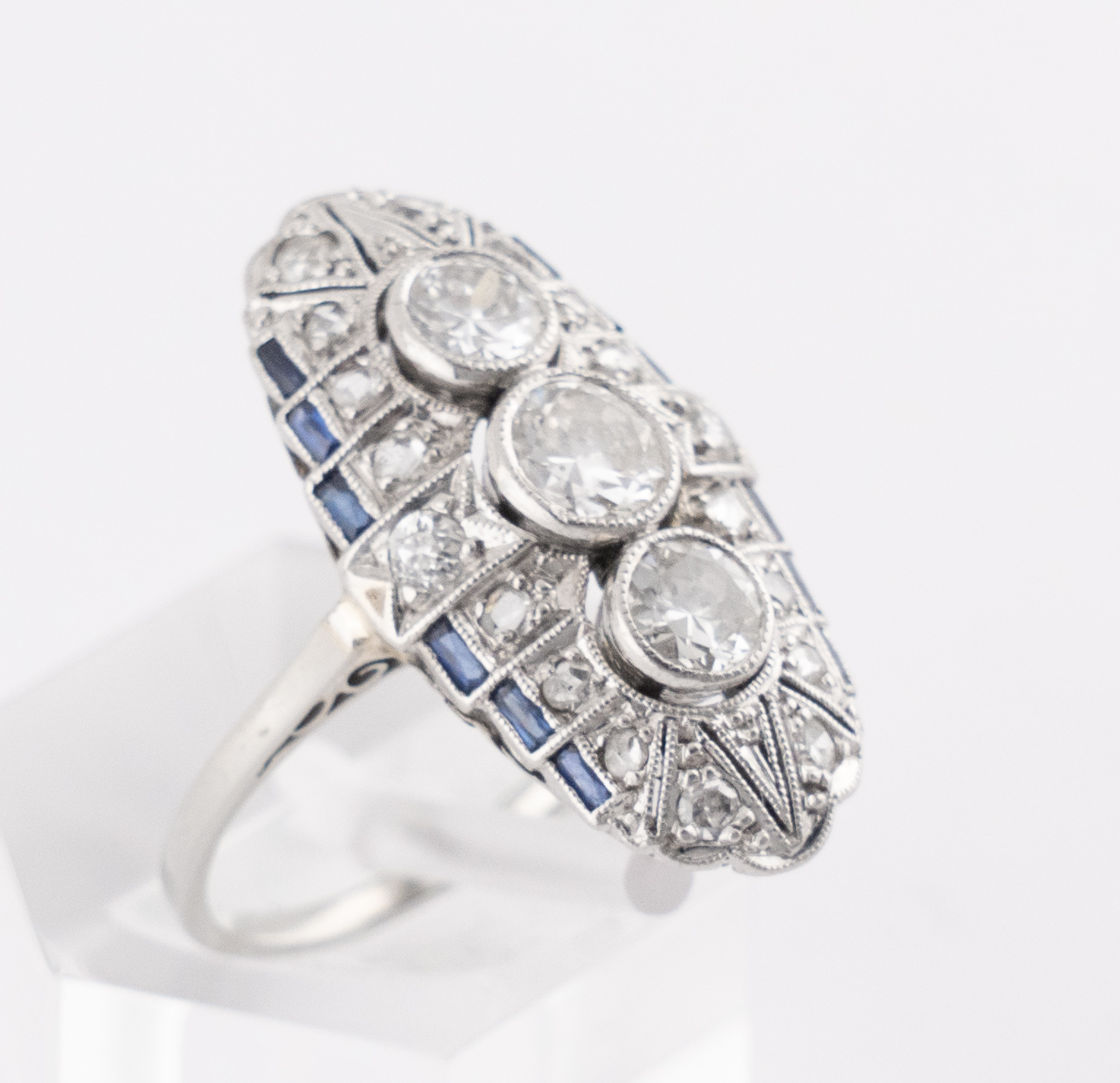Ein fein gearbeiteter Art-deco Ring in 18 Karat (750/1000) Weißgold mit 3 Altschliff Diamanten (2x 0.2 ct. und 1x 0.25 ct.) und 18 Diamanten im Rosenschliff sowie 12 Saphir Baguettes.