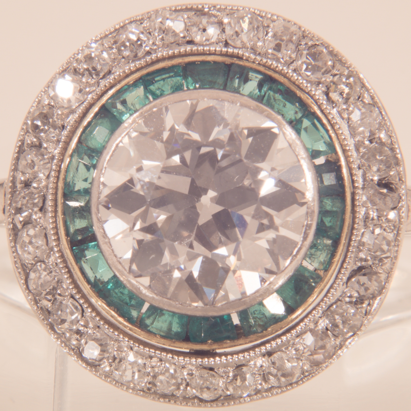 Begleitet von 18 kolumbianischen Smagard Trapezen und 28 altschliff Diamanten zusammen ca 0,4 ct.