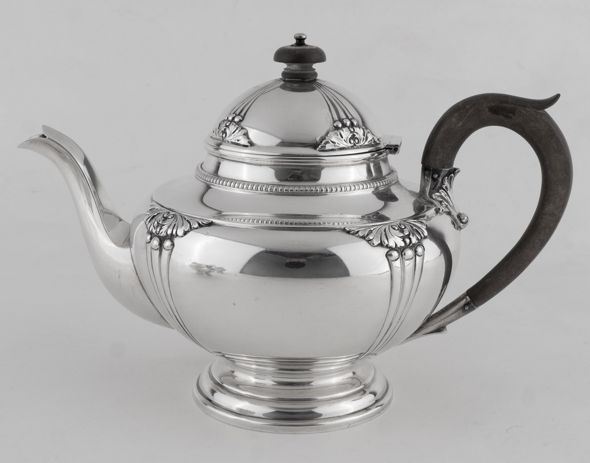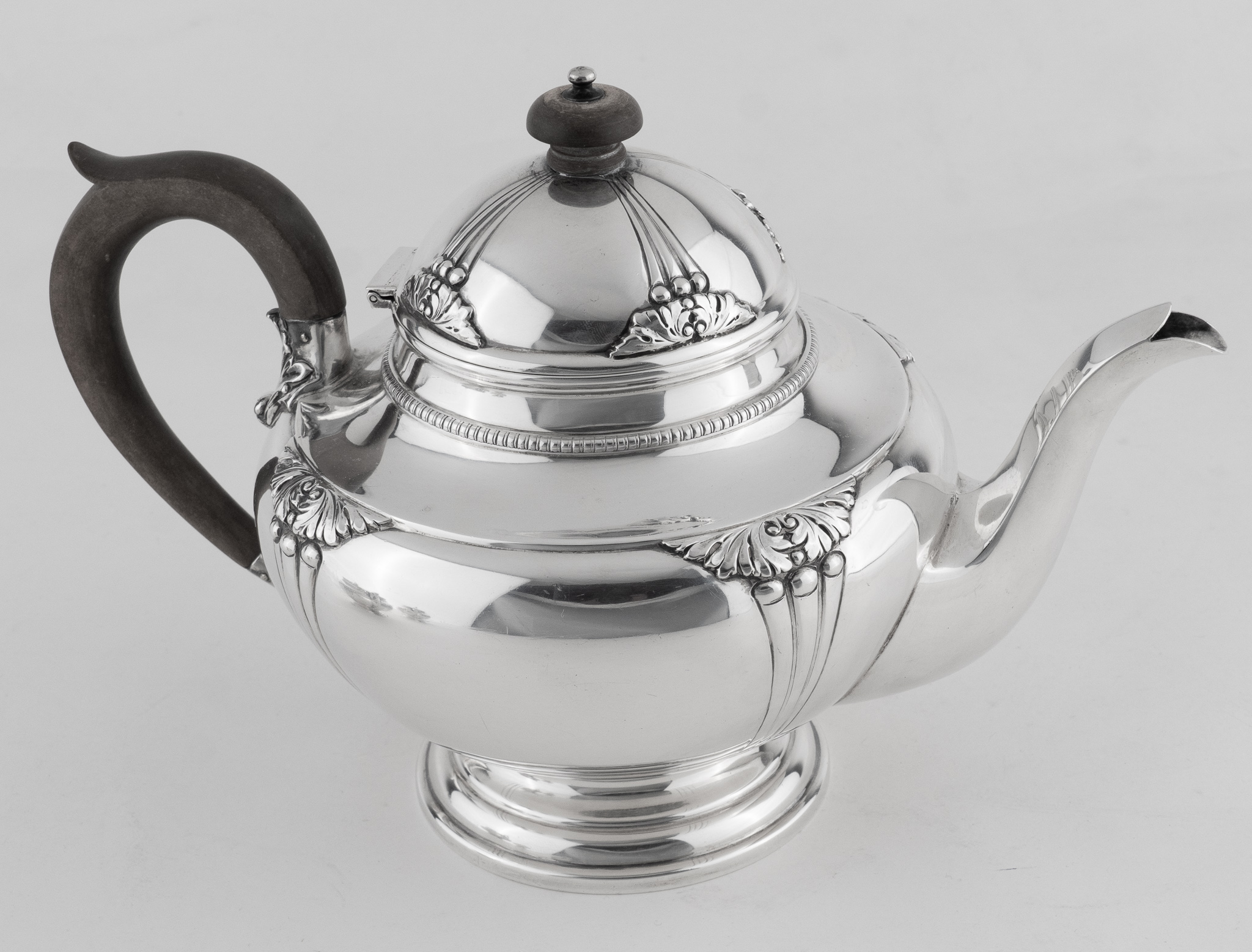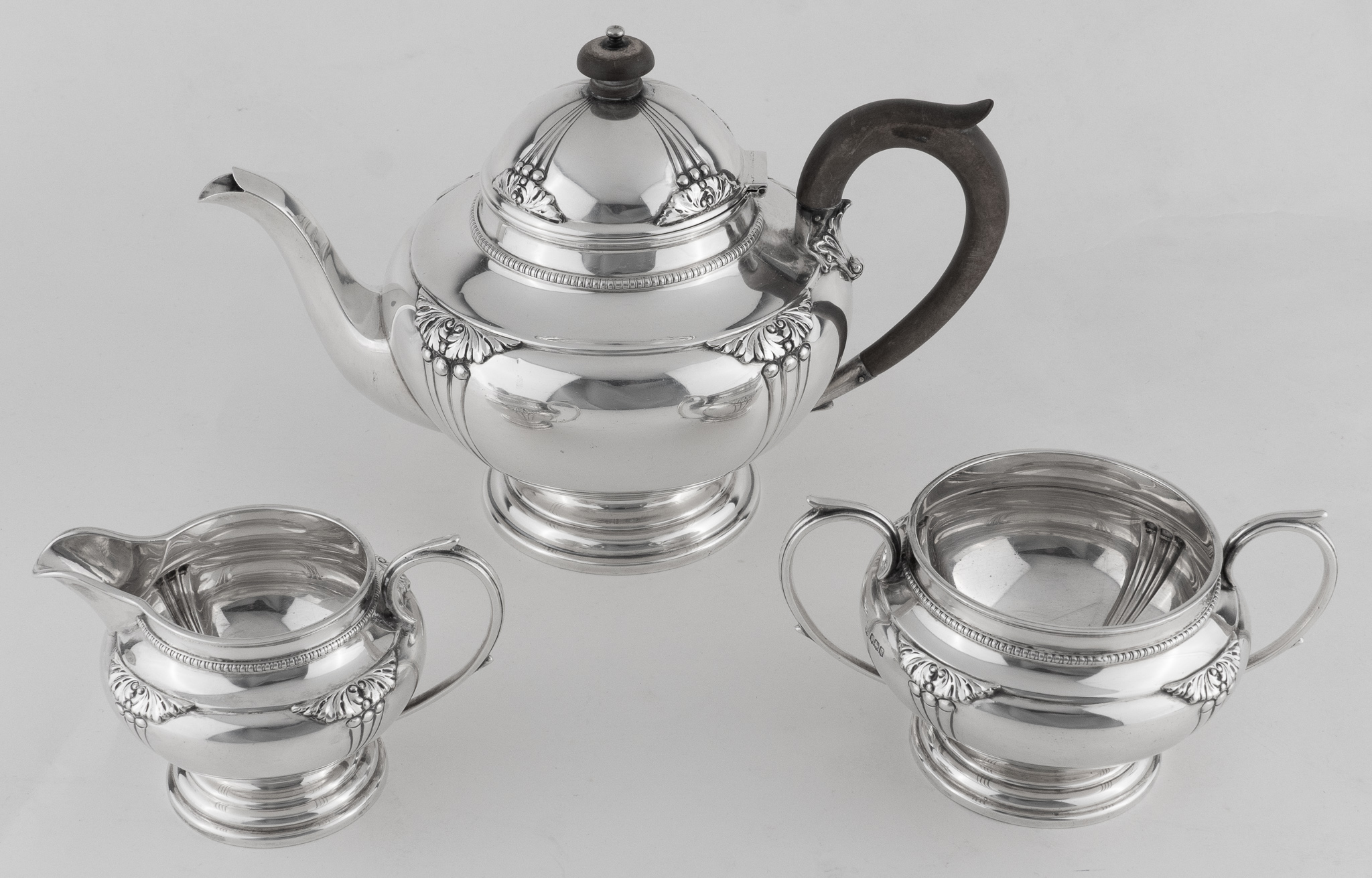 Ein englisches dreiteiliges Teeset in 925er Sterlingsilber und Holz.