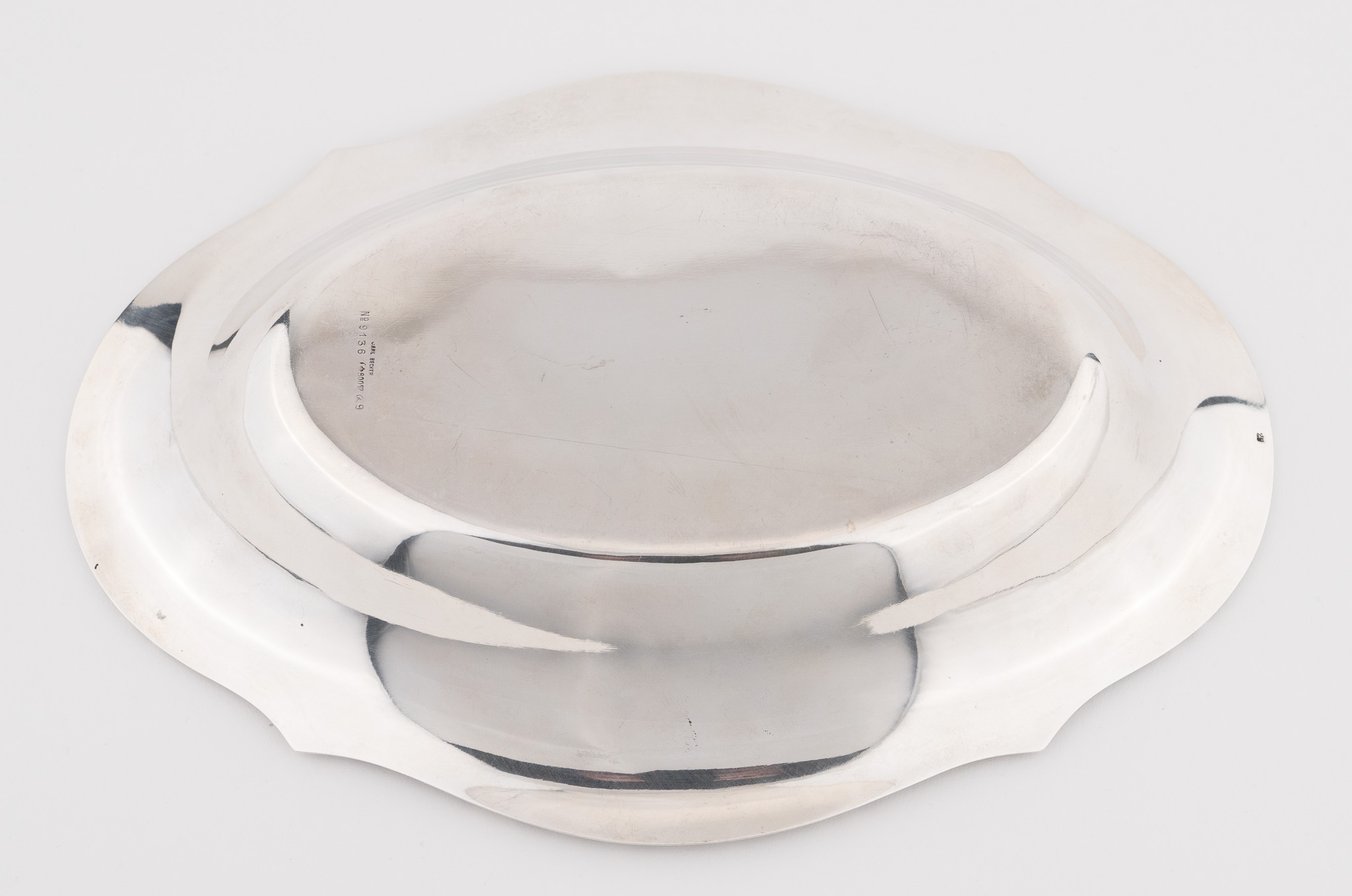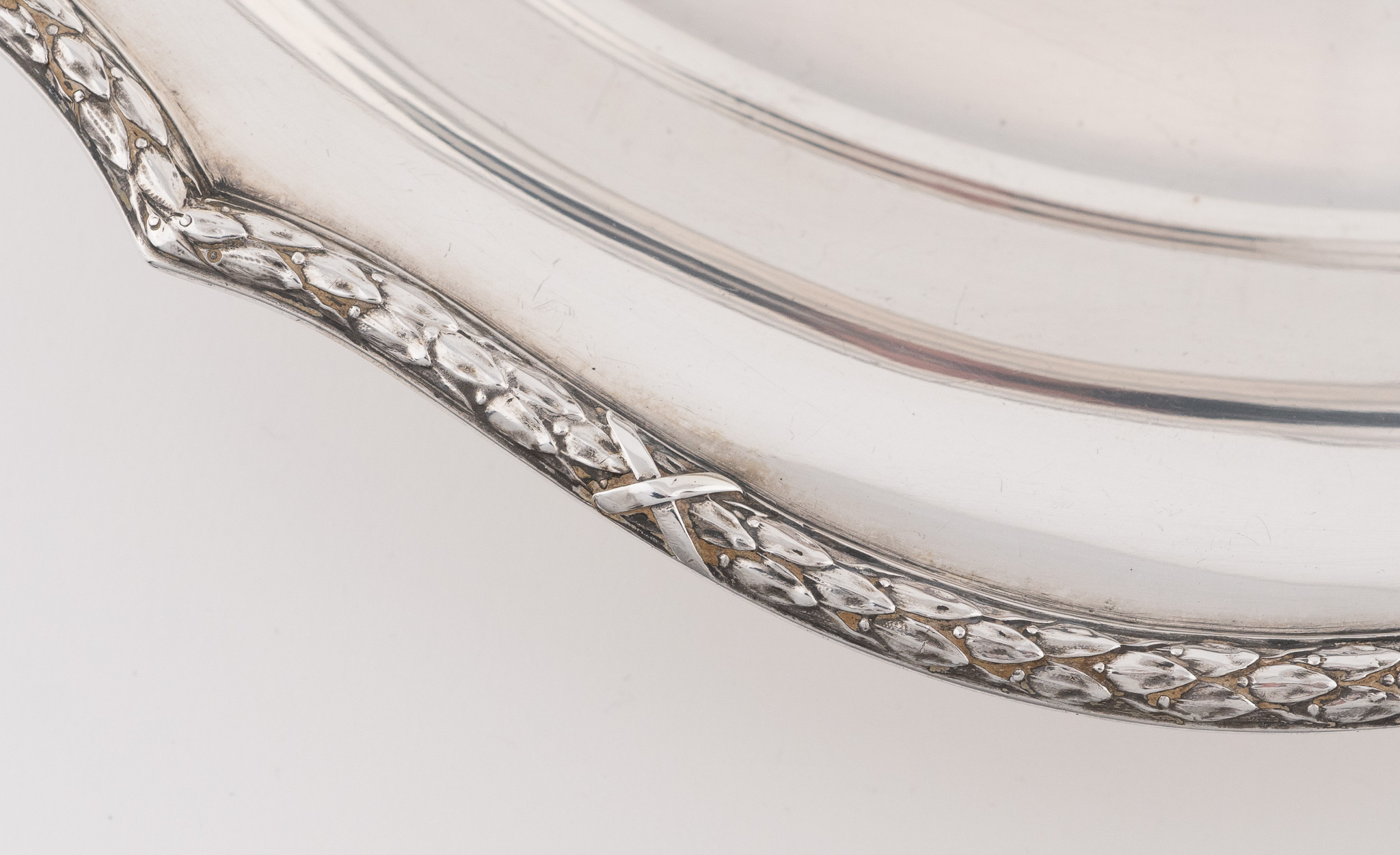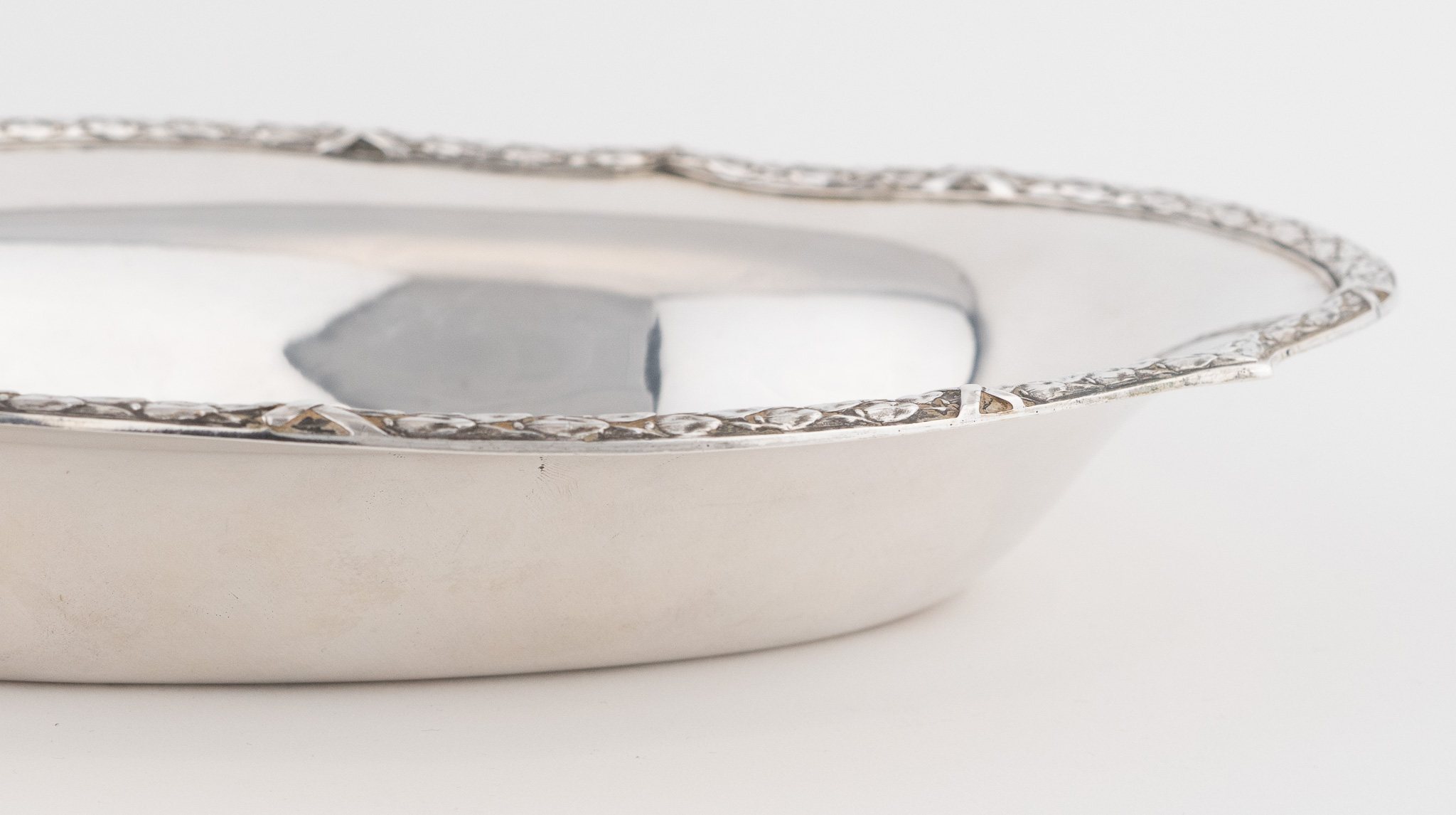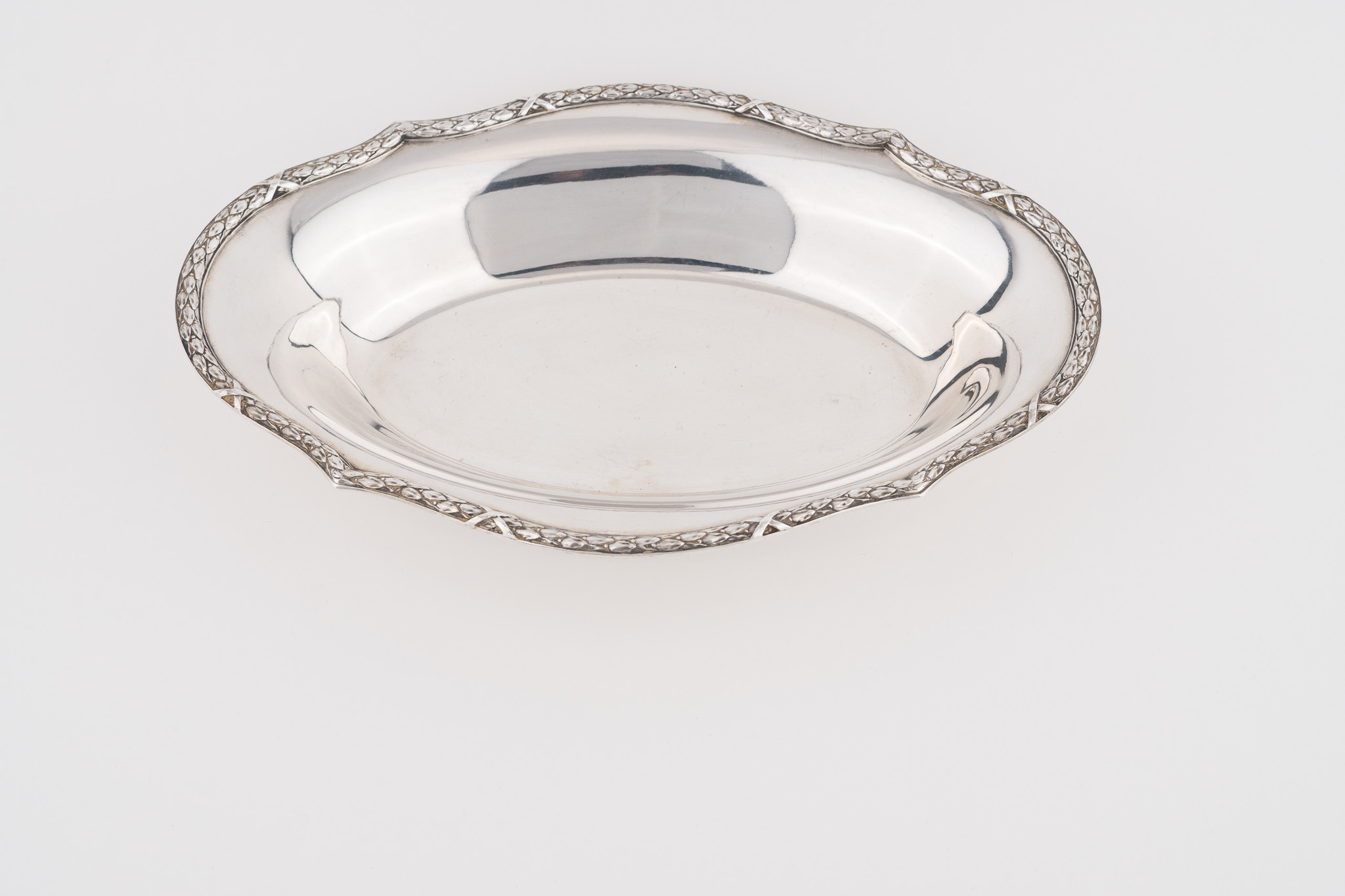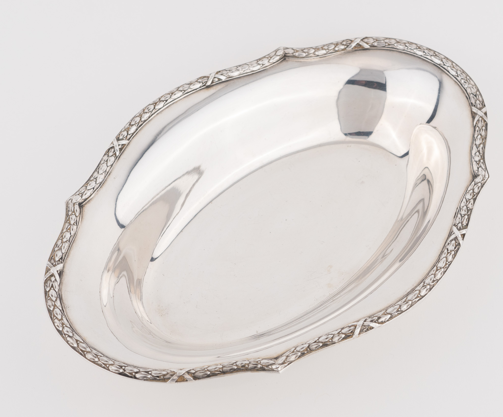 Eine elegante ovale Brotschale gearbeitet in 800er Silber mit mit umlaufend Lorbeer und Kreuzbanddekor.