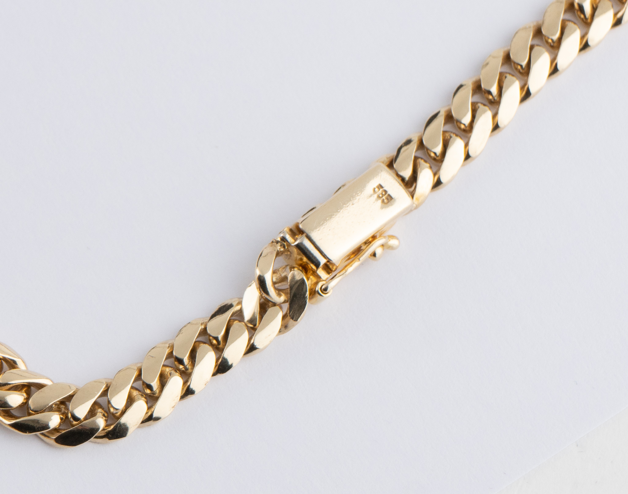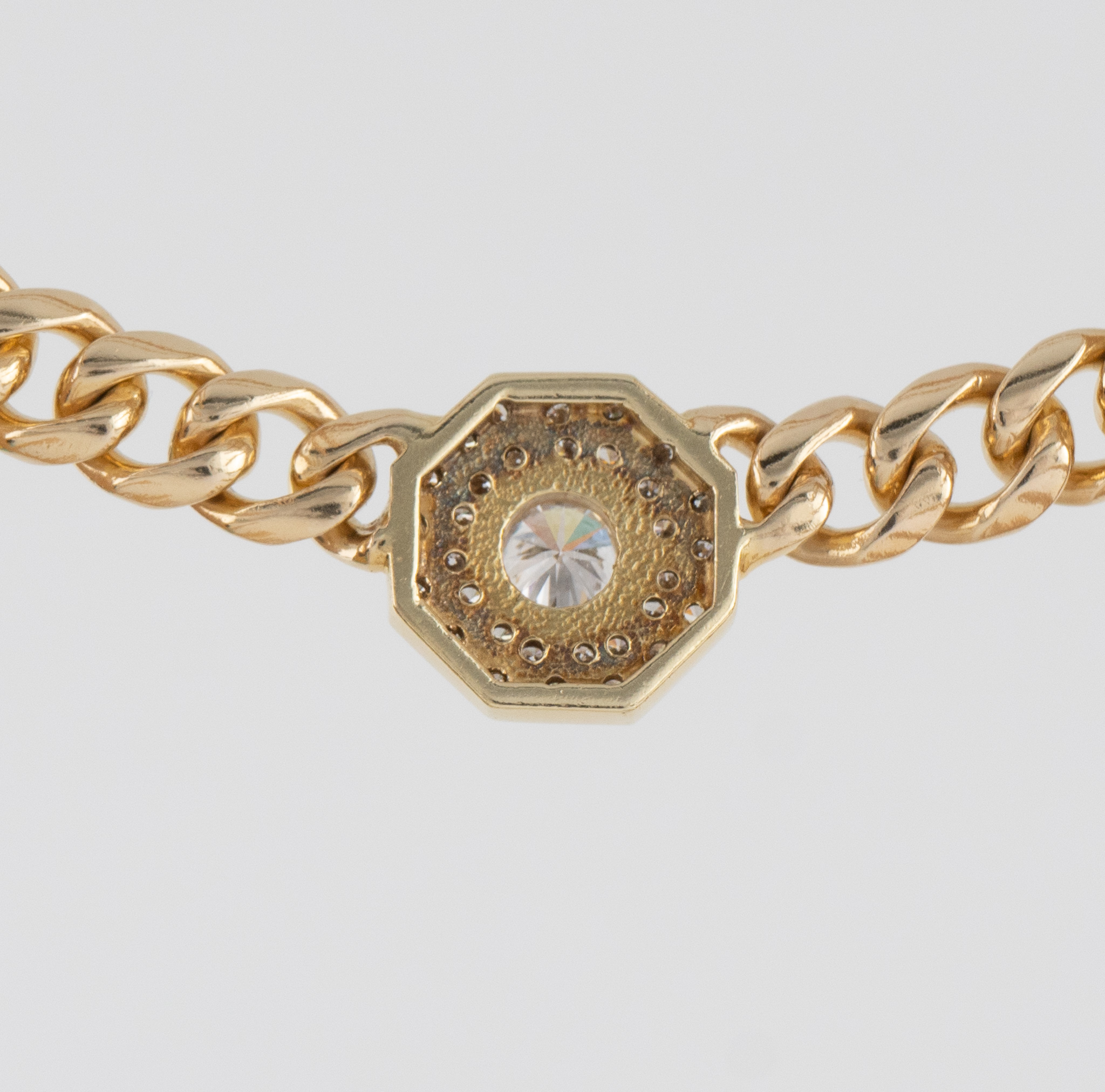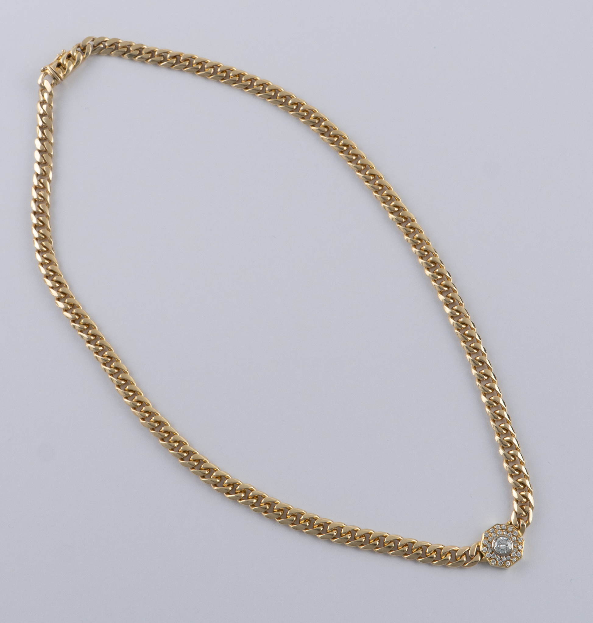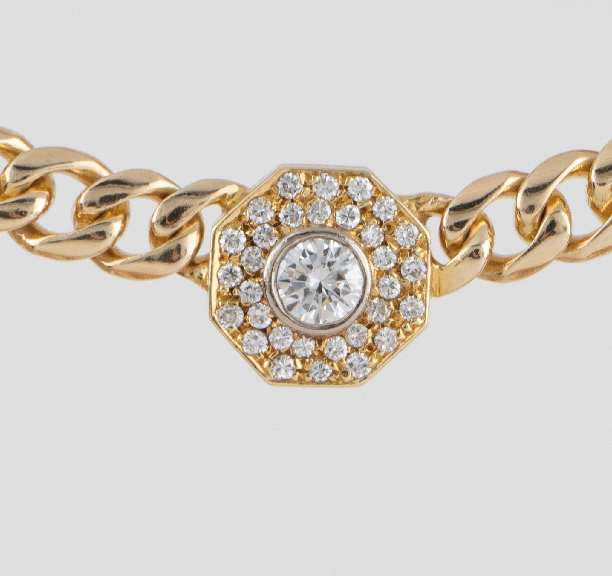 Ein massives Collier gearbeitet in 14 Karat Gelbgold (585/1000), Flachpanzerband mittig mit einem oktogonal gefassten Brilliant von 0,35 ct, hoher Farb- und Reinheitsgrad , begleitet von 31 Diamanten von zusammen ca. 0,45 ct.