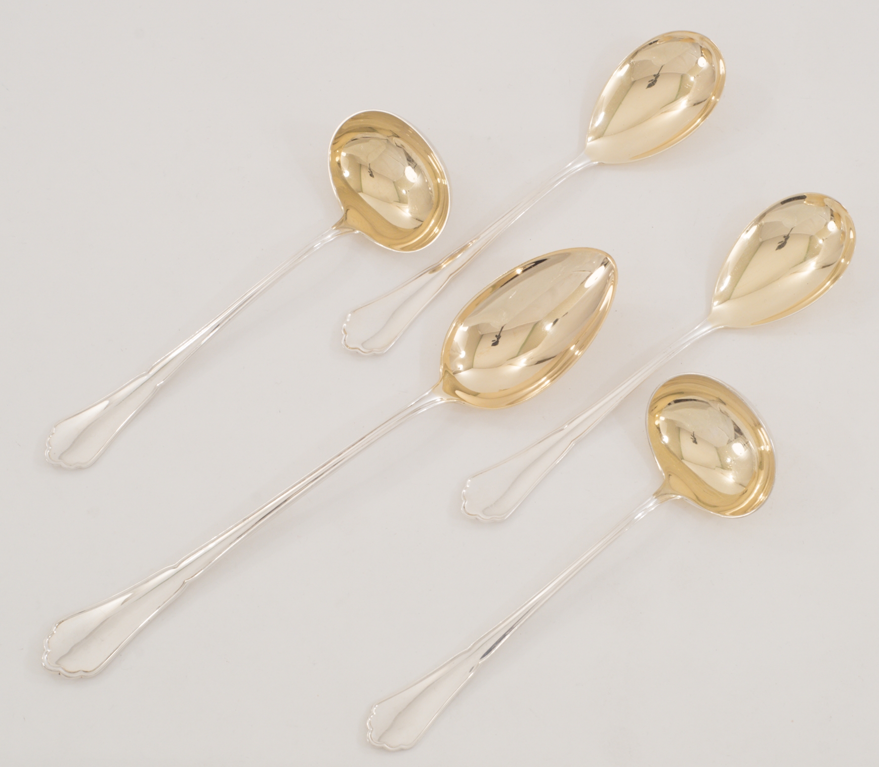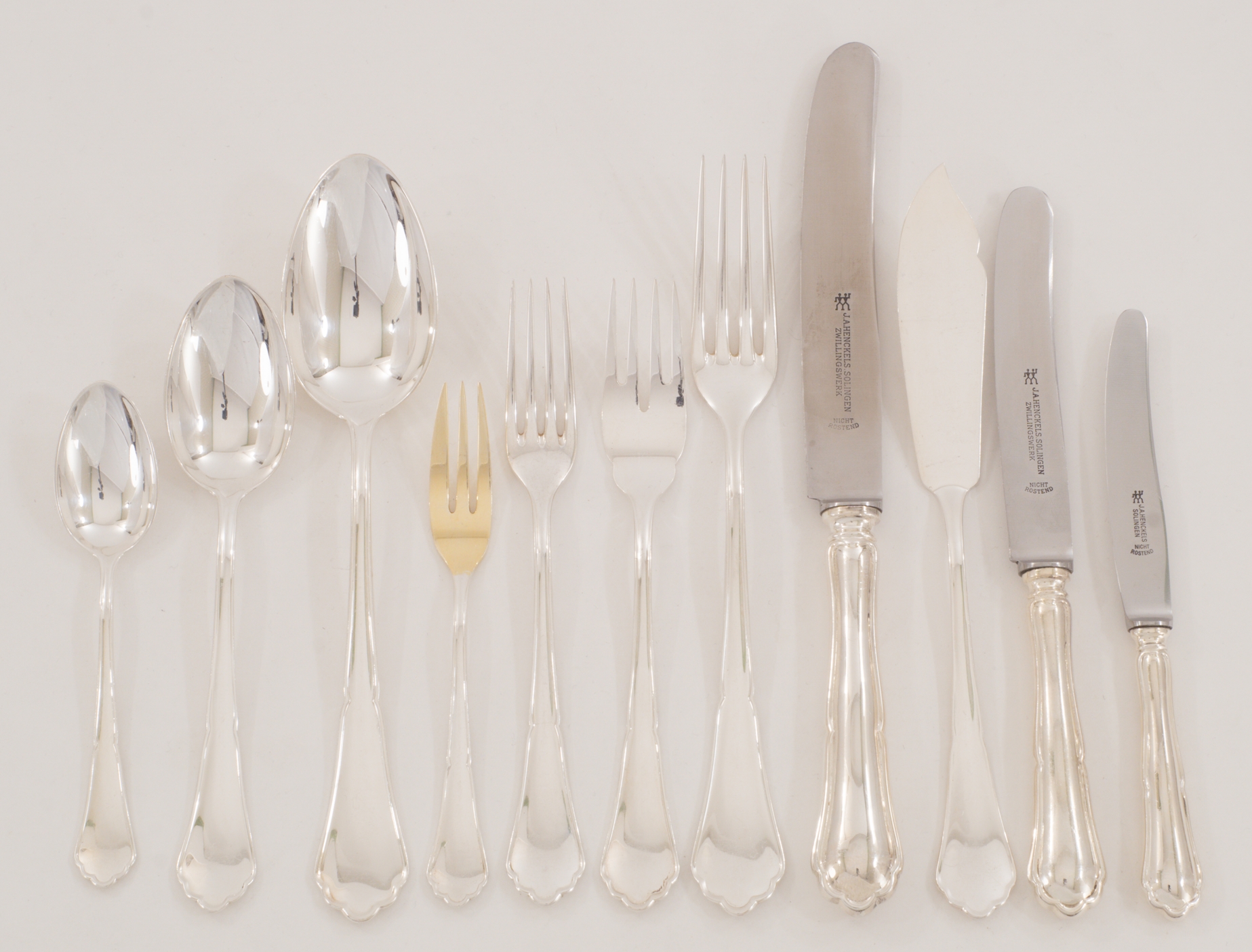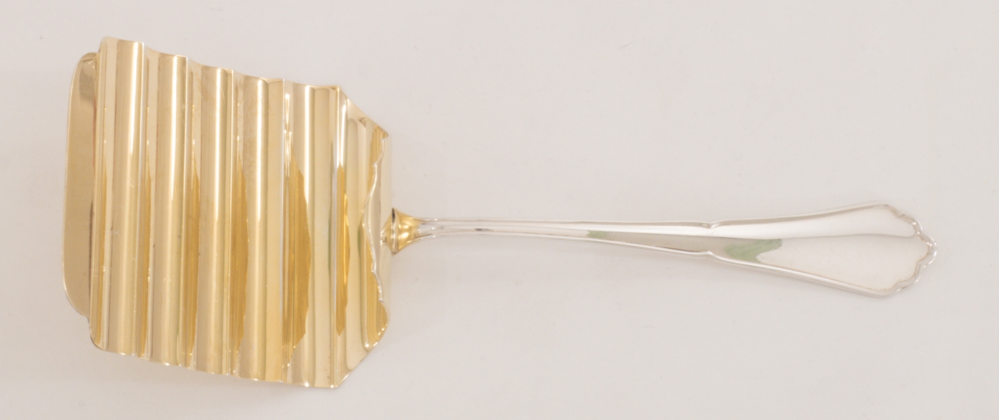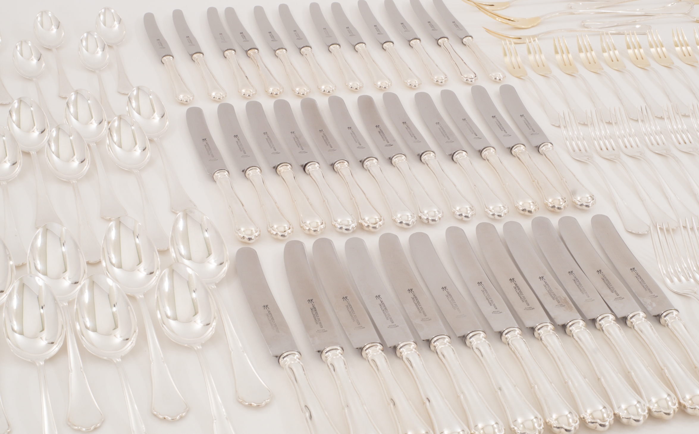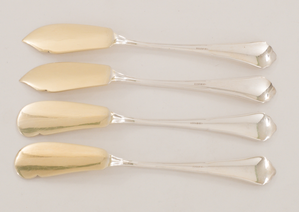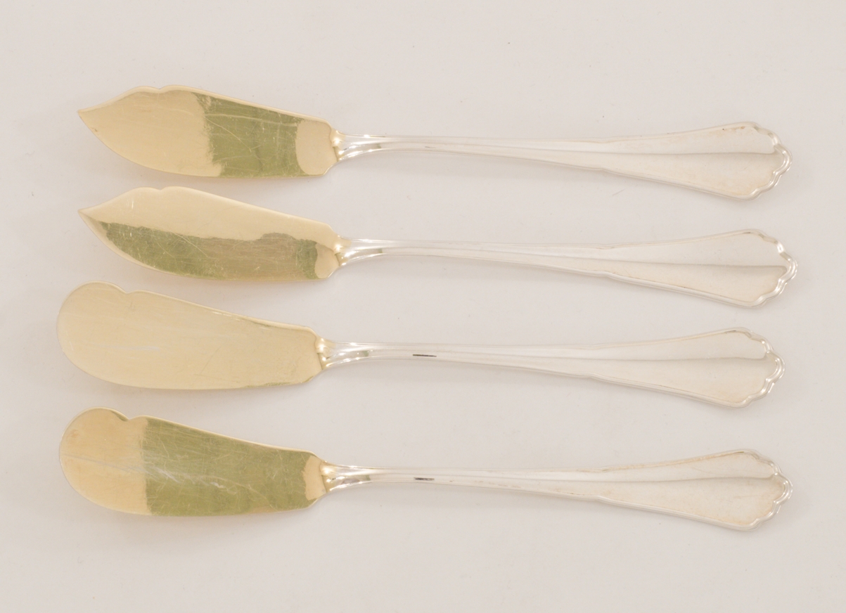 Ein extensives 158-teiliges Silberbesteck für 12 Personen gearbeitet in 800 Silber, Modell Chippendale von den Bremer Silberwarenfabriken. Teilweise vergoldete Laffen und Zinken.