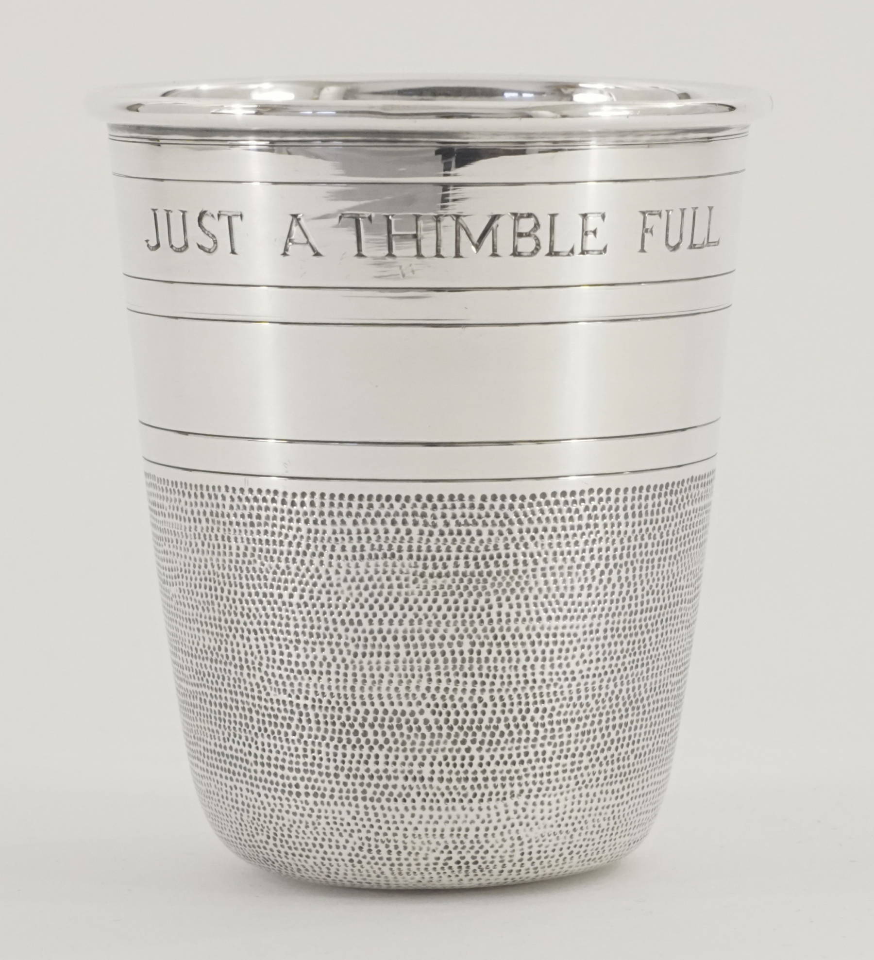 Ein amüsanter Silberbecher in Form eines Fingerhutes – umlaufend die Gravur „Just a Thimble full“ („nur ein Fingerhut voll“).