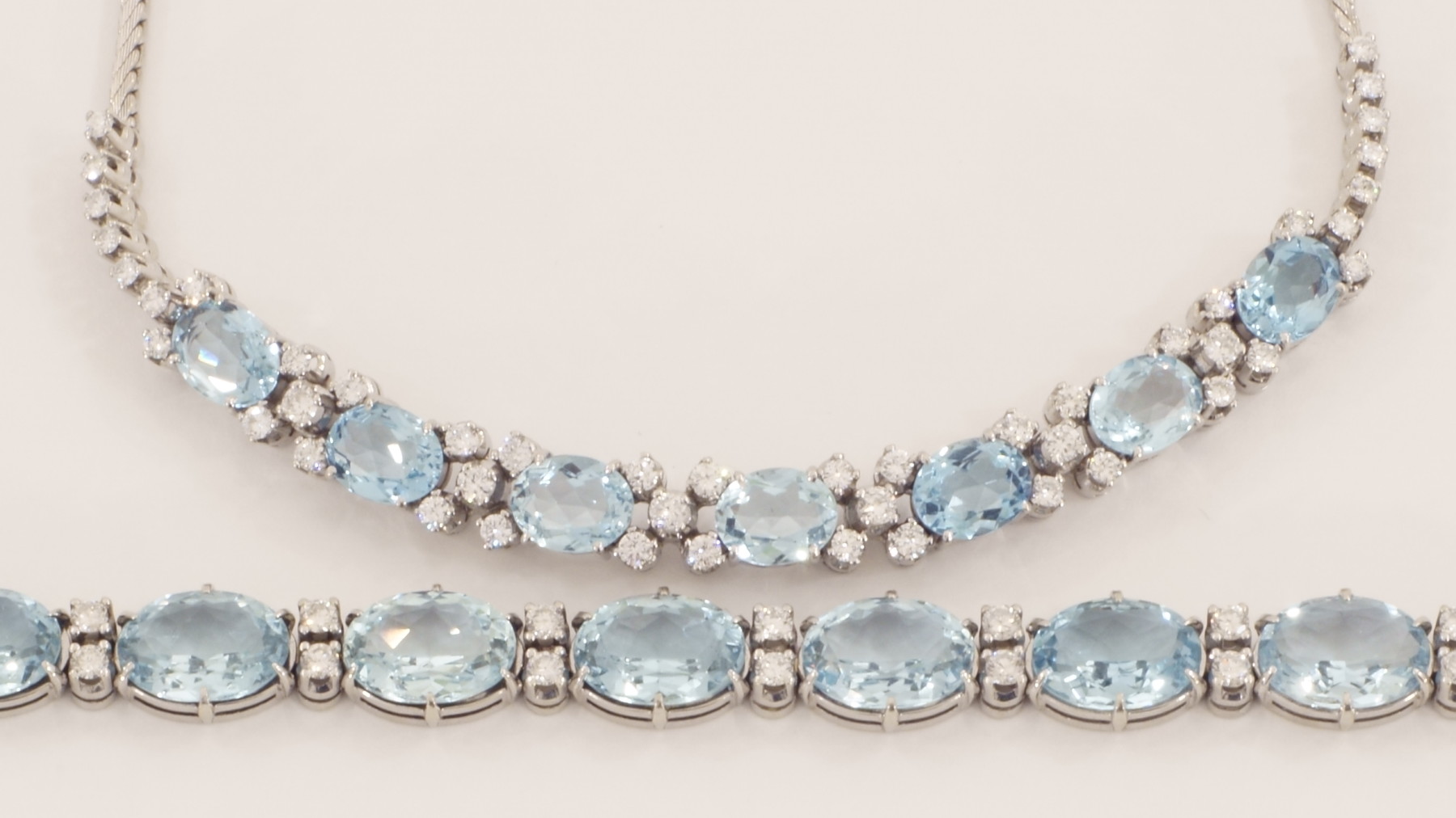Collier und Armband gearbeitet in 18 Karat Weißgold ausgefasst mit 19 Aquamarinen zusammen ca. 30 ct. und 70 Diamant Brillanten zusammen ca. 3,5 ct.
