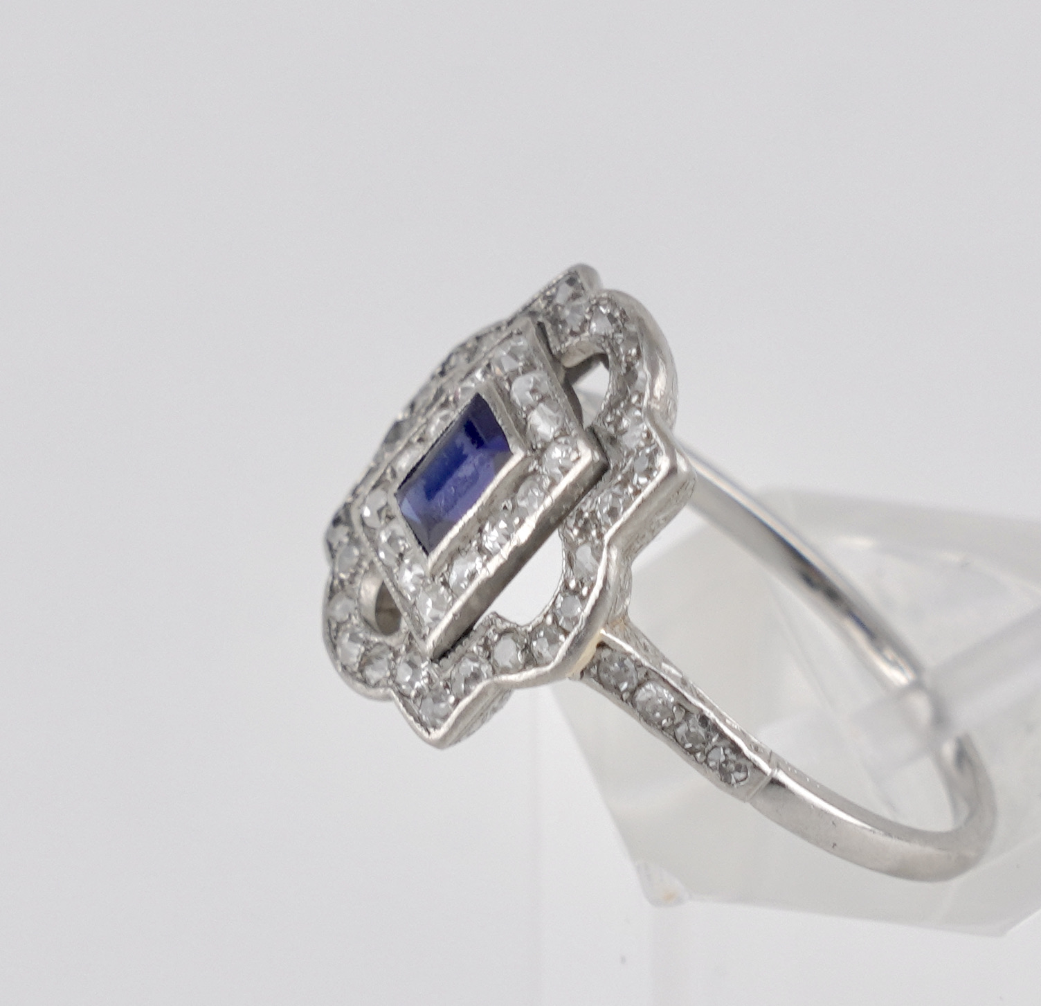 Ein geschwungener druchbrochen gearbeiteter Art déco Ring in PlatinMittig ein Saphir von ca. 0,2 ct im Treppenschliff umrahmt und vierzig Diamanten von zusammen ca. 0,6 ct. – Feine Qualität.