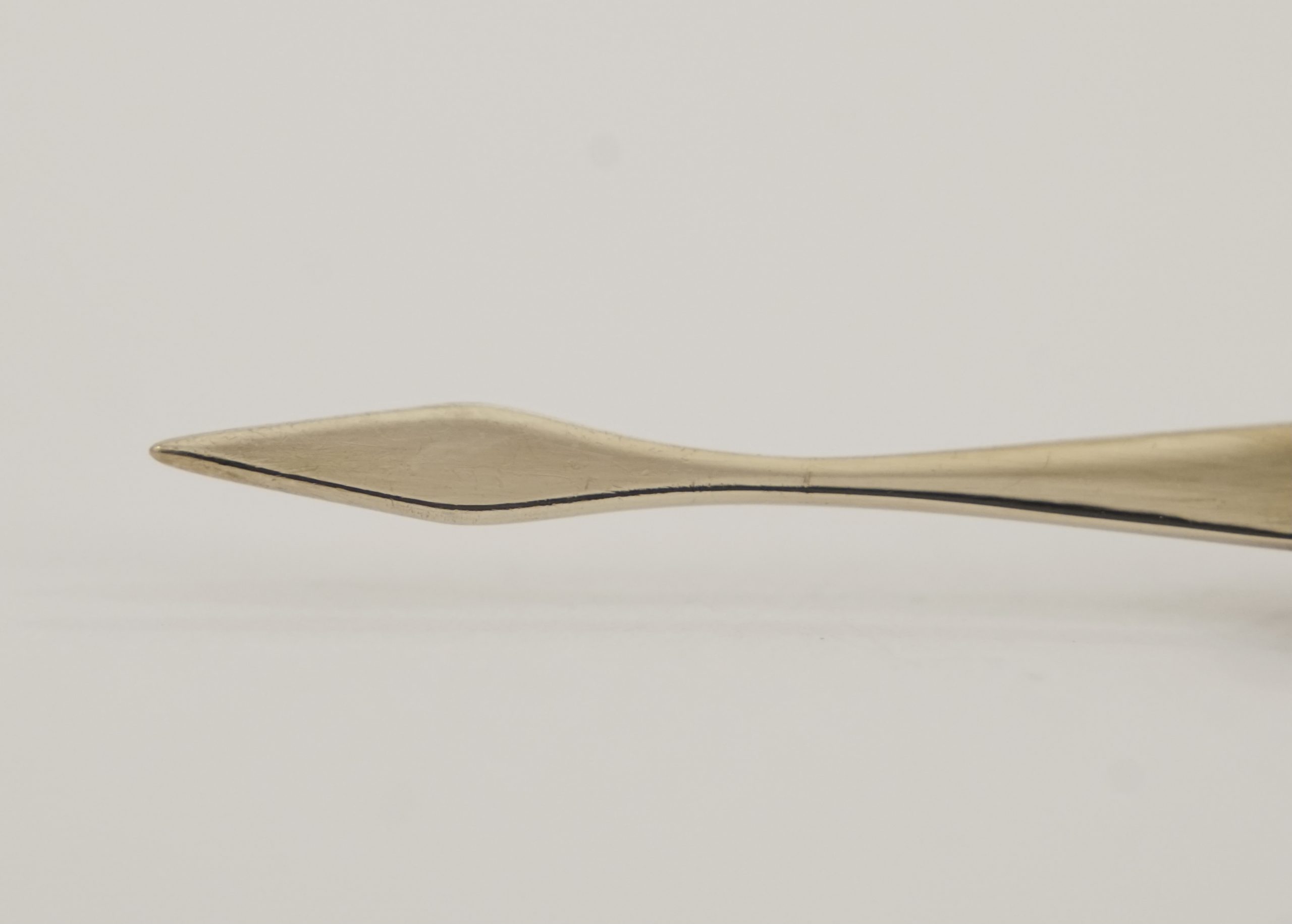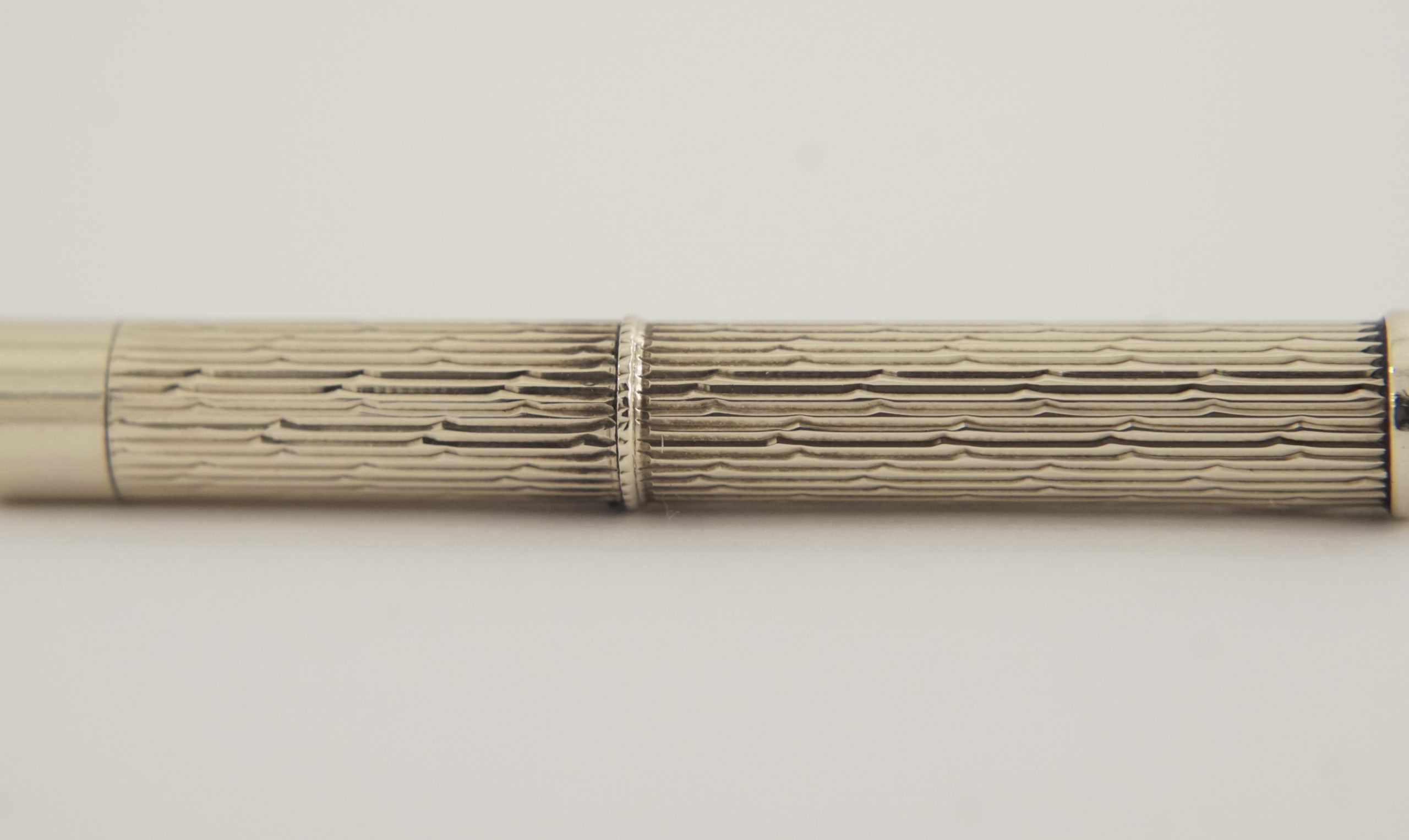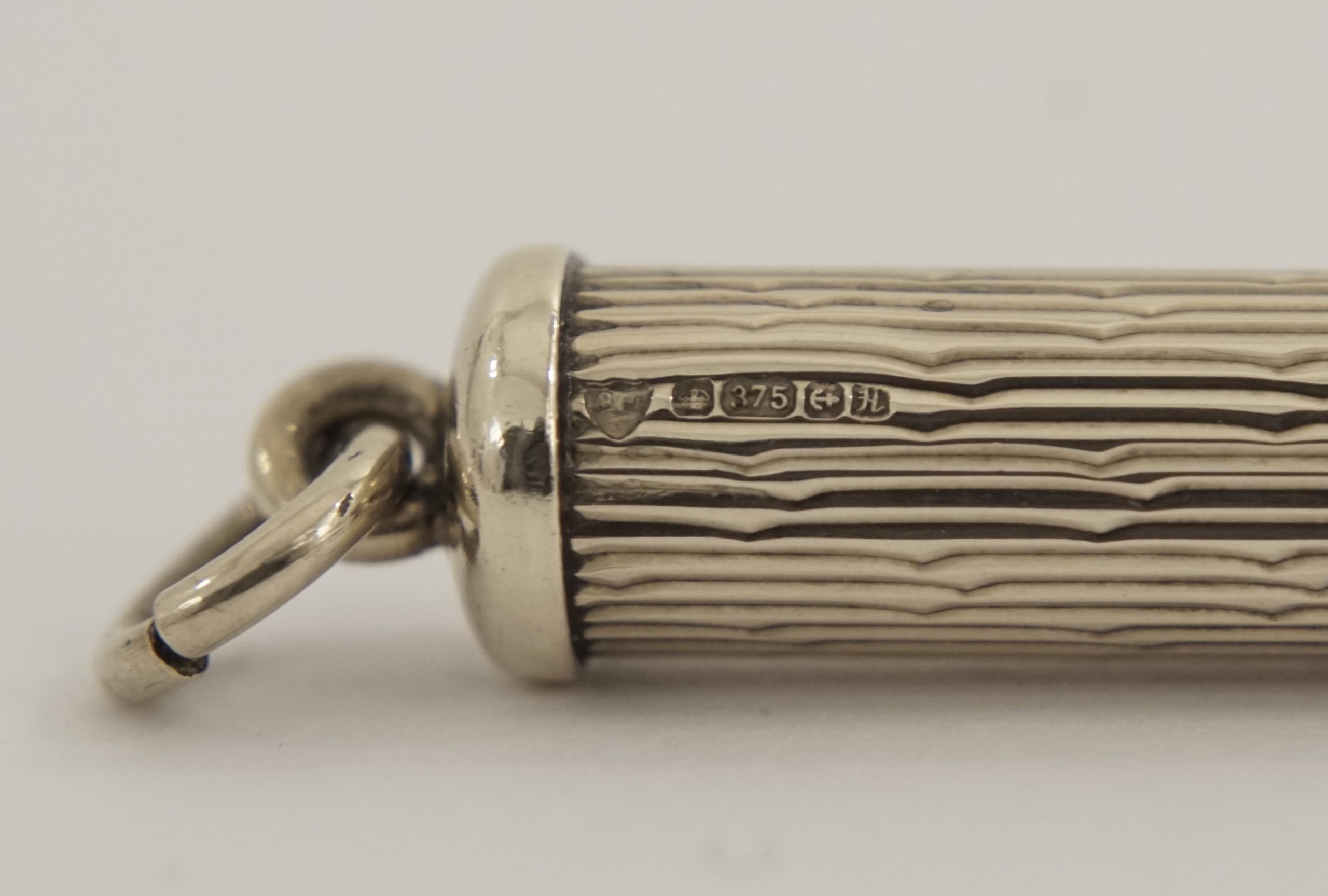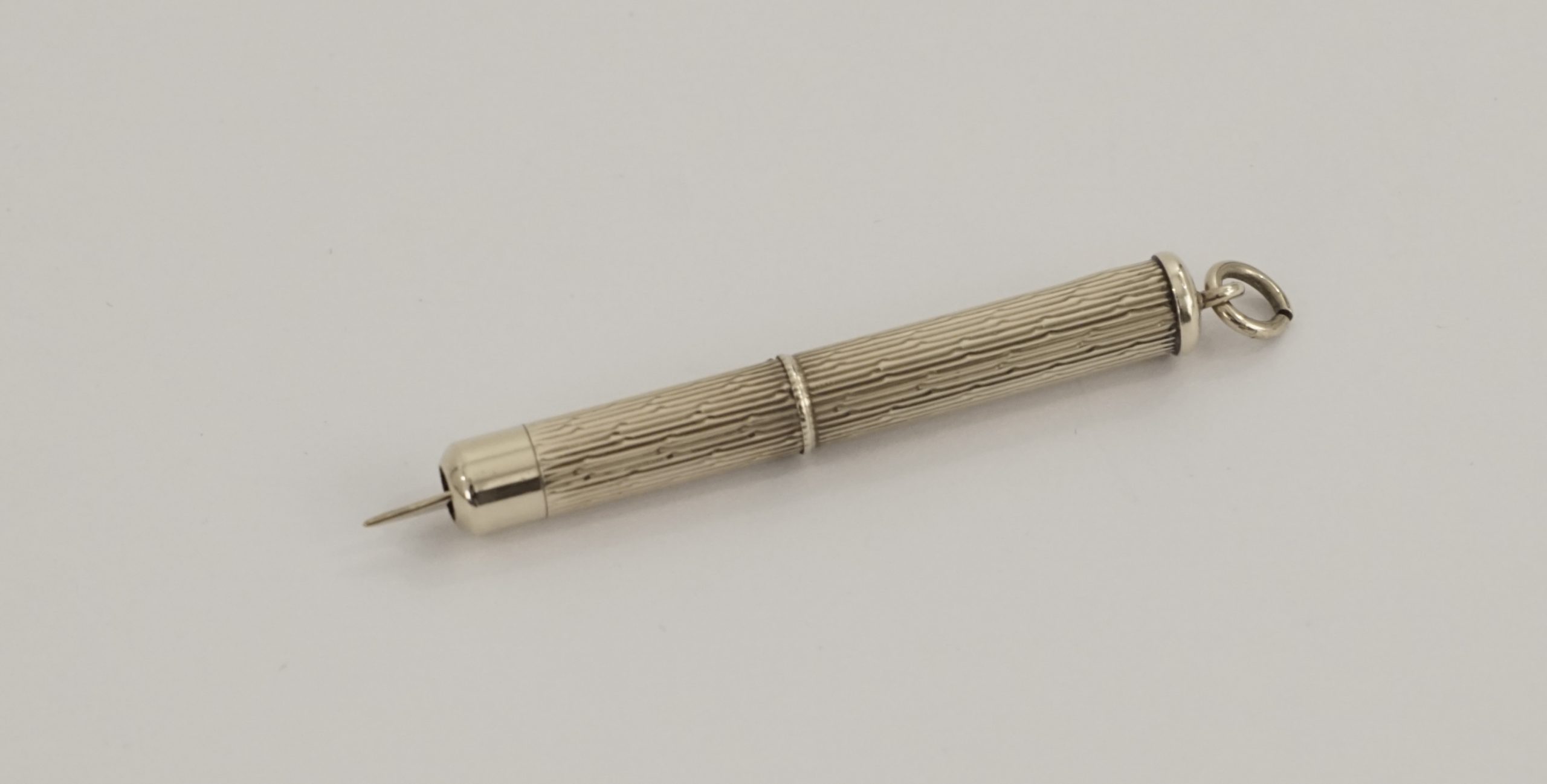 Für Liebhaber dekadenter Objekte. Stabförmiger Korpus, geriffelte Wandung. Der untere Teil drehbar wodurch der Zahnstocher ausgefahren wird.