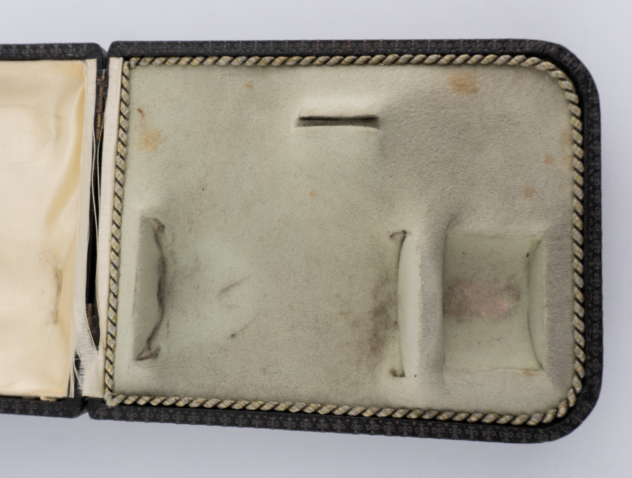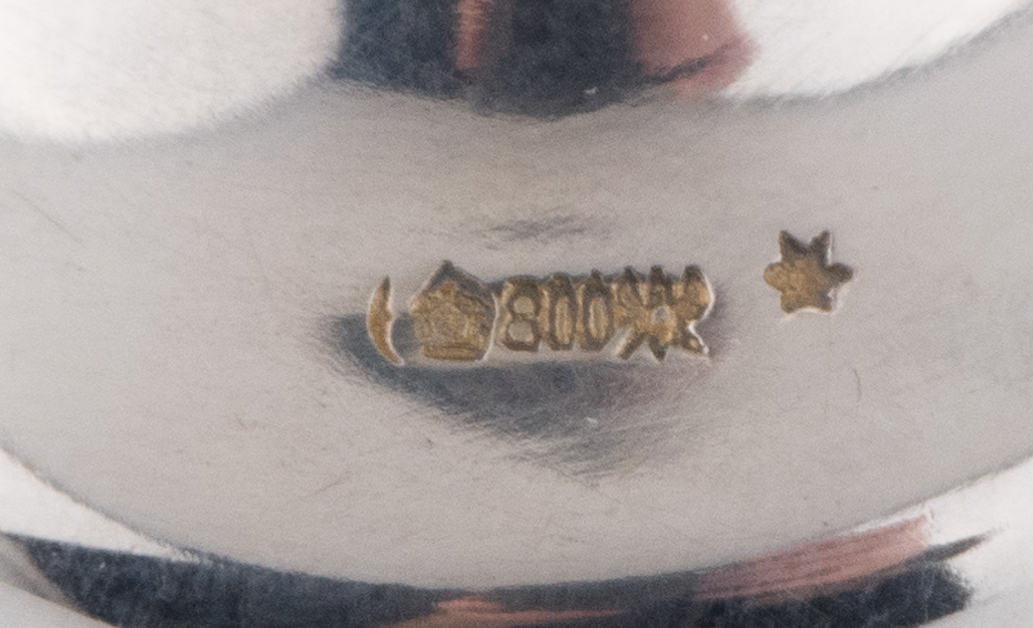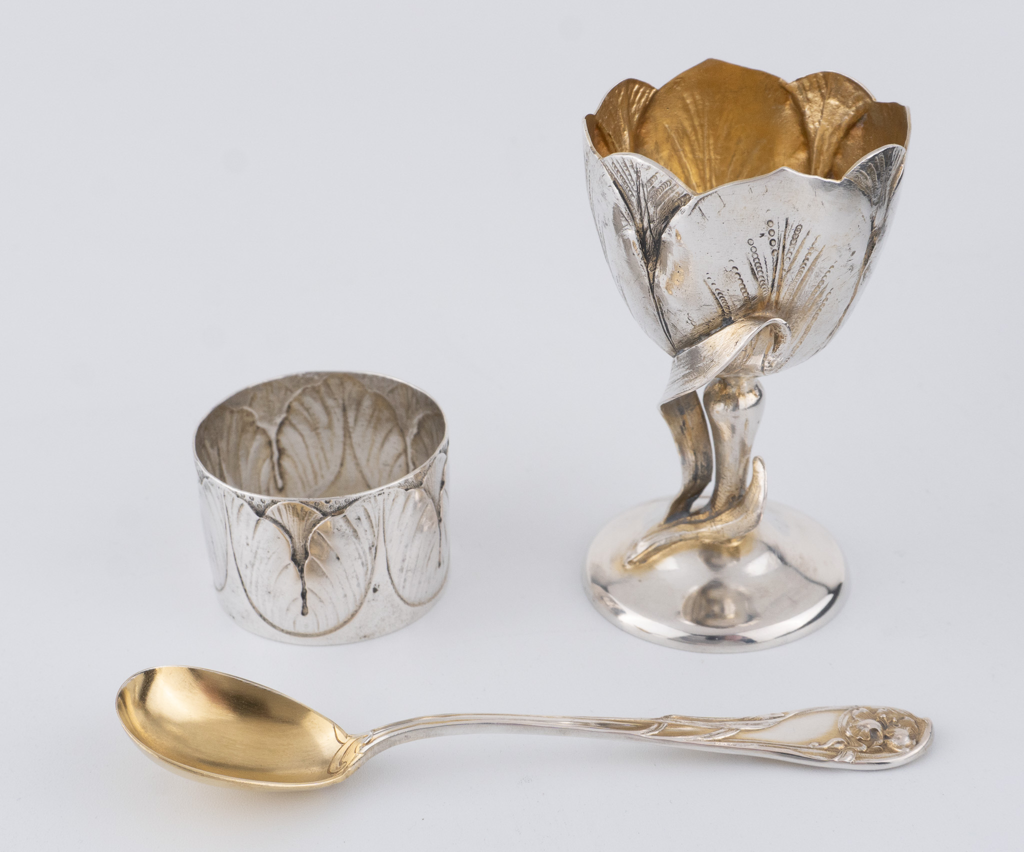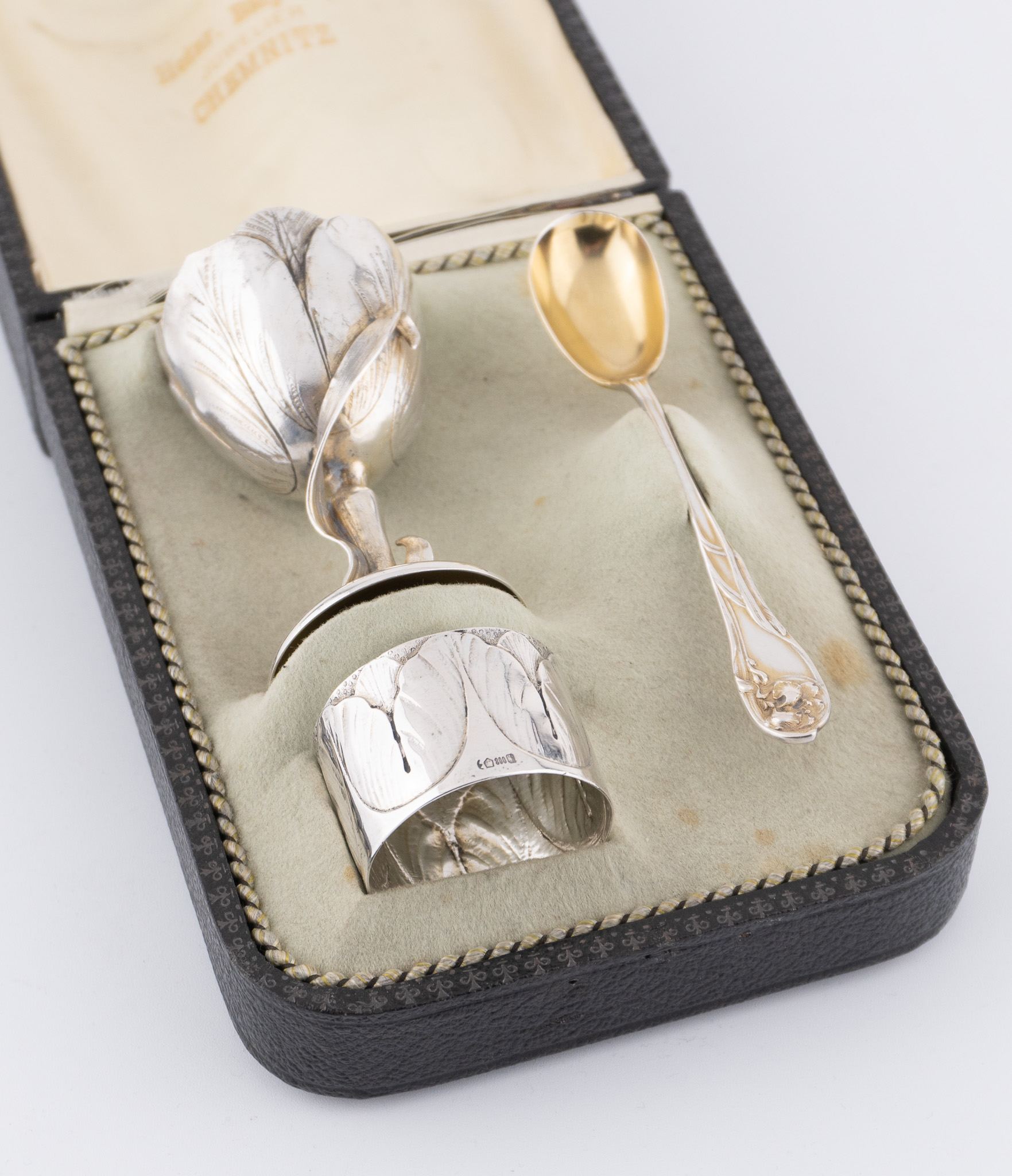 Ein außergewöhnliches Jugendstil-Taufset in 800er Silber. Set bestehend aus einem Eierbecher, einem Eierlöffel und einem Serviettenring im originalen Etui.