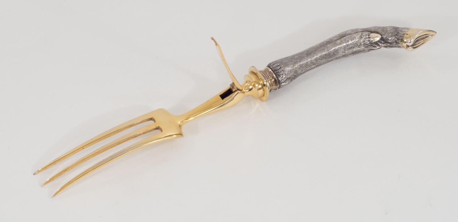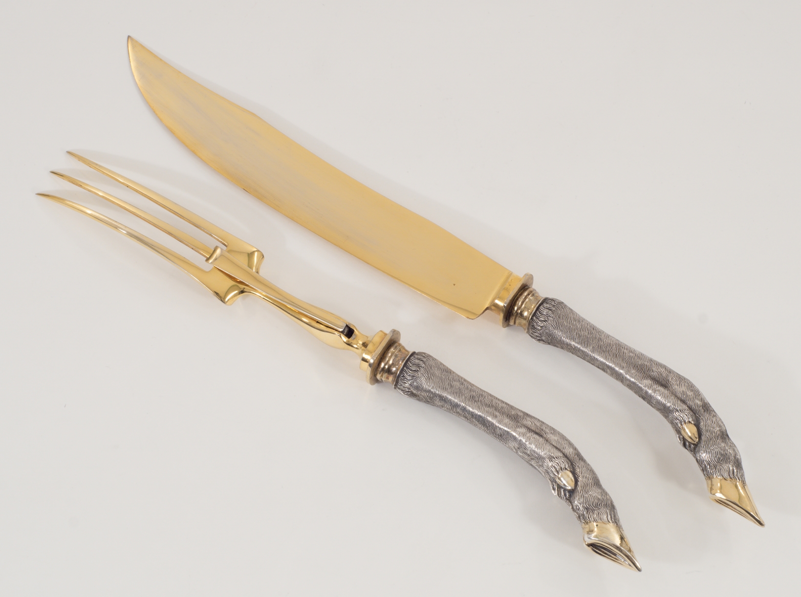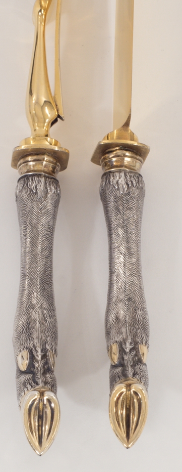 Ein Jagd-Tranchierbesteck mit naturalistisch nachgebildeten Rehfüßen in 800 Silber gearbeitet und teilvergoldet.