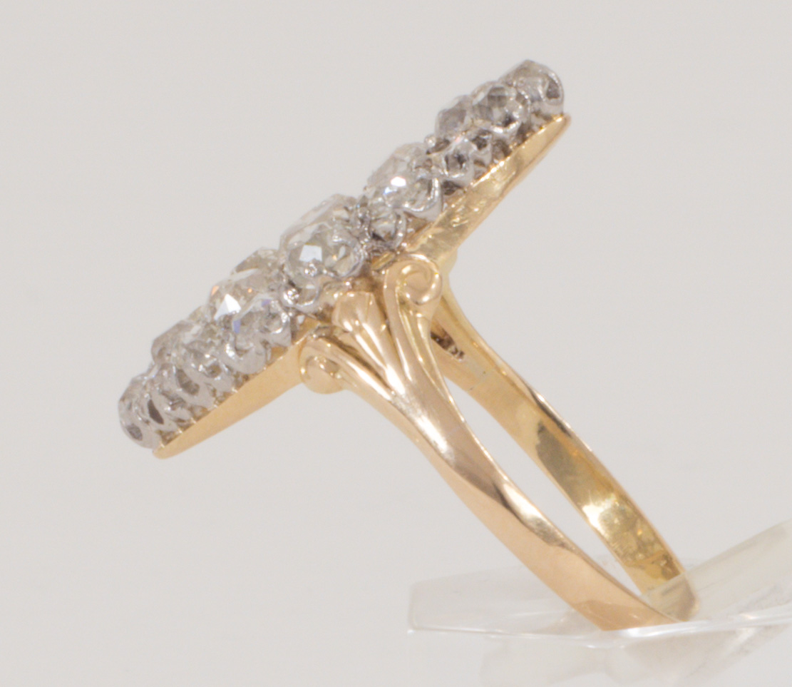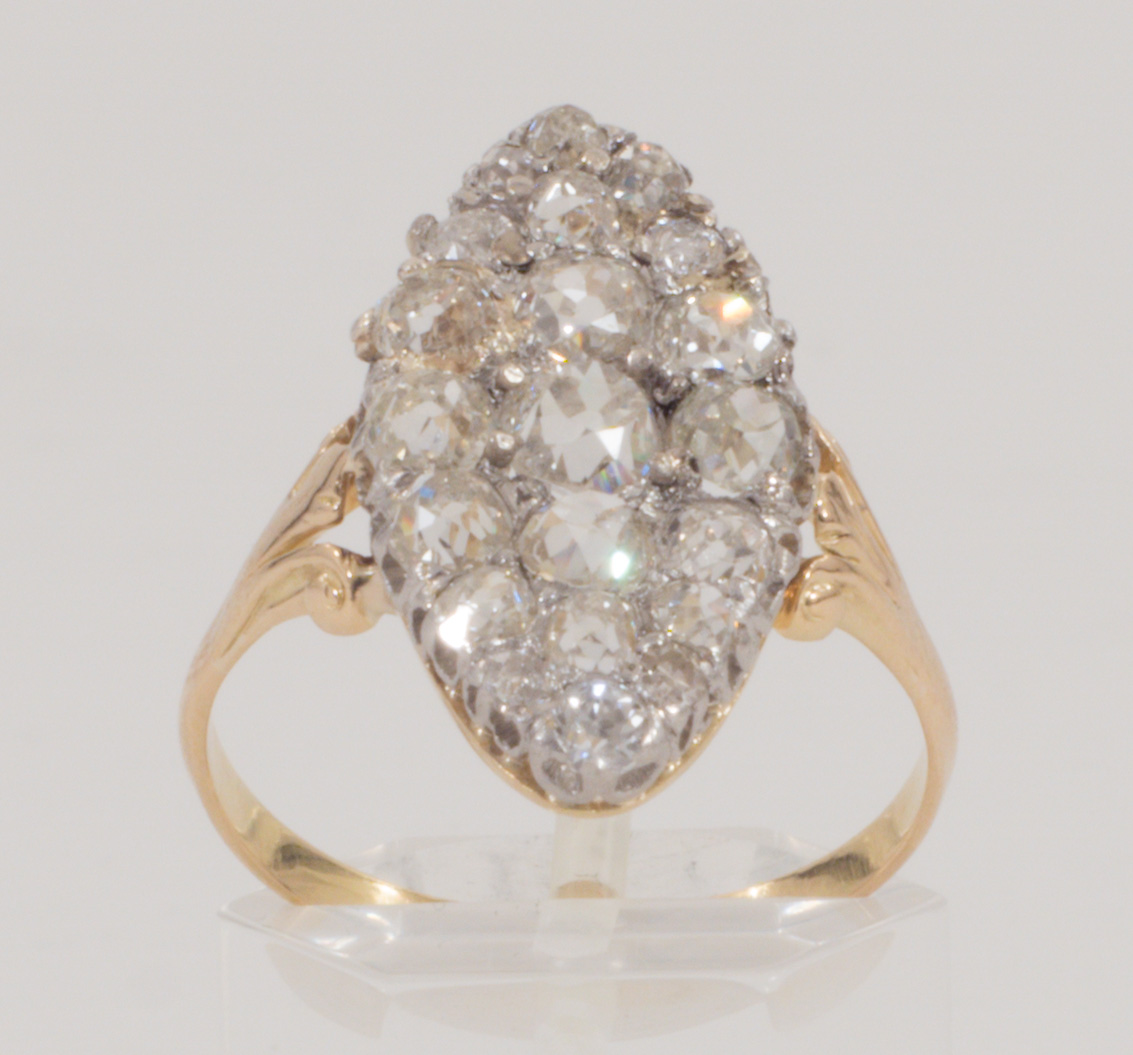 Ein beeindruckender Marquise Ring mit 20 Altschliff-Diamanten von zusammen ca. 3 ct. gefasst in 18 Karat (750) Gelbgold. Ein Diamant im modernen Schliff ergänzt.