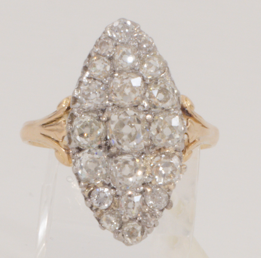 An impressive marquise ring with 20 old cut diamonds