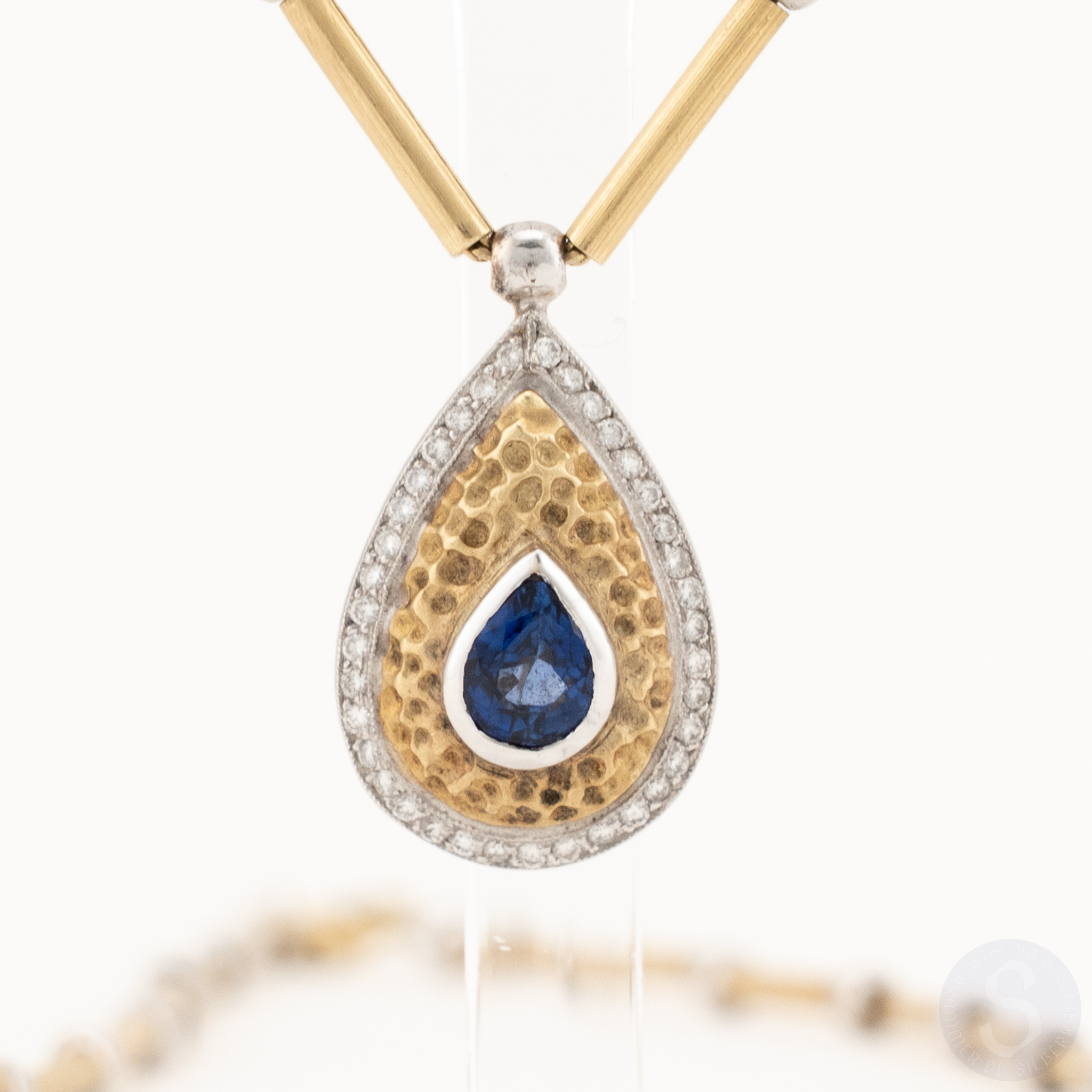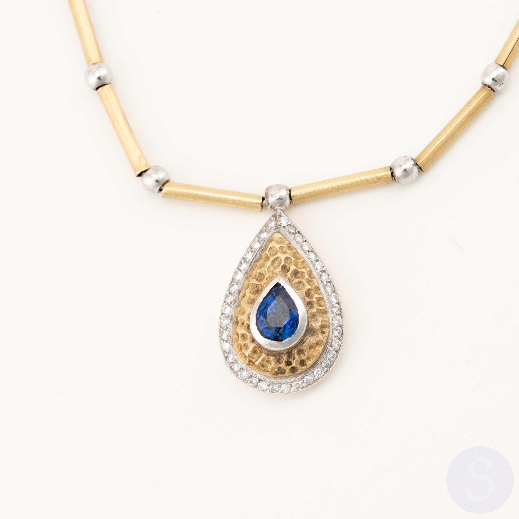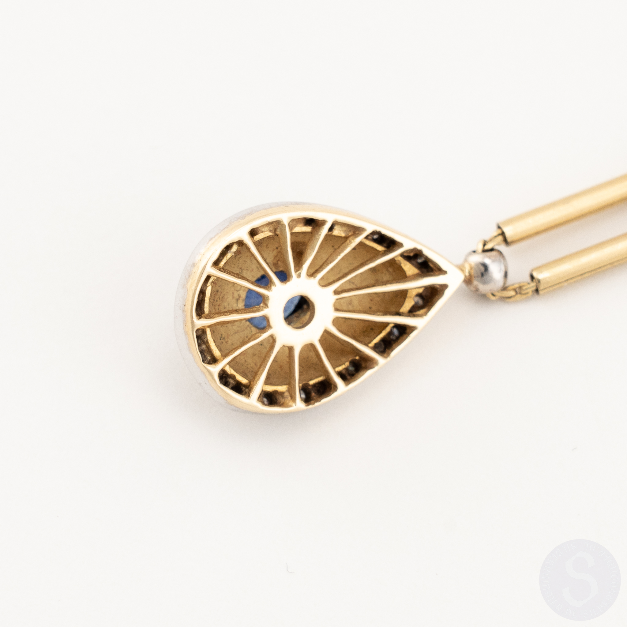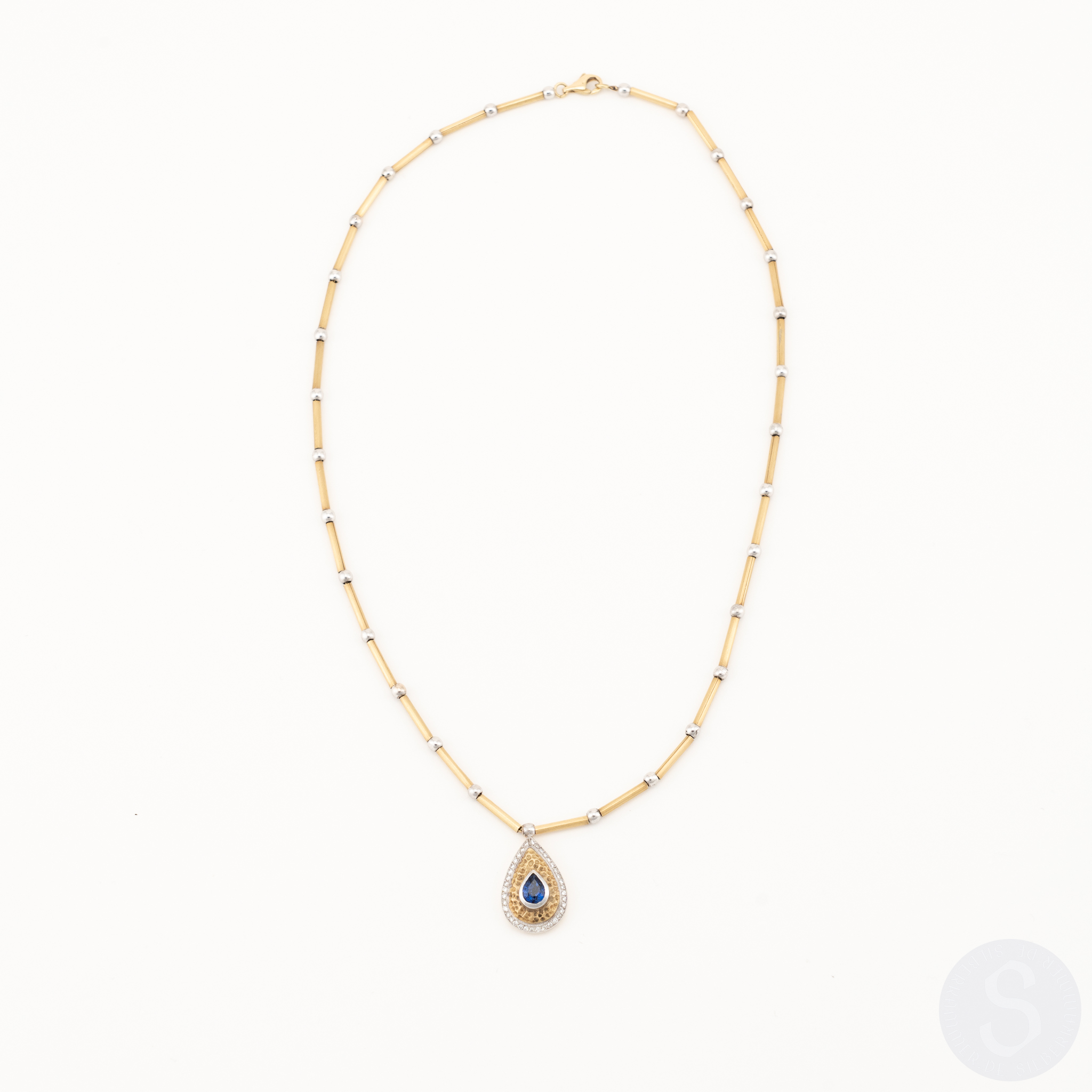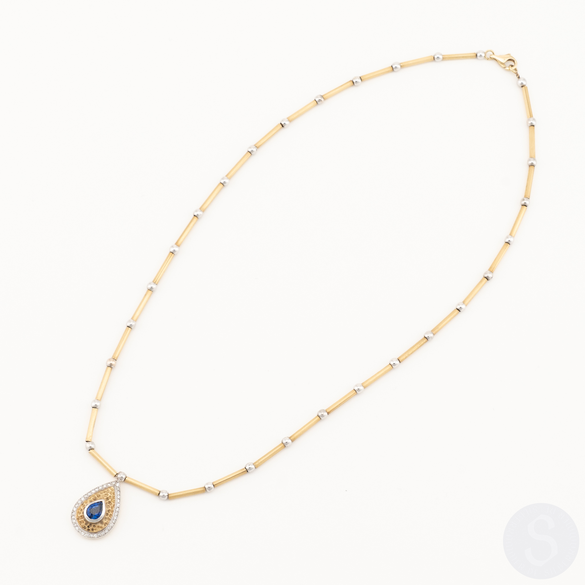 Ein Collier in 18 Karat (750/1000) Gelbgold und Weißgold mit einem tropenförmigen Anhänger mit einem blauen Spinell und 36 kleinen Diamanten.