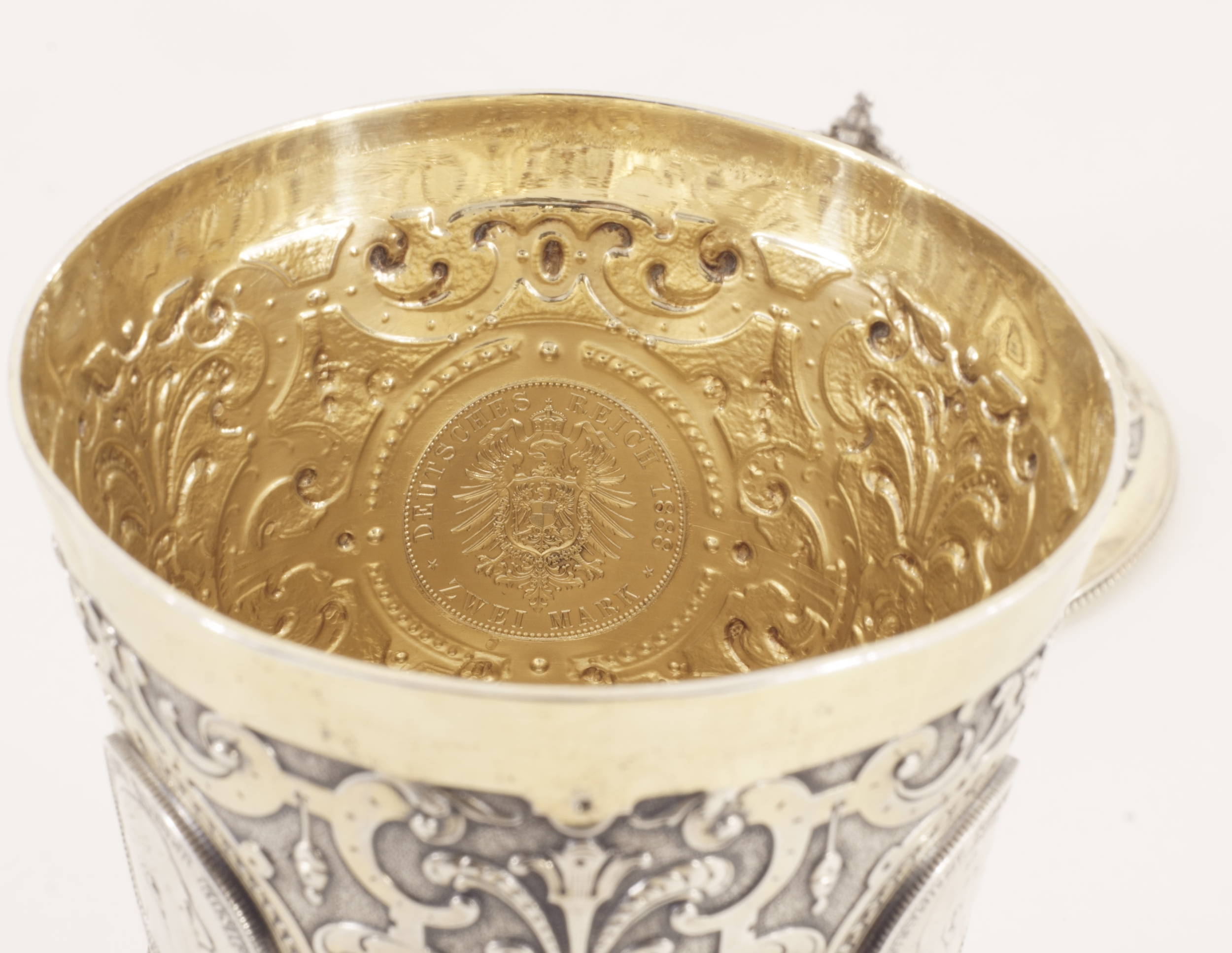 Ein Deckelbecher zum Dreikaiserjahr 1888 mit 3 zwei Mark Münzen, je eine Münze mit Kaiser Wilhelm I., Kaiser Friedrich III., Kaiser Wilhelm II.