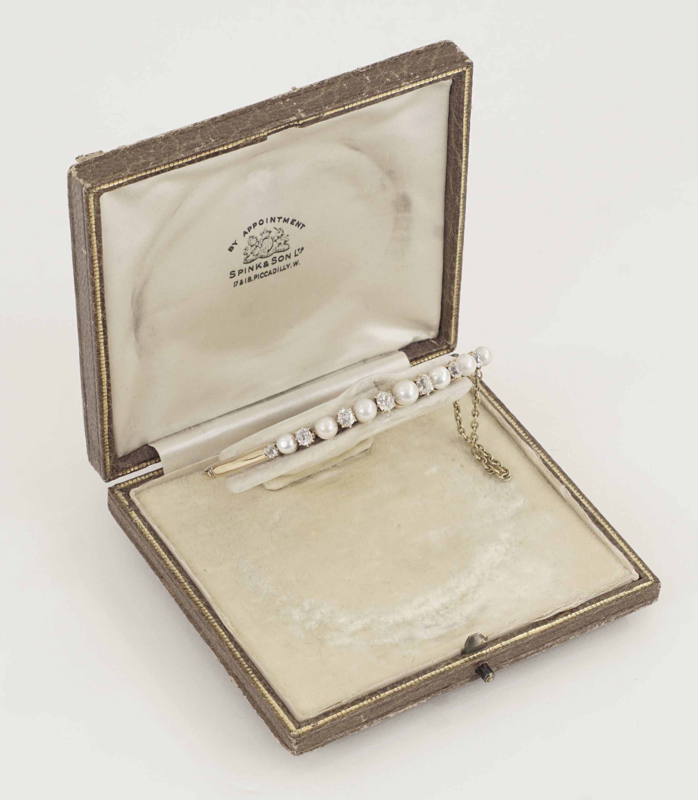 Ein Diamant/Perl Armreif gearbeitet in 14 Karat Roségold mit acht Altschliff-Diamanten im Kissenschliff von zusammen ca. 1 ct. und sieben Orientperlen (?).
