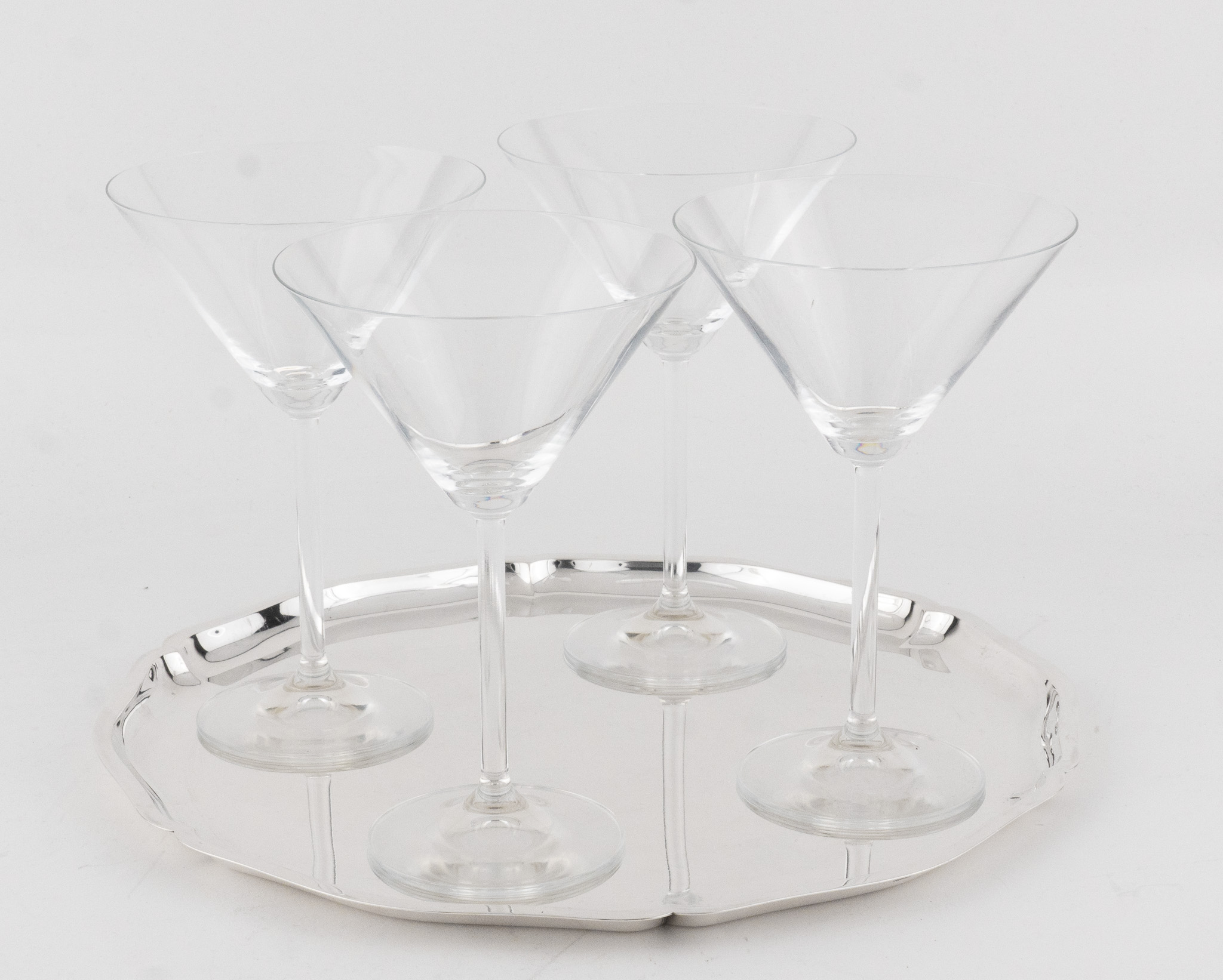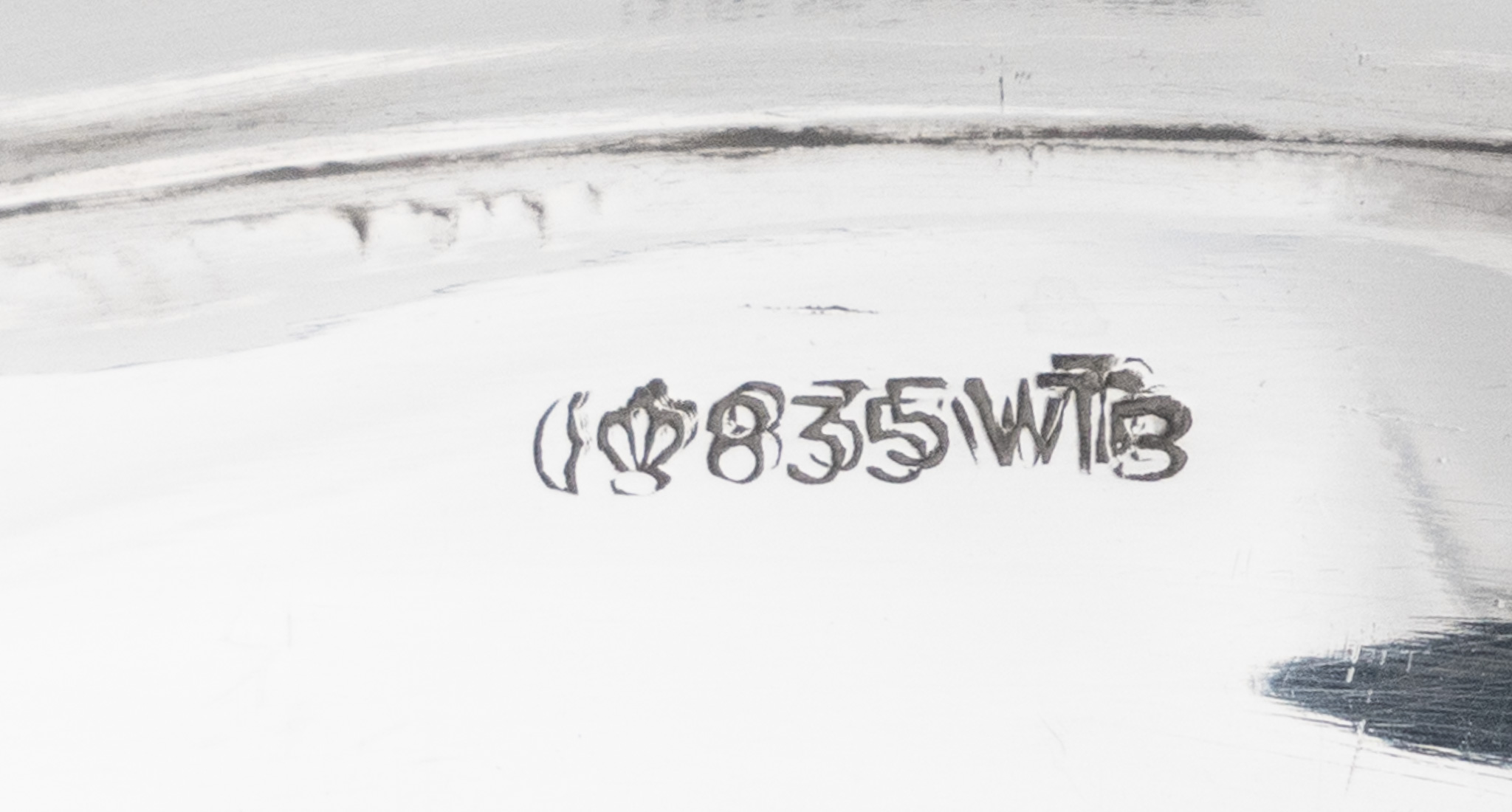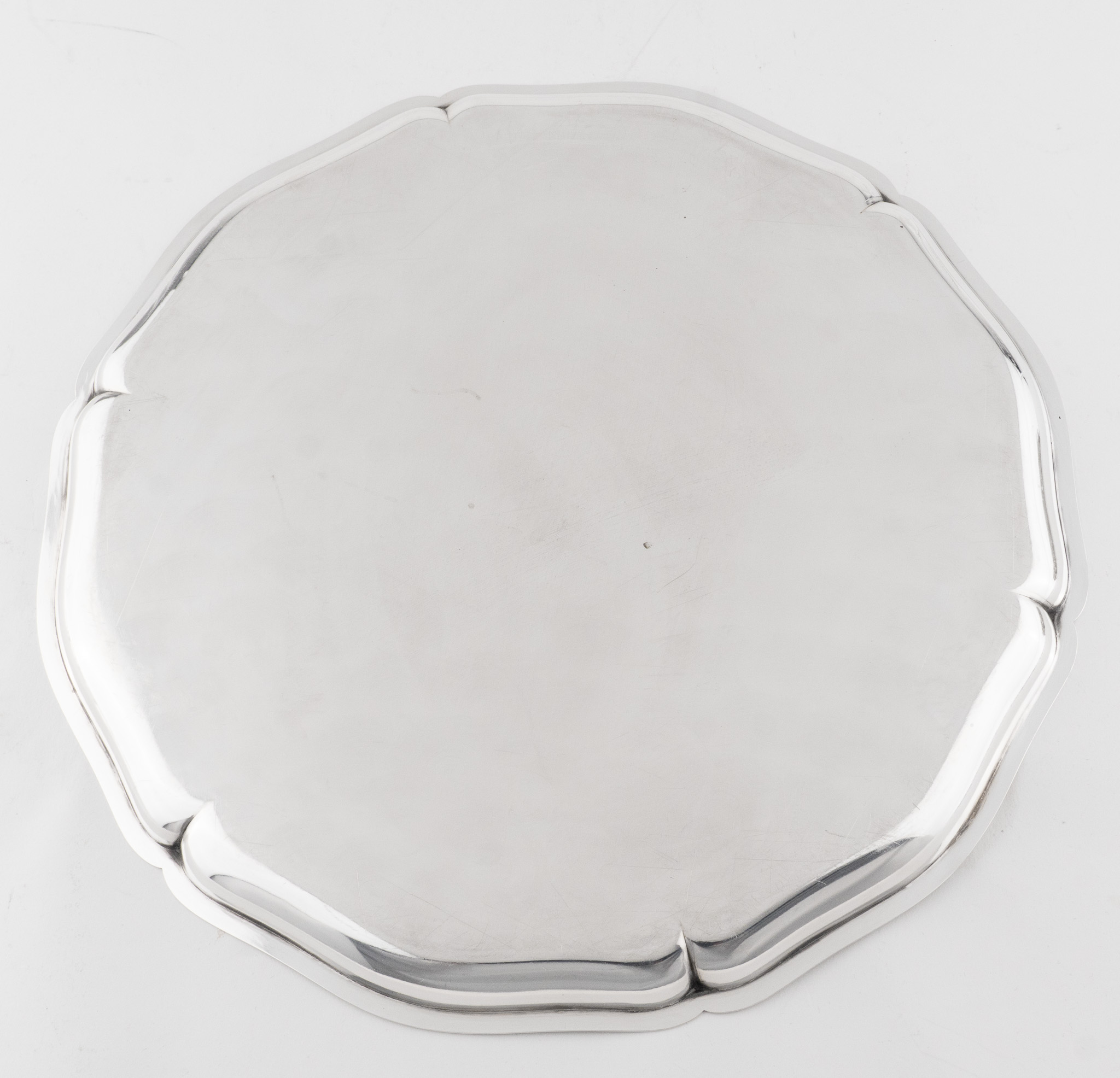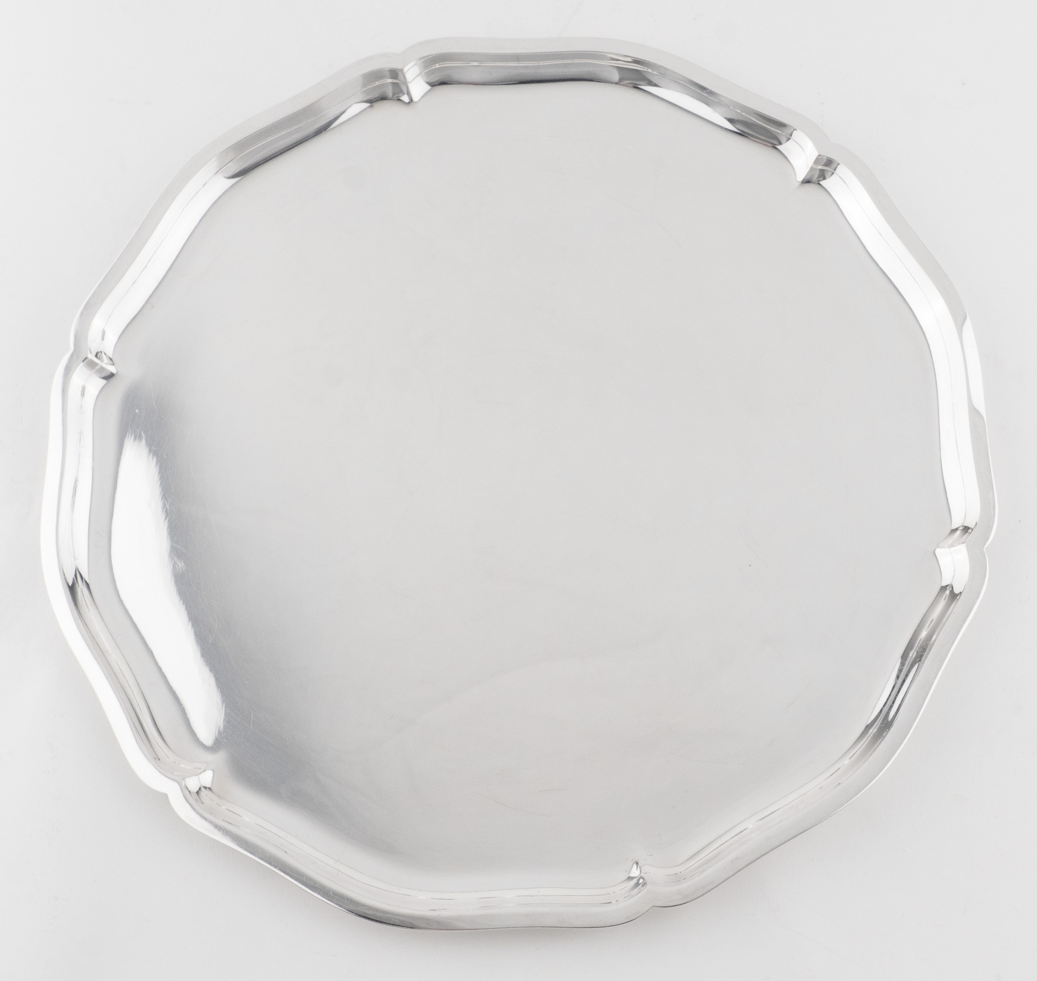 Ein elegantes rundes Silbertablett in 835 Silber, glatter hochpolierter Dekor, umlaufend mehrfach eingezogener und geschweifter Rand.