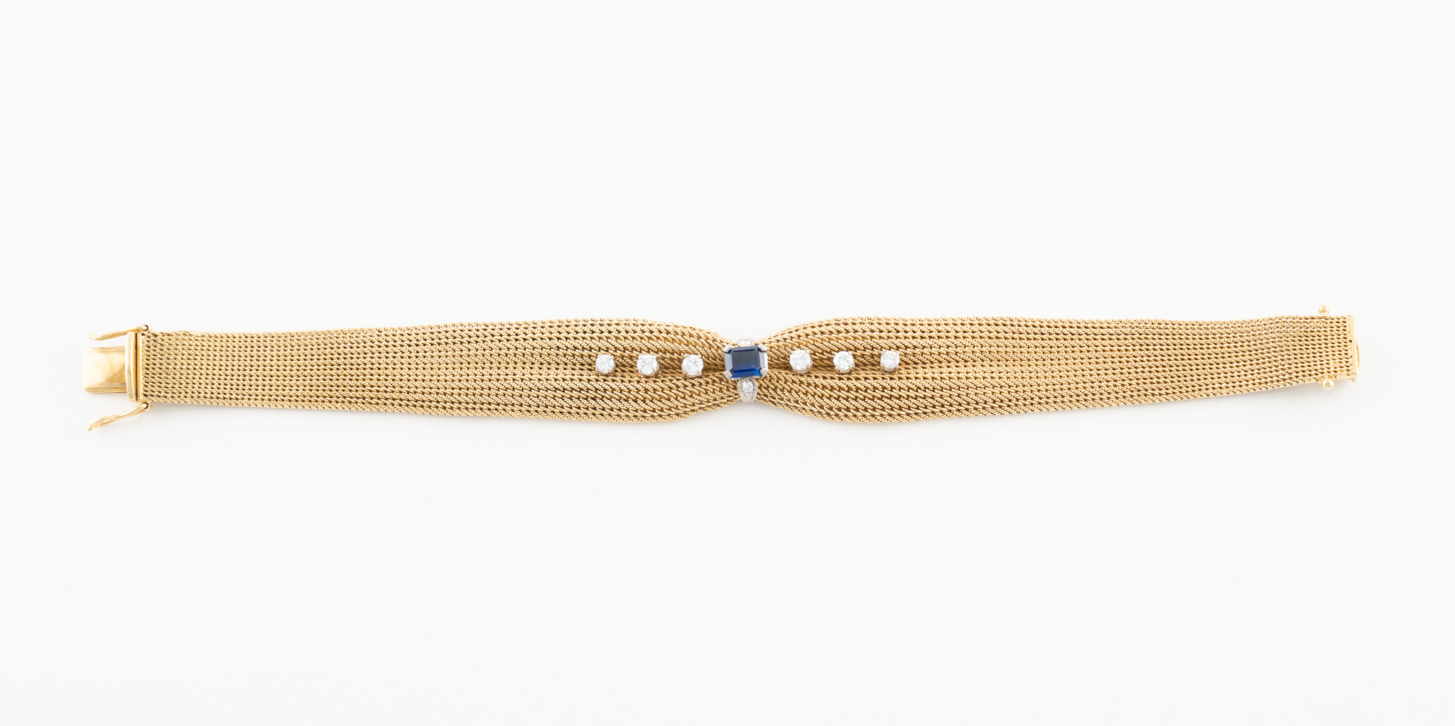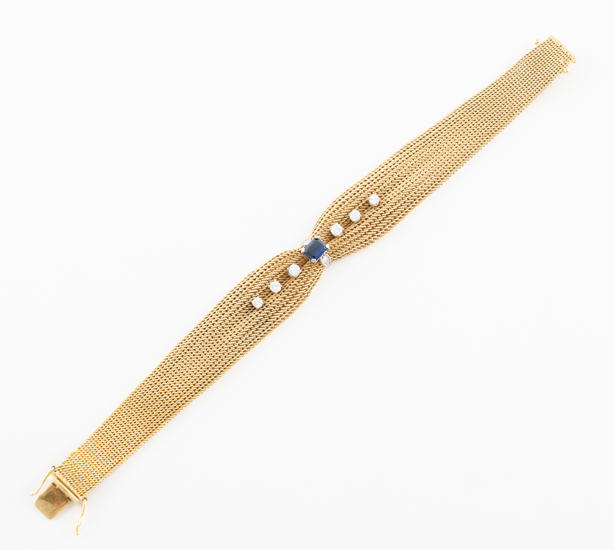 Ein feines Goldarmband gearbeitet in 18 Karat (750/1000) Gelbgold mit einem Saphir von ca. 1 ct., 6 Brillanten von zusammen ca. 0,5 ct. und zwei Diamanten von zus. ca. 0.08 ct.