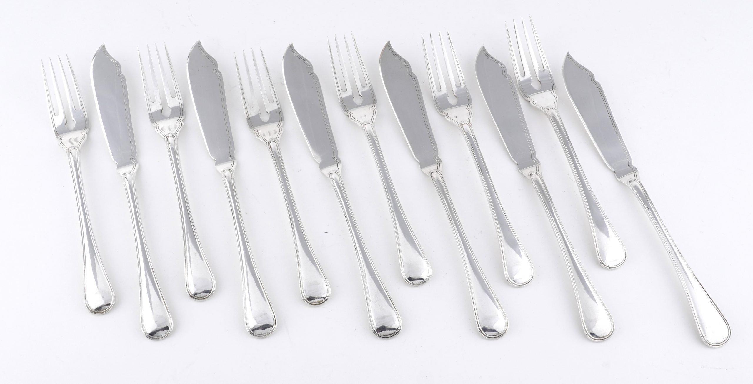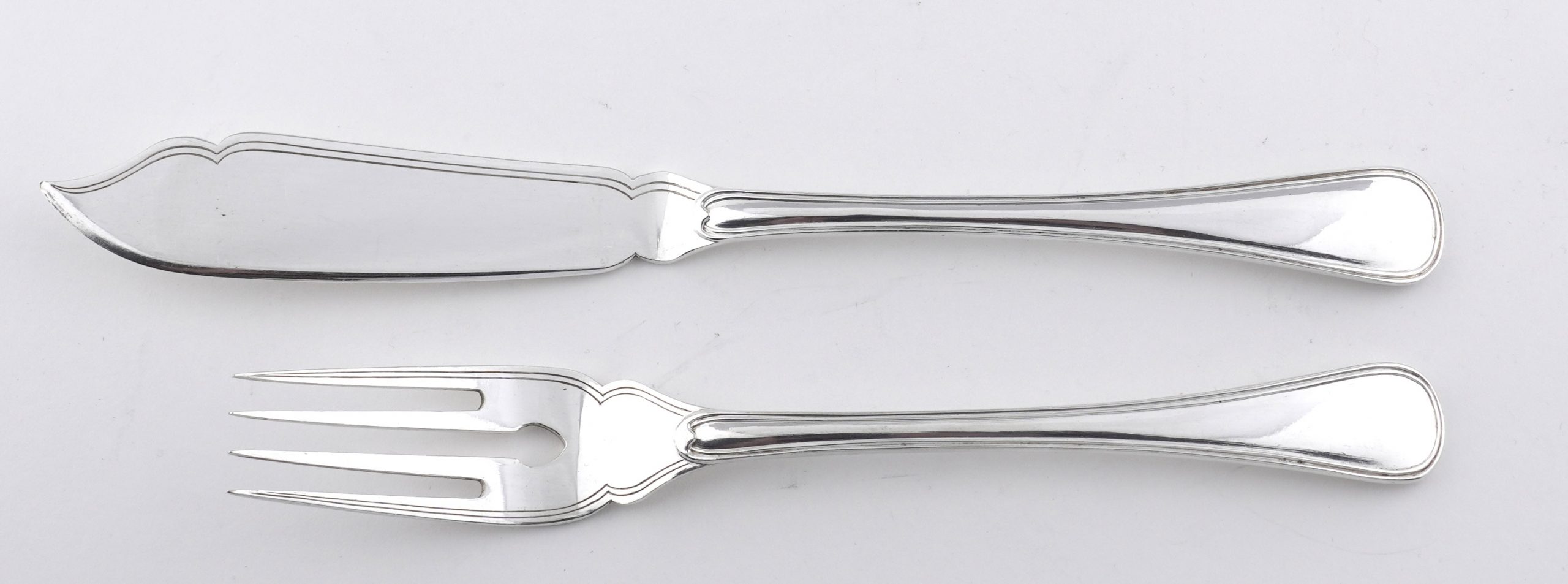 Ein 12-teiliges Fischbesteck für 6 Personen im Dekor "Schwedisch Faden" - Wilkens Bremen