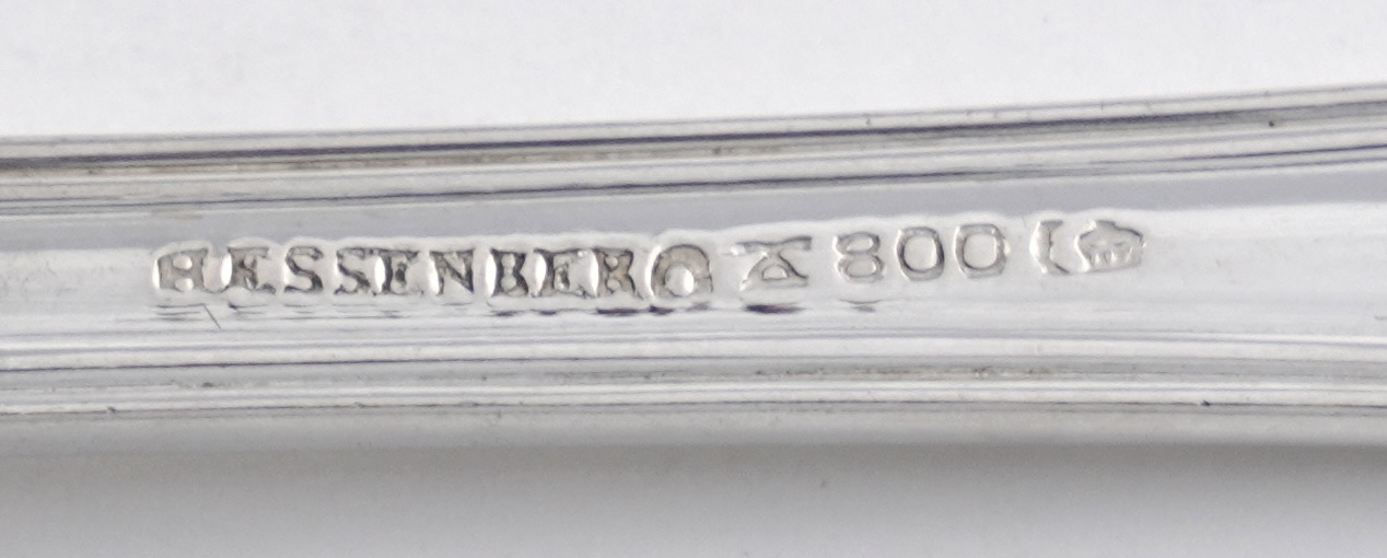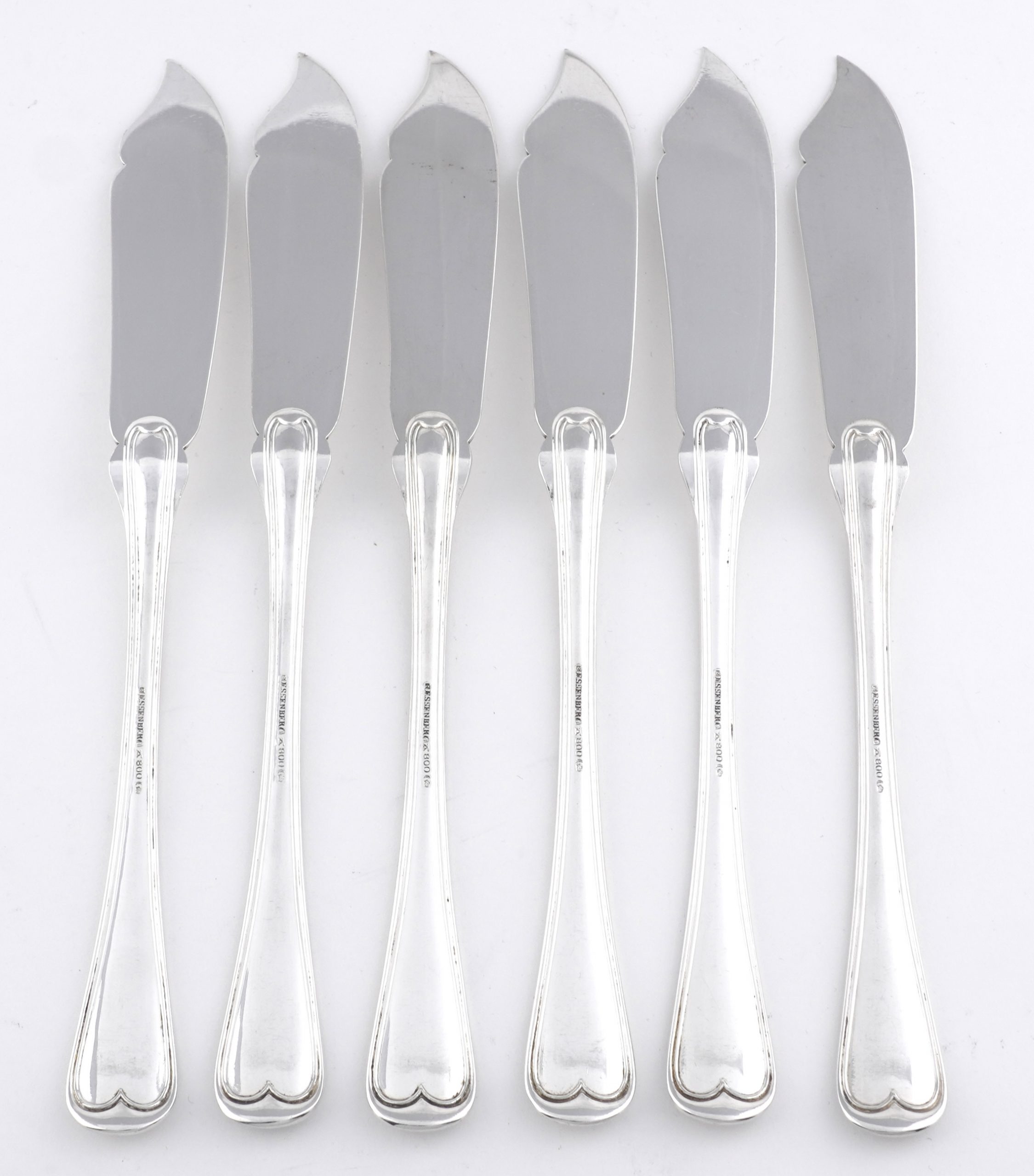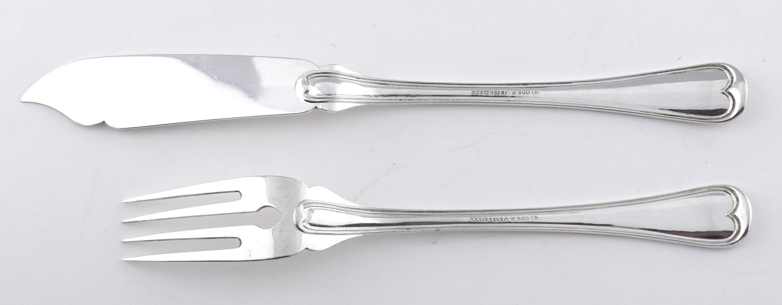Ein elegantes 12-teiliges Fischbesteck für 6 Personen gearbeitet in 800er Silber im Dekor „Schwedisch Faden“ von Wilkens Bremen – Wiederverkäufermarke Hessenberg“ Frankfurt am Main.
