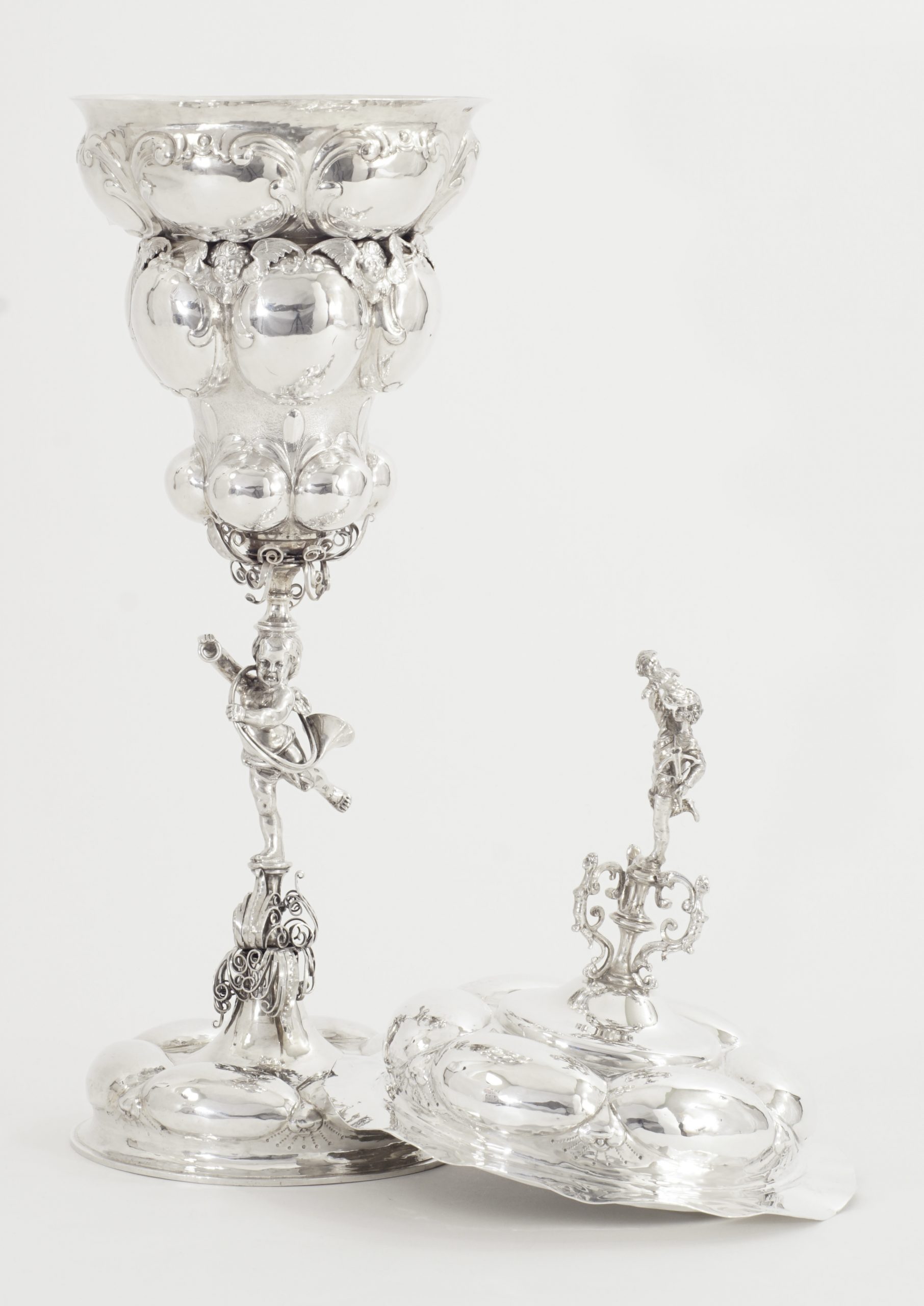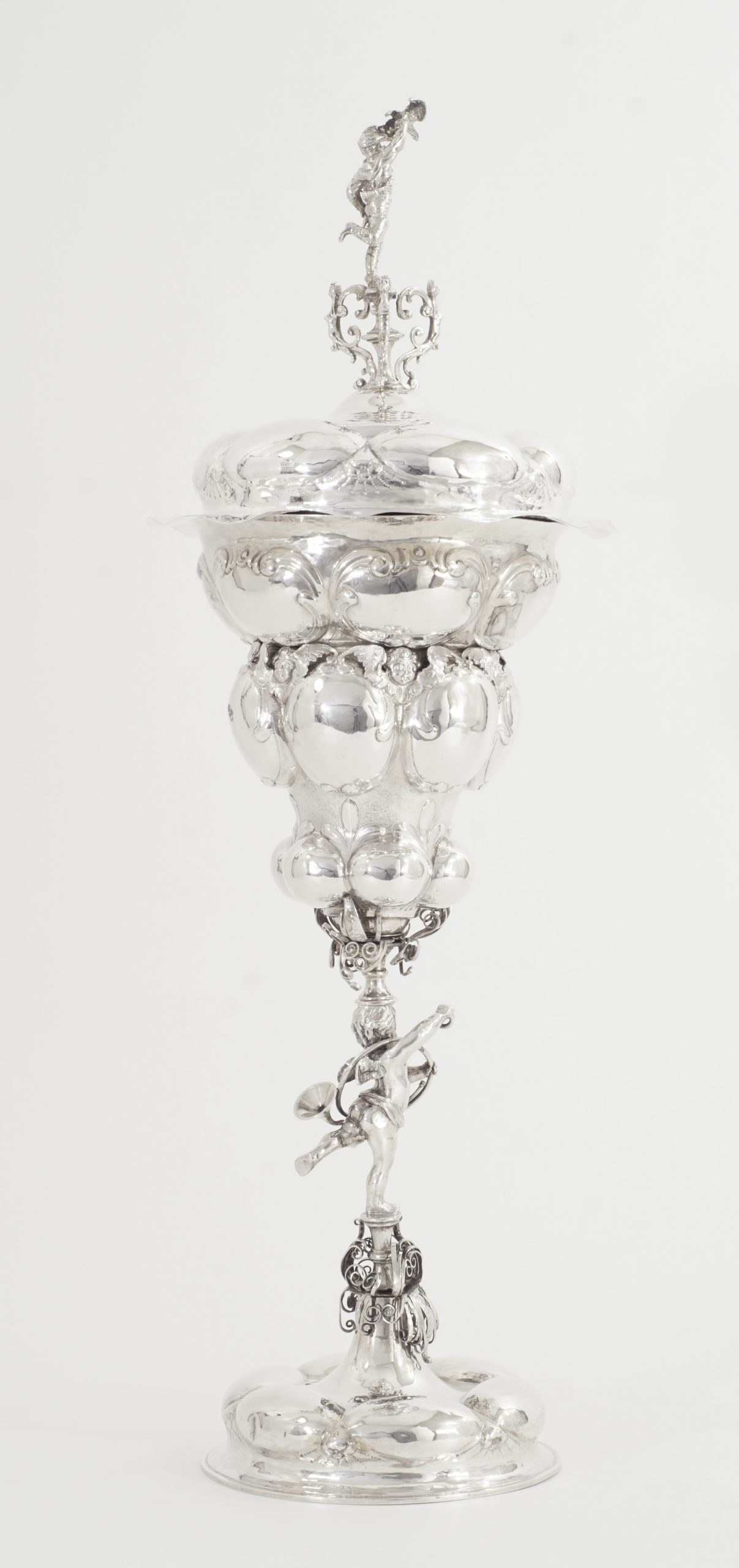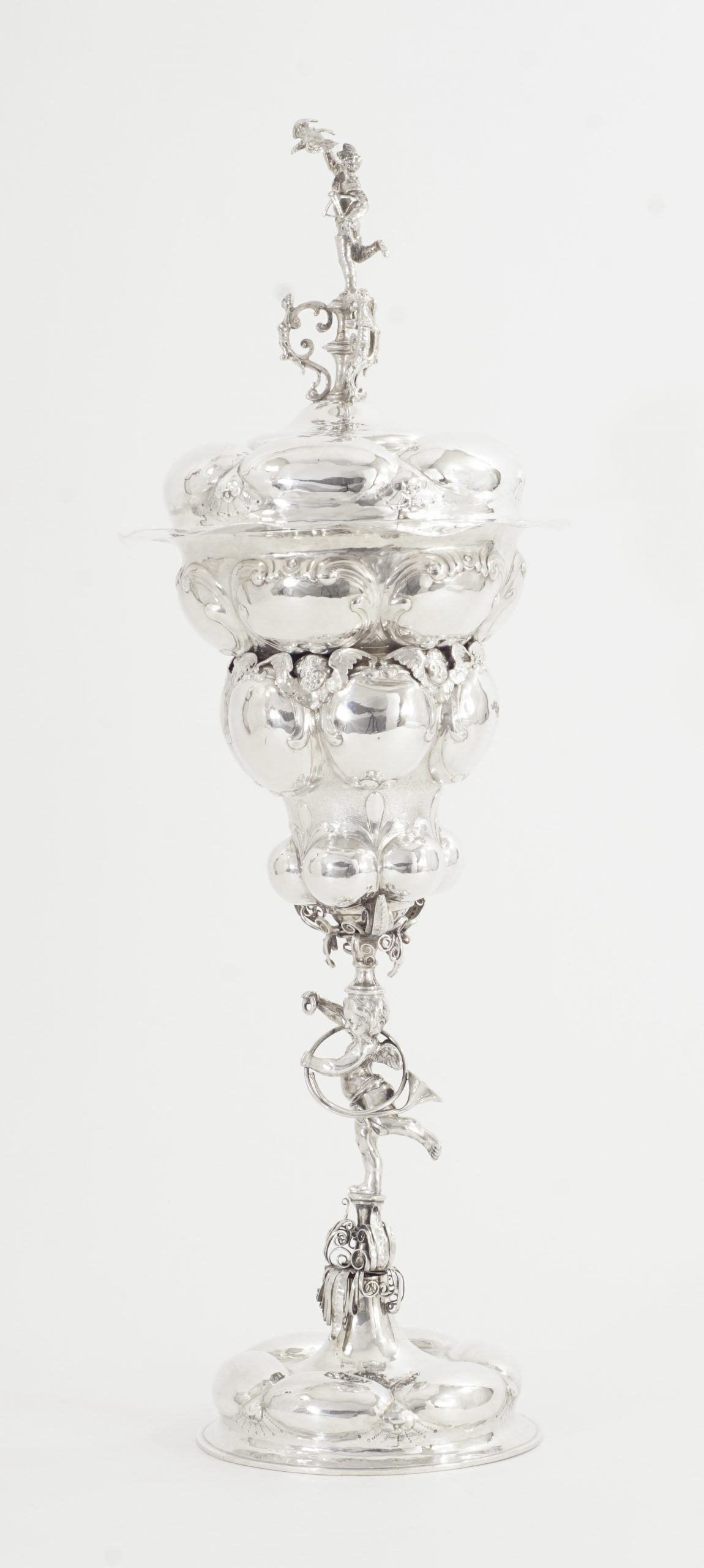 Der Pokal auf sechsfach gebuckelten Fuß, kurzen Balusterschaft mit einem „Putte mit Jagdhorn“. Die eingeschnürrte Kuppa mit drei Reihen großer getriebener Buckel umrahmt von einer Reihe von fein ausgearbeiteten Puttenköpfen. Der abnehmbare gebuckelte Deckel bekrönt von einer plastisch detailliert gearbeitete Figur eines Jägers mit Armbrust und Jagdfalken.