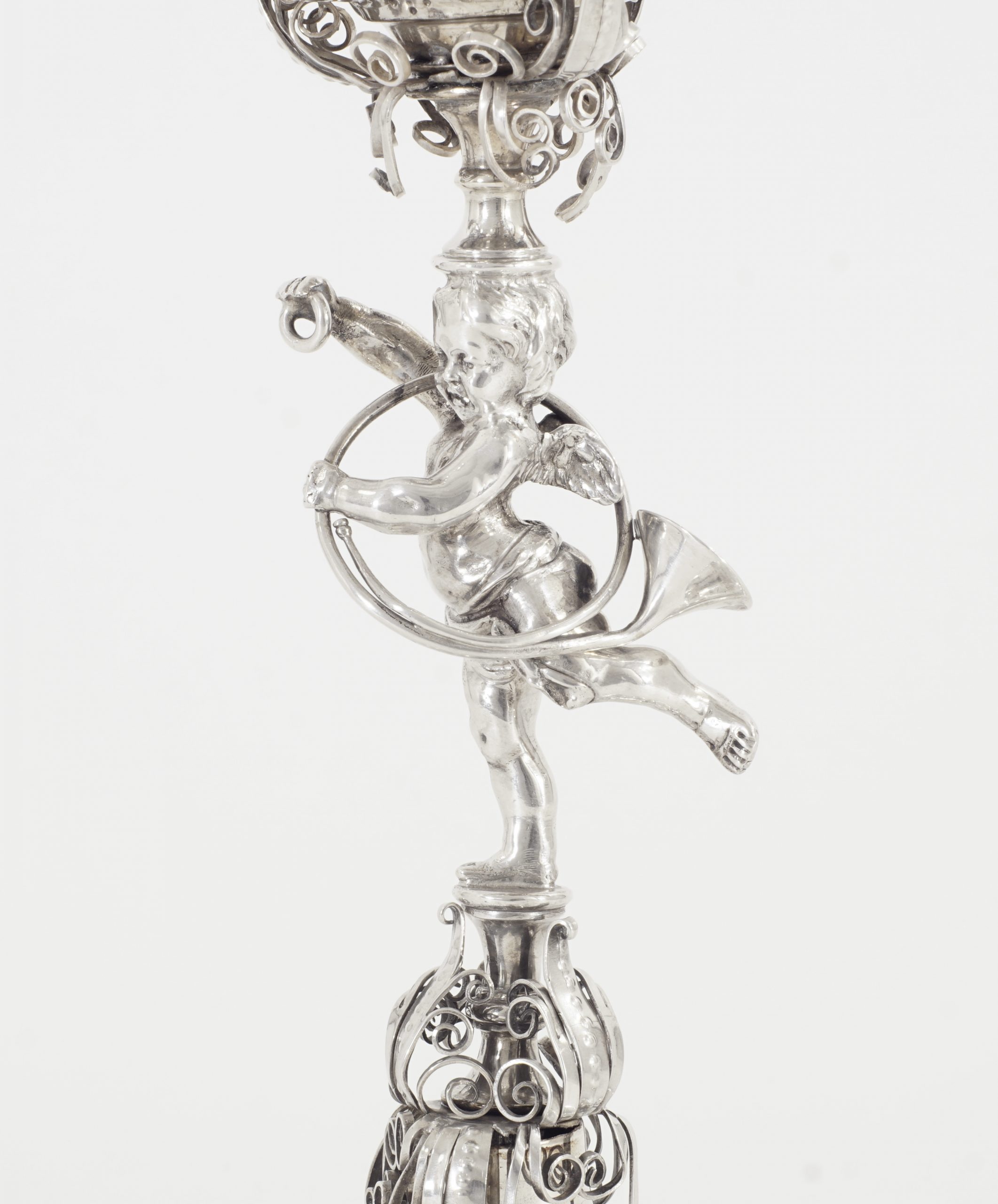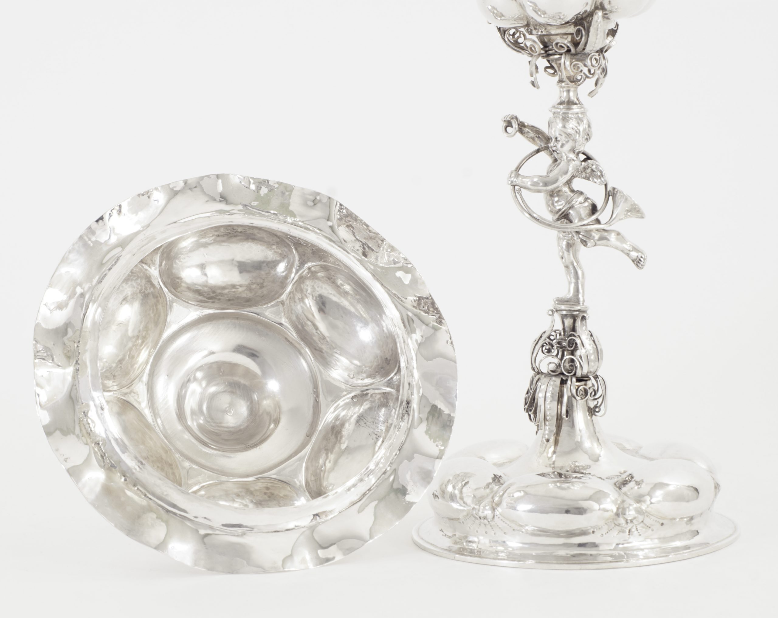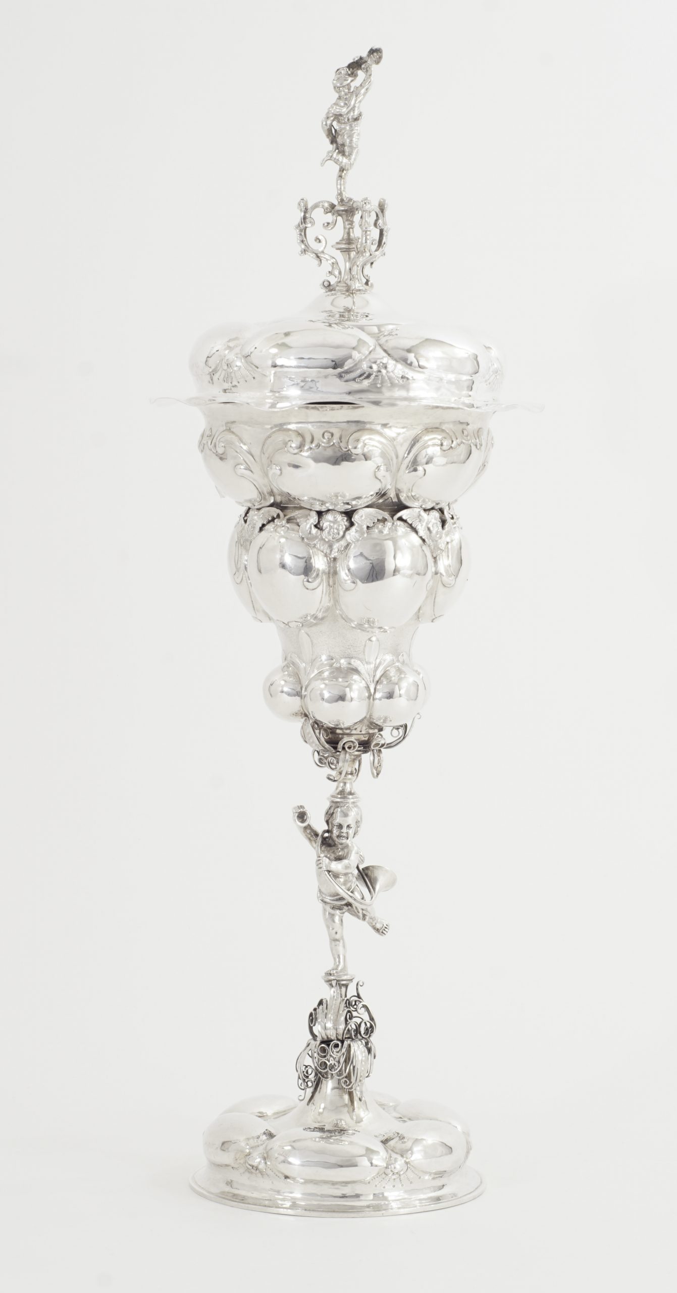 Der Pokal auf sechsfach gebuckelten Fuß, kurzen Balusterschaft mit einem „Putte mit Jagdhorn“. Die eingeschnürrte Kuppa mit drei Reihen großer getriebener Buckel umrahmt von einer Reihe von fein ausgearbeiteten Puttenköpfen. Der abnehmbare gebuckelte Deckel bekrönt von einer plastisch detailliert gearbeitete Figur eines Jägers mit Armbrust und Jagdfalken.