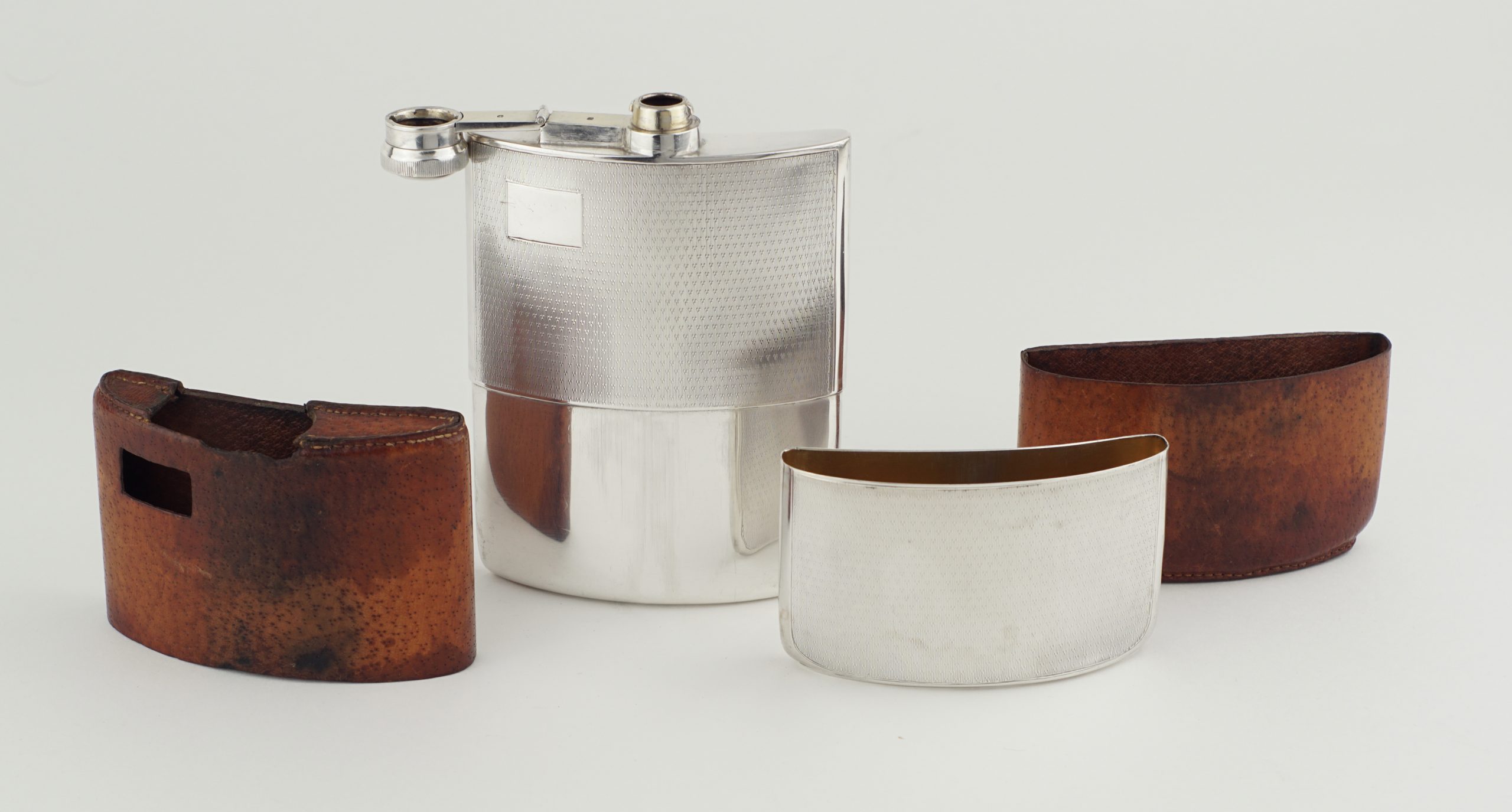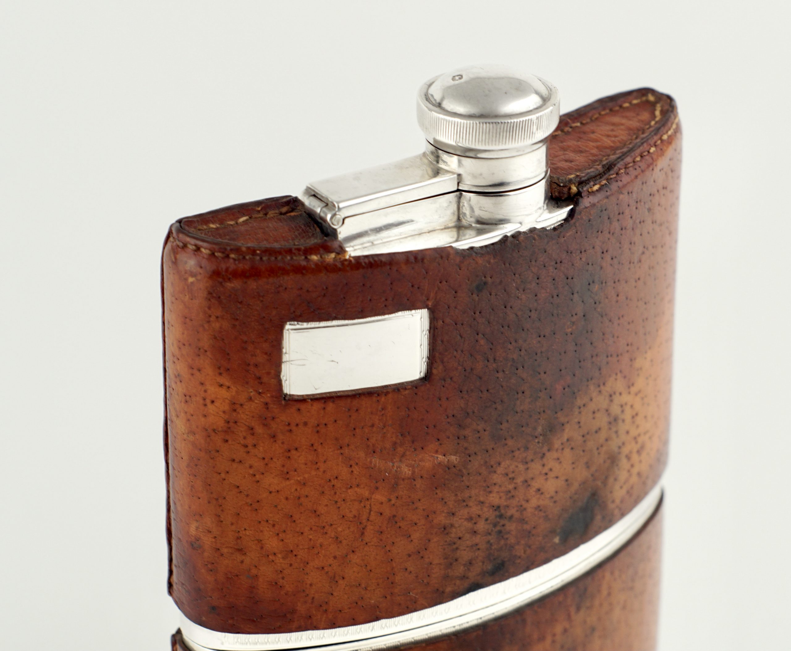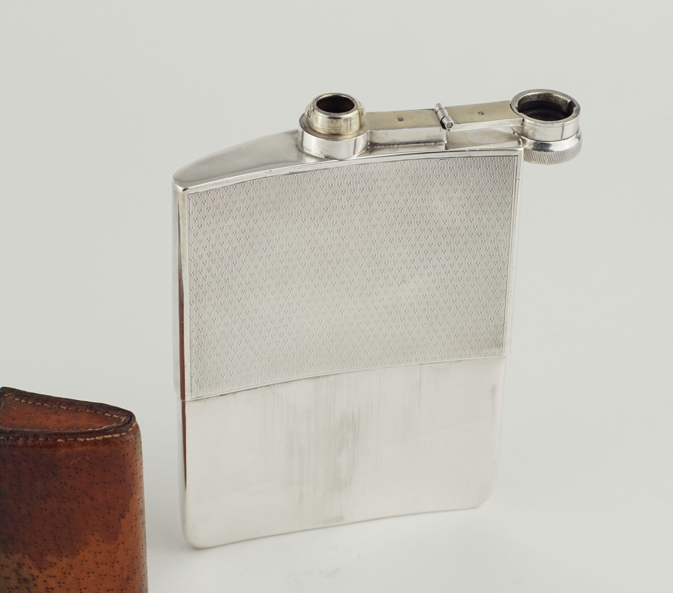 Ein großer Flachmann („hip flask“) mit Becher, gearbeitet in 925 Sterlingsilber. Feine Gravur und abnehmbarer Lederbezug. Monogrammkartusche noch ungraviert.