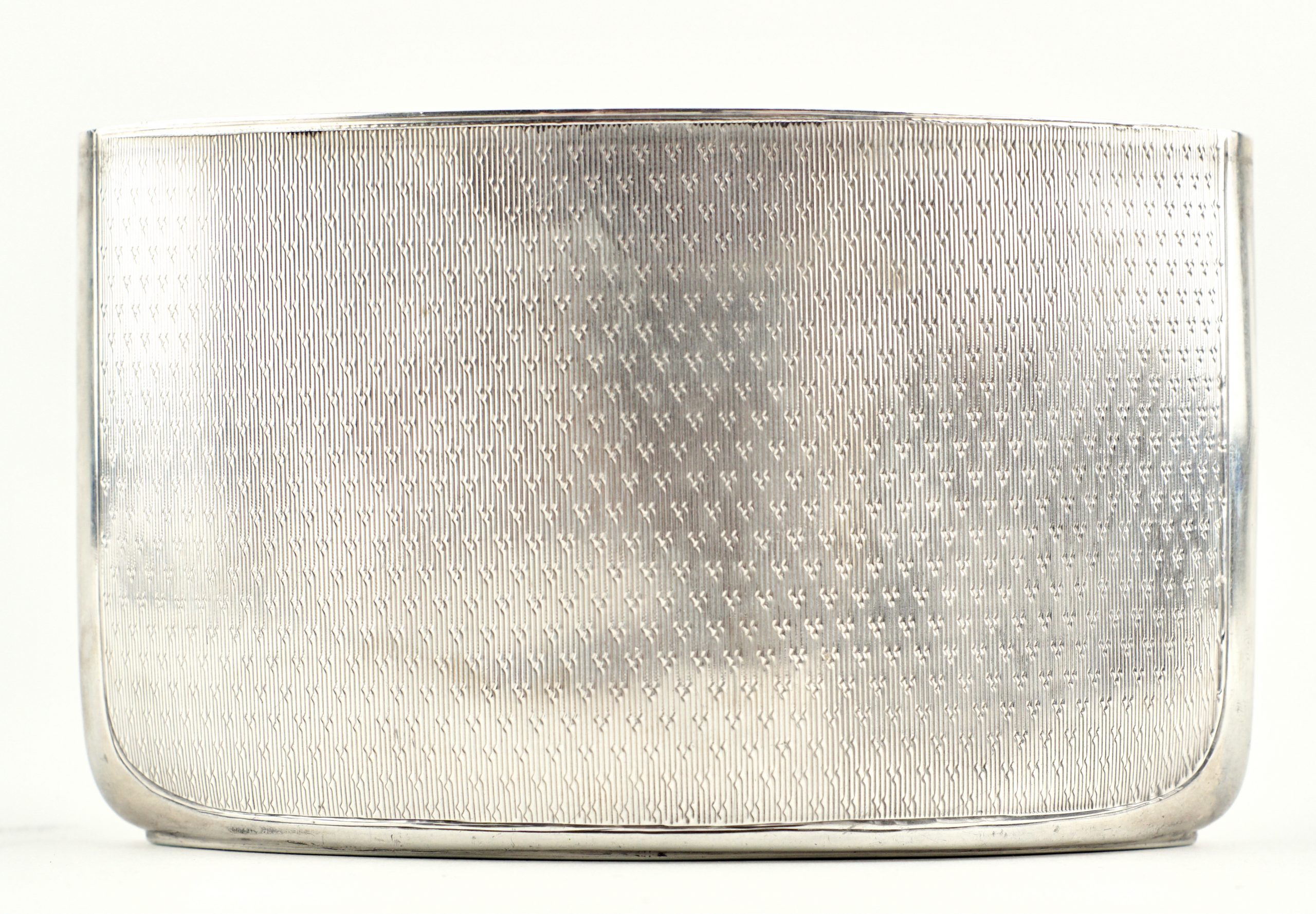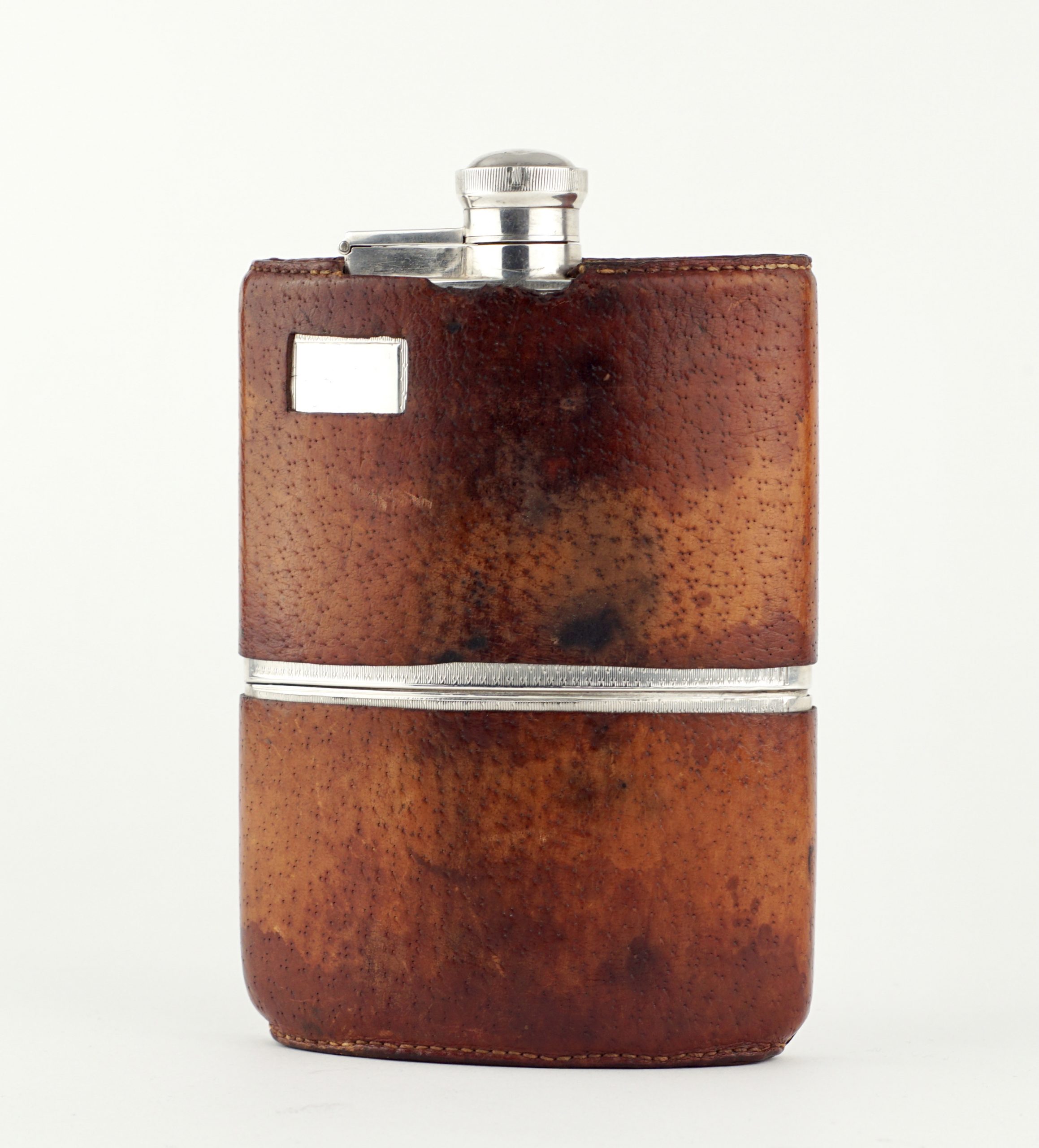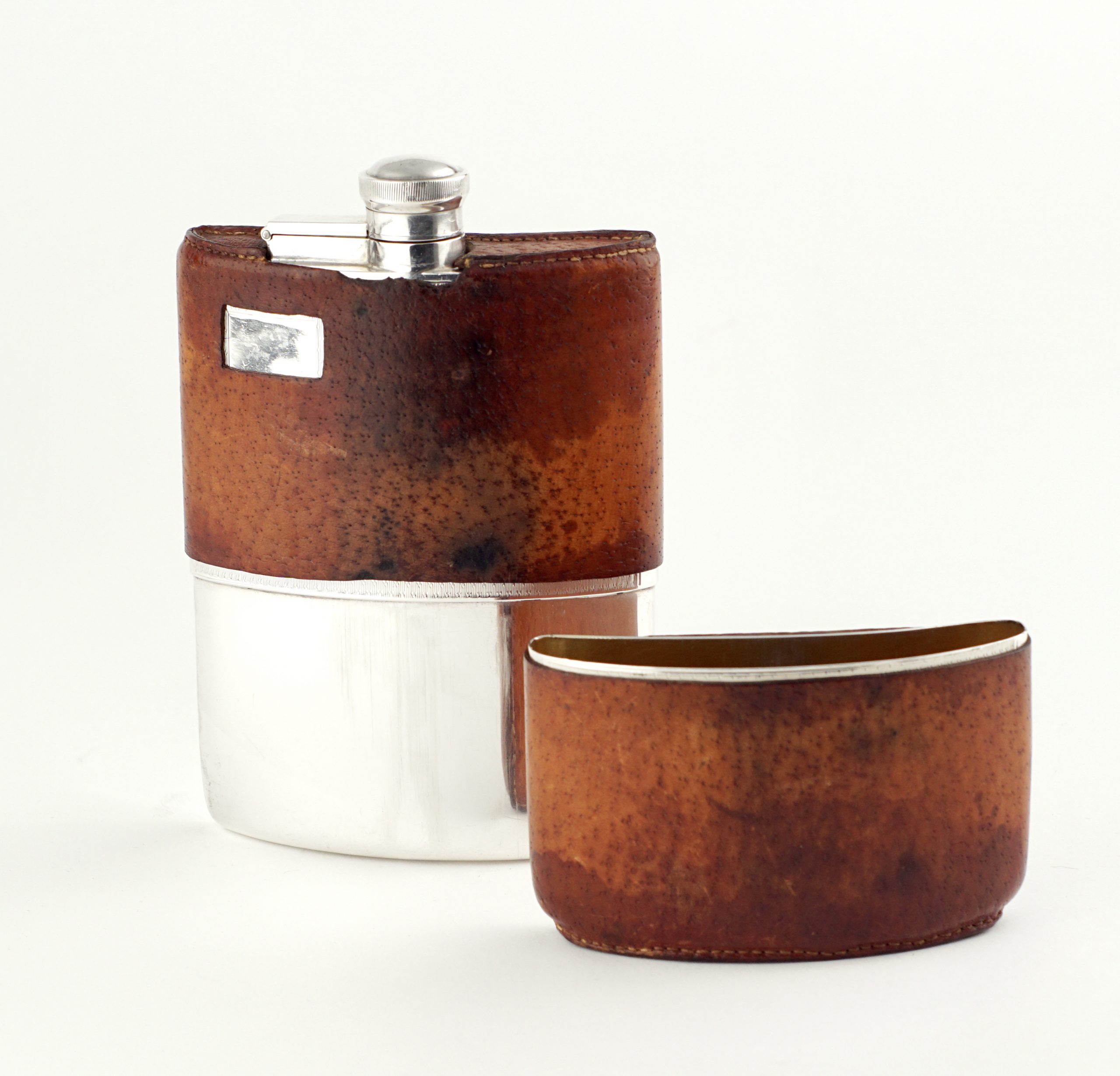Ein großer Flachmann („hip flask“) mit Becher, gearbeitet in 925 Sterlingsilber. Feine Gravur und abnehmbarer Lederbezug. Monogrammkartusche noch ungraviert.