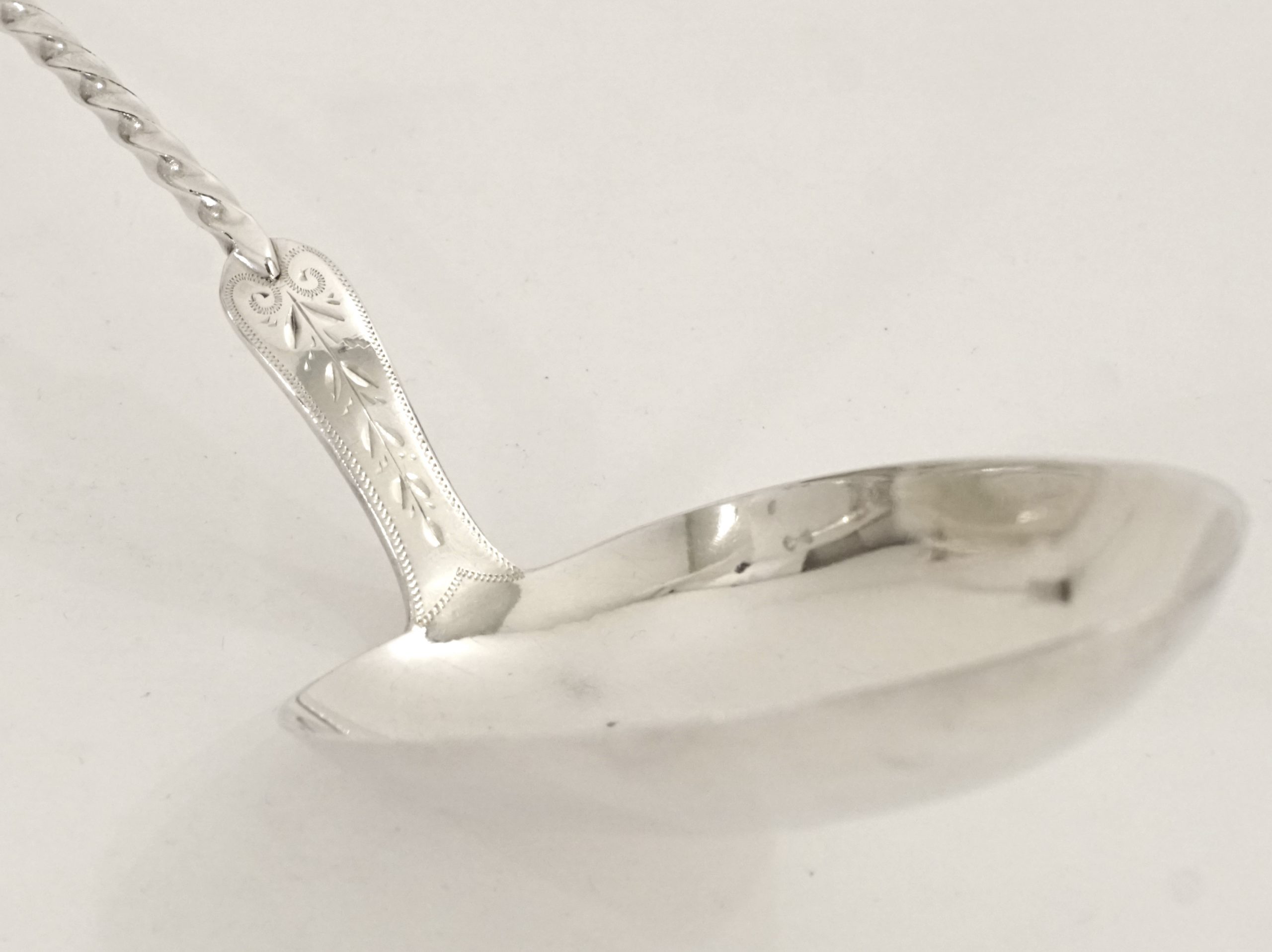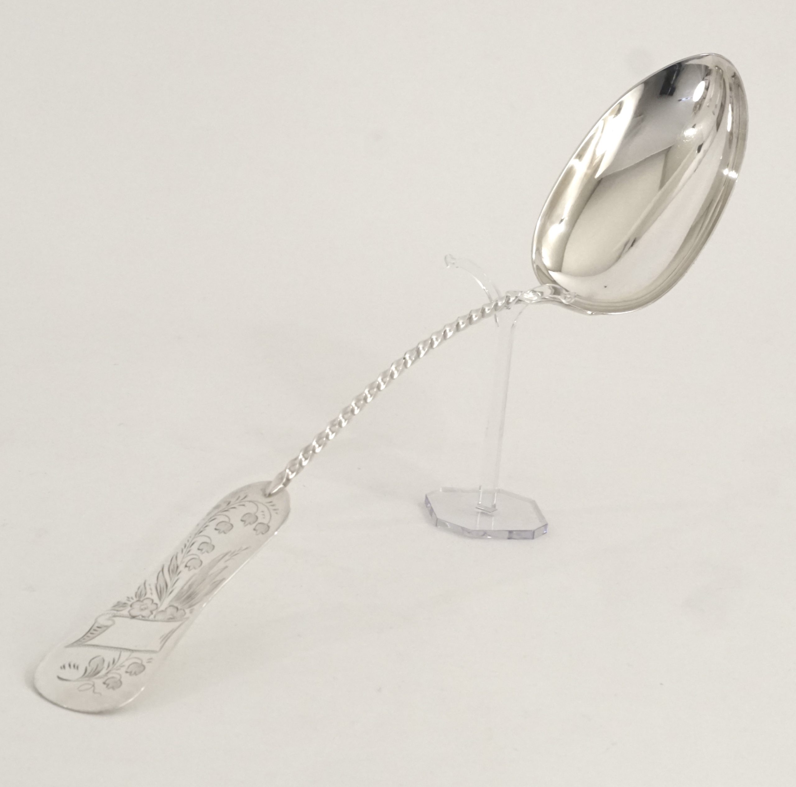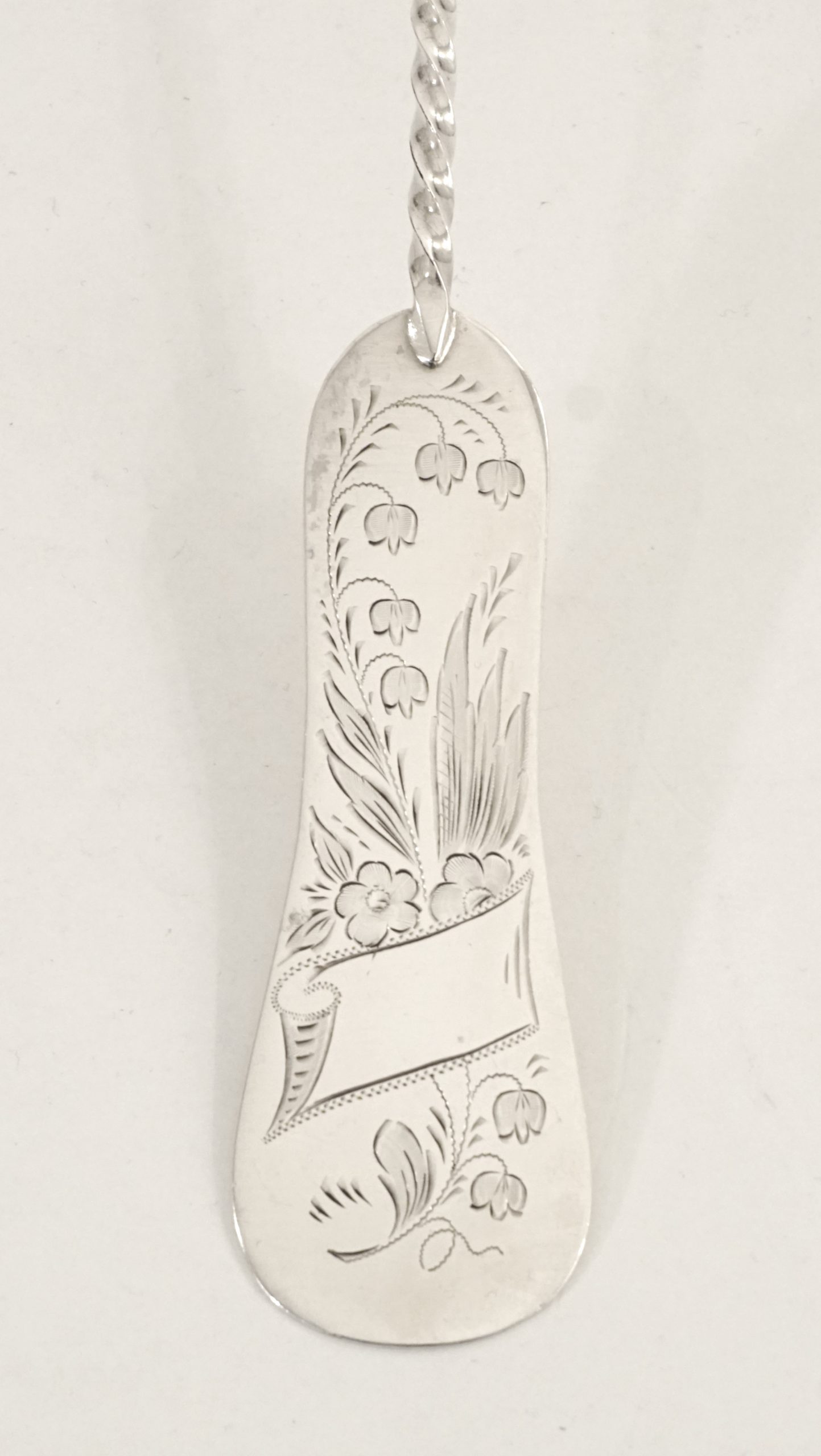 Gedrehter Stiel mit geigenförmigem Stilende – Maiglöckchen Dekor und noch freier Monogramm-Kartusche.