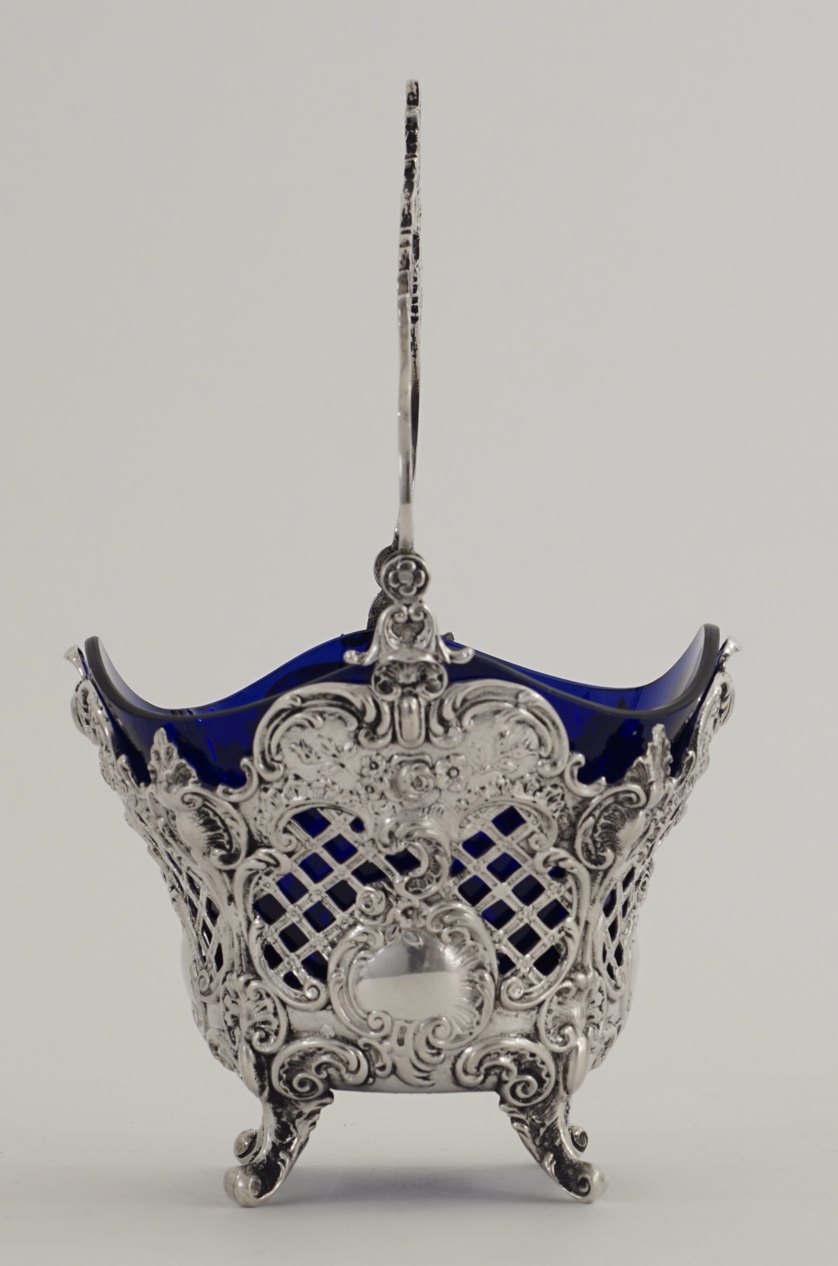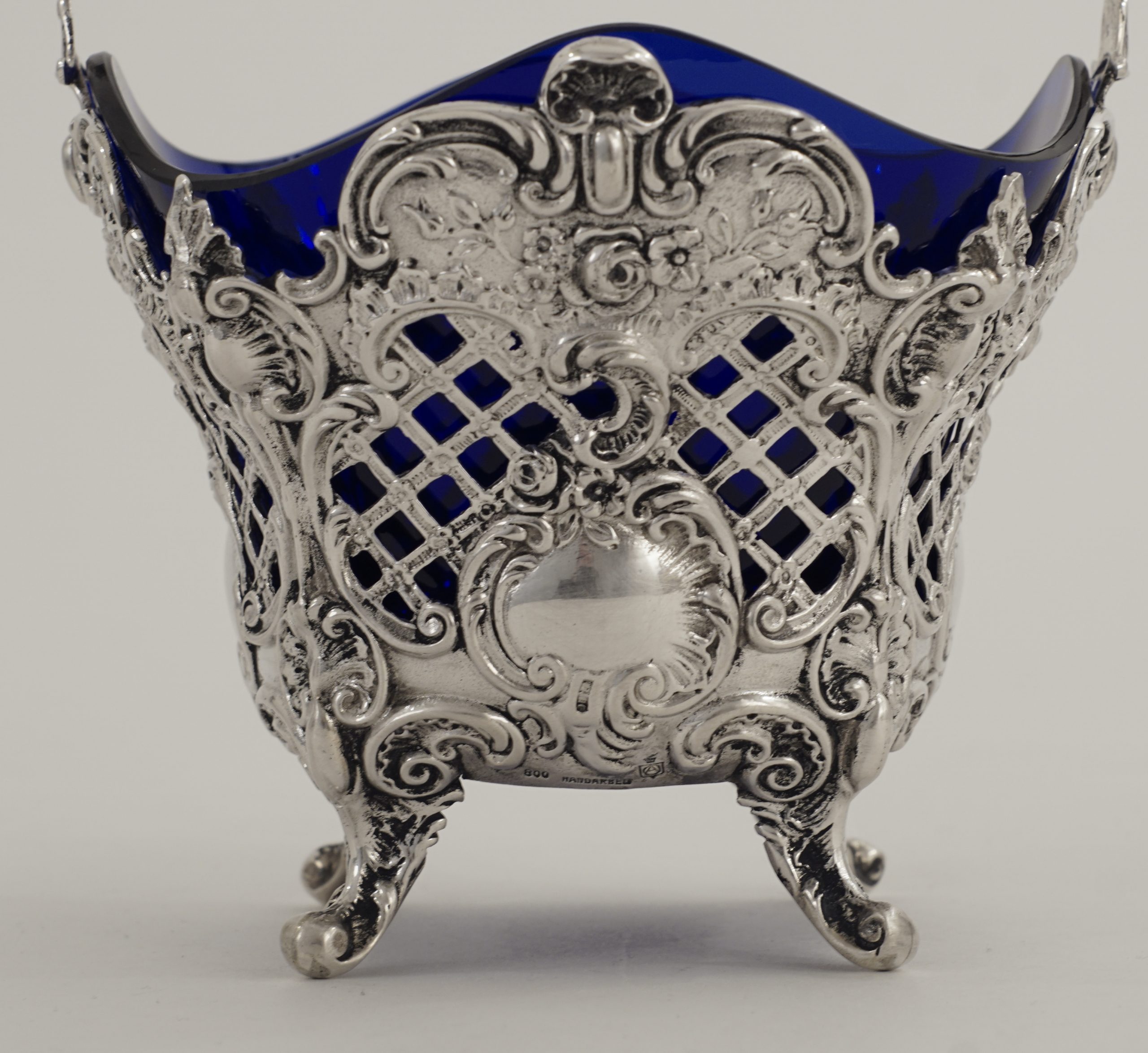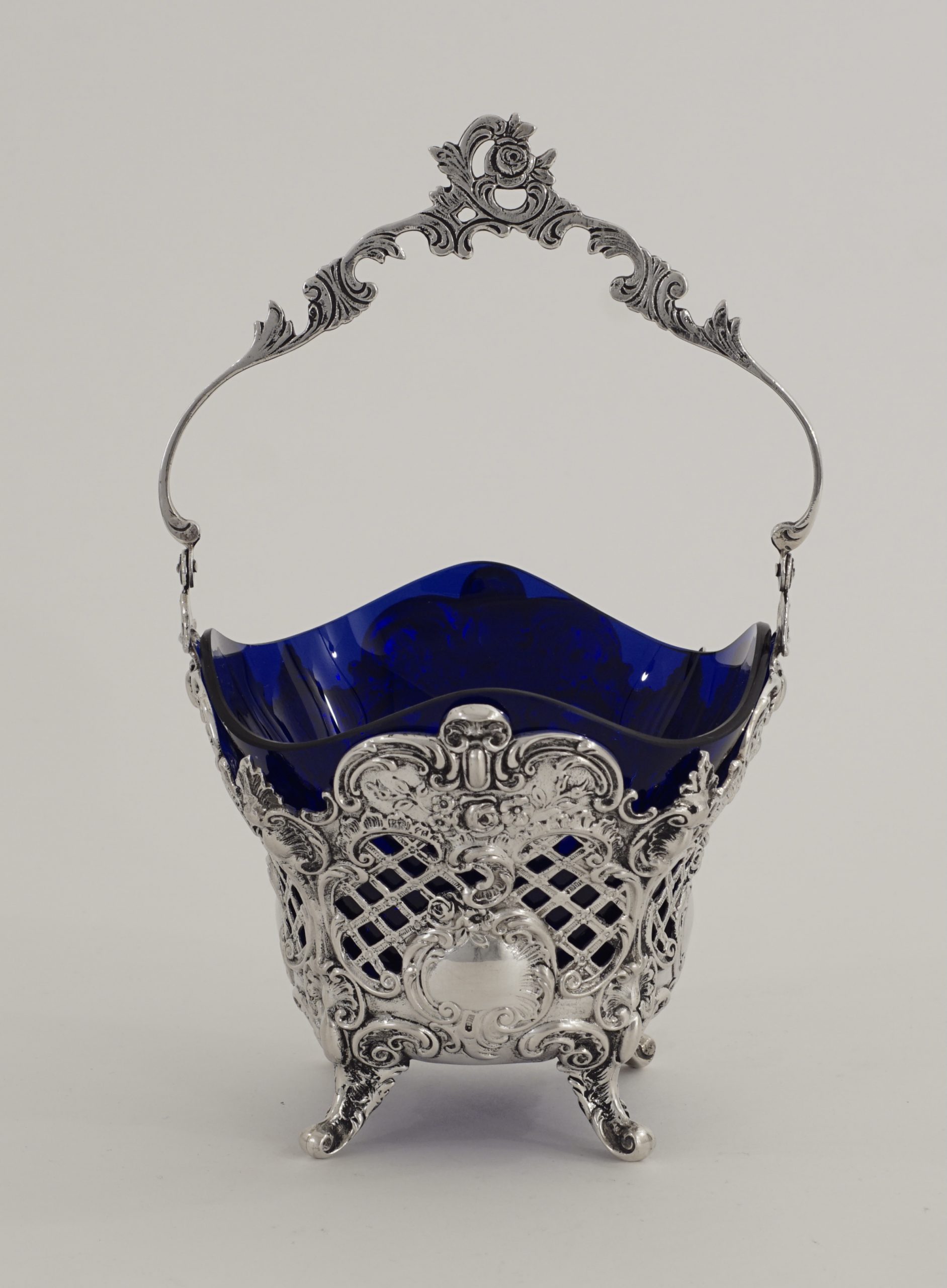 Ein Henkelkorb in 800er Silber, durchbrochen gearbeitet im Stil des Rokoko, mit blauem Glaseinsatz.