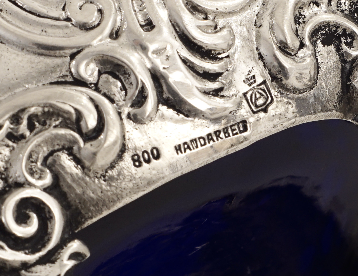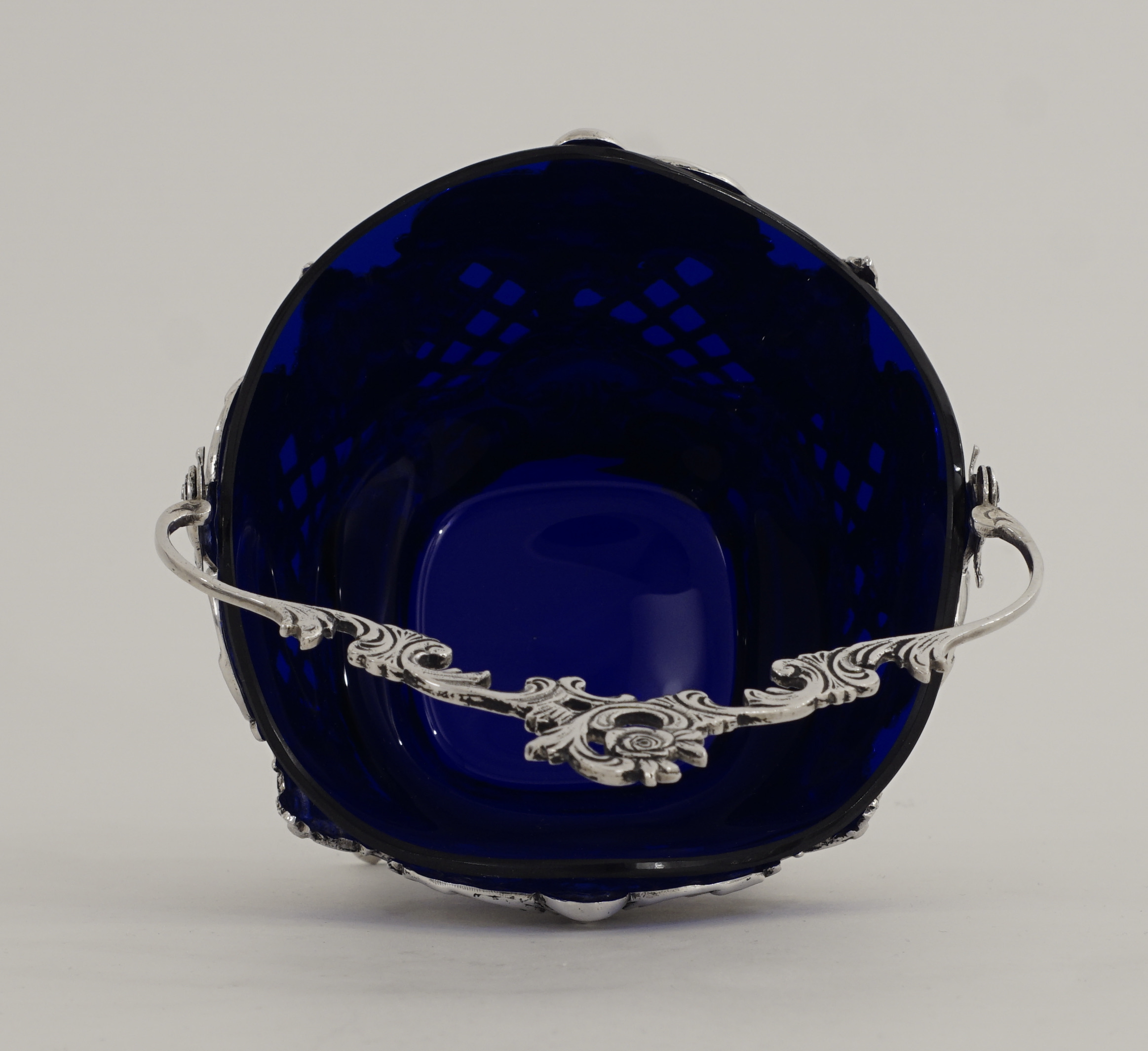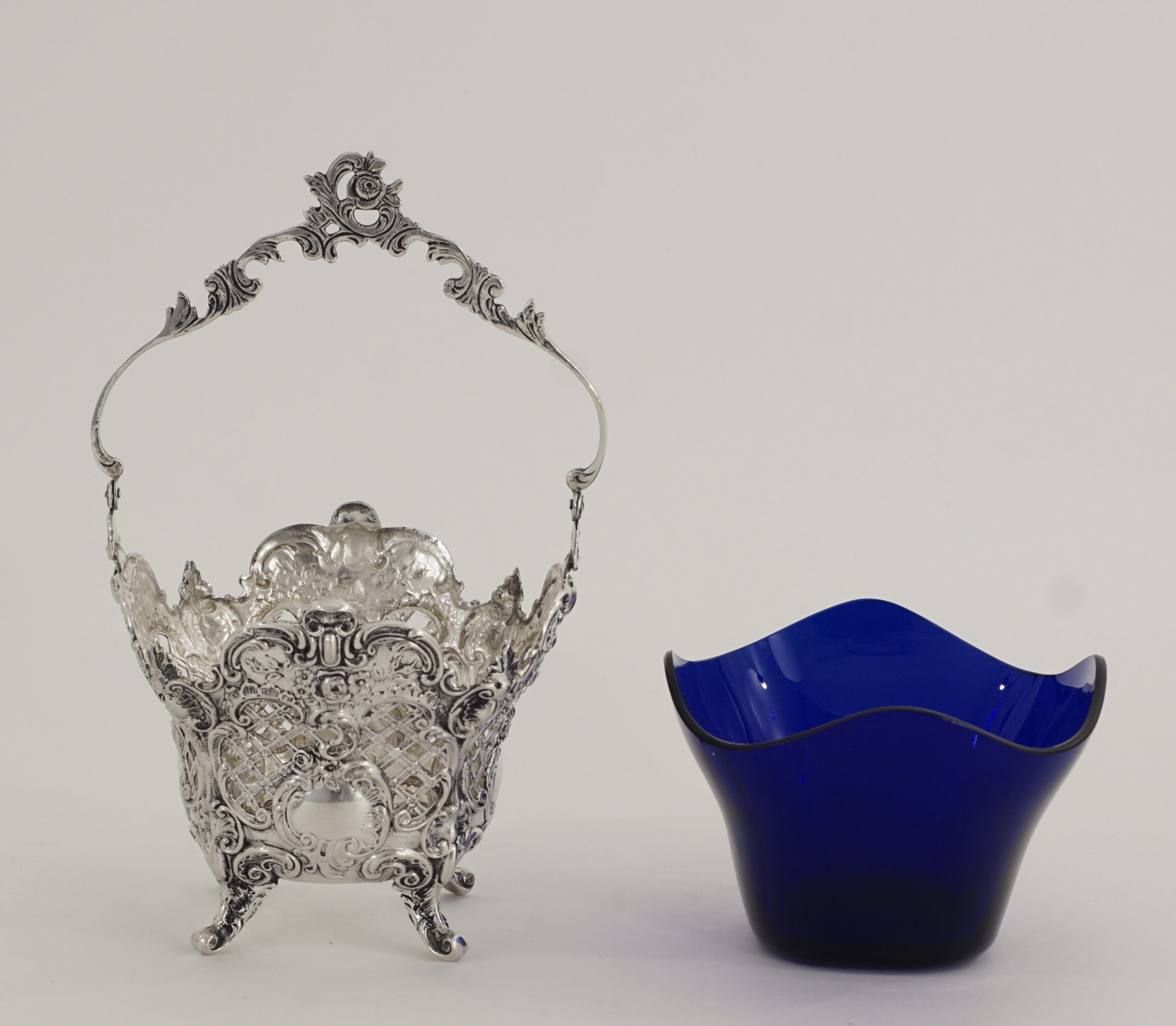 Ein Henkelkorb in 800er Silber, durchbrochen gearbeitet im Stil des Rokoko, mit blauem Glaseinsatz.