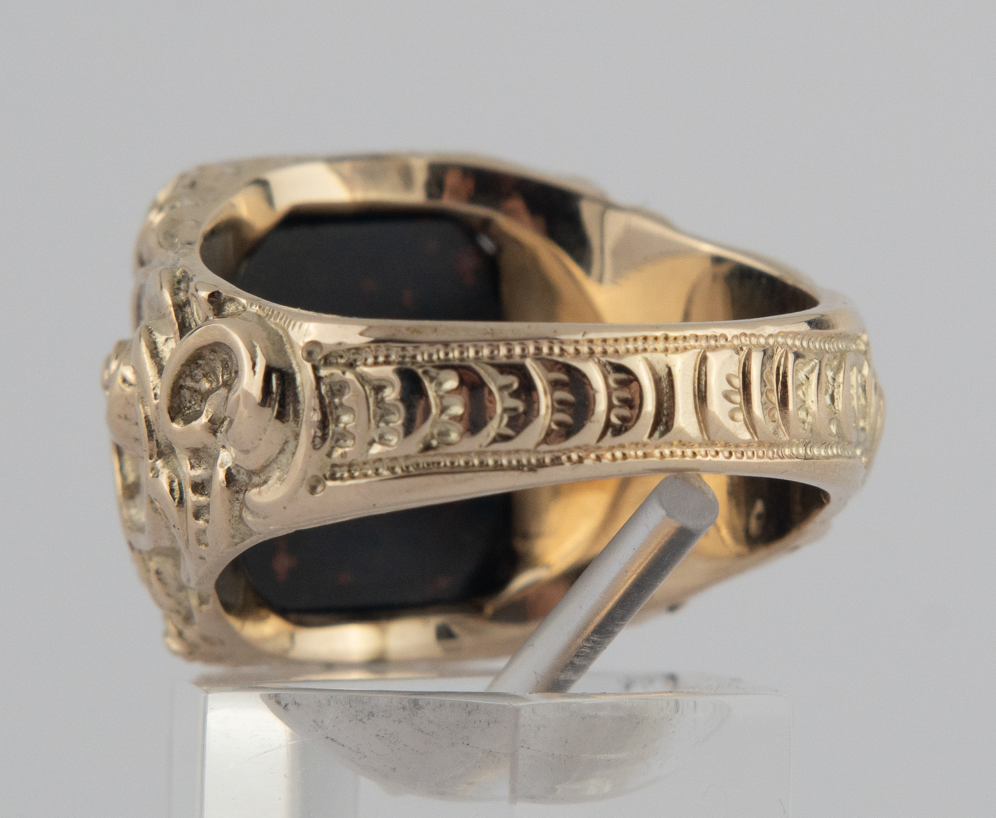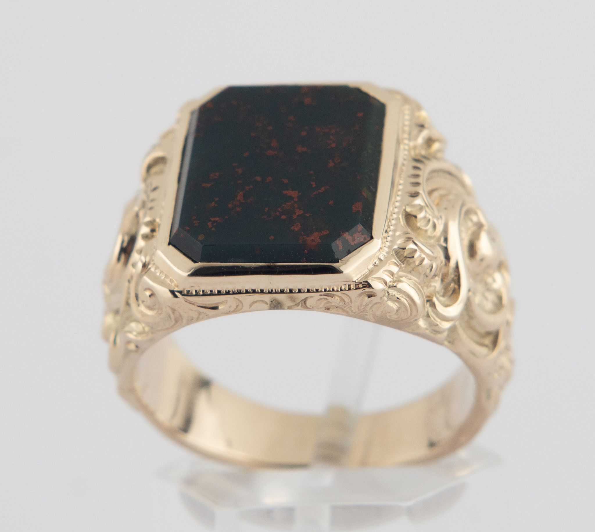 Ein Herrenring in 14 Karat Gelbgold (585/1000) mit einem Heliotrop von ca. 5 ct.. Der Ring fein dekoriert im Stil des Barock