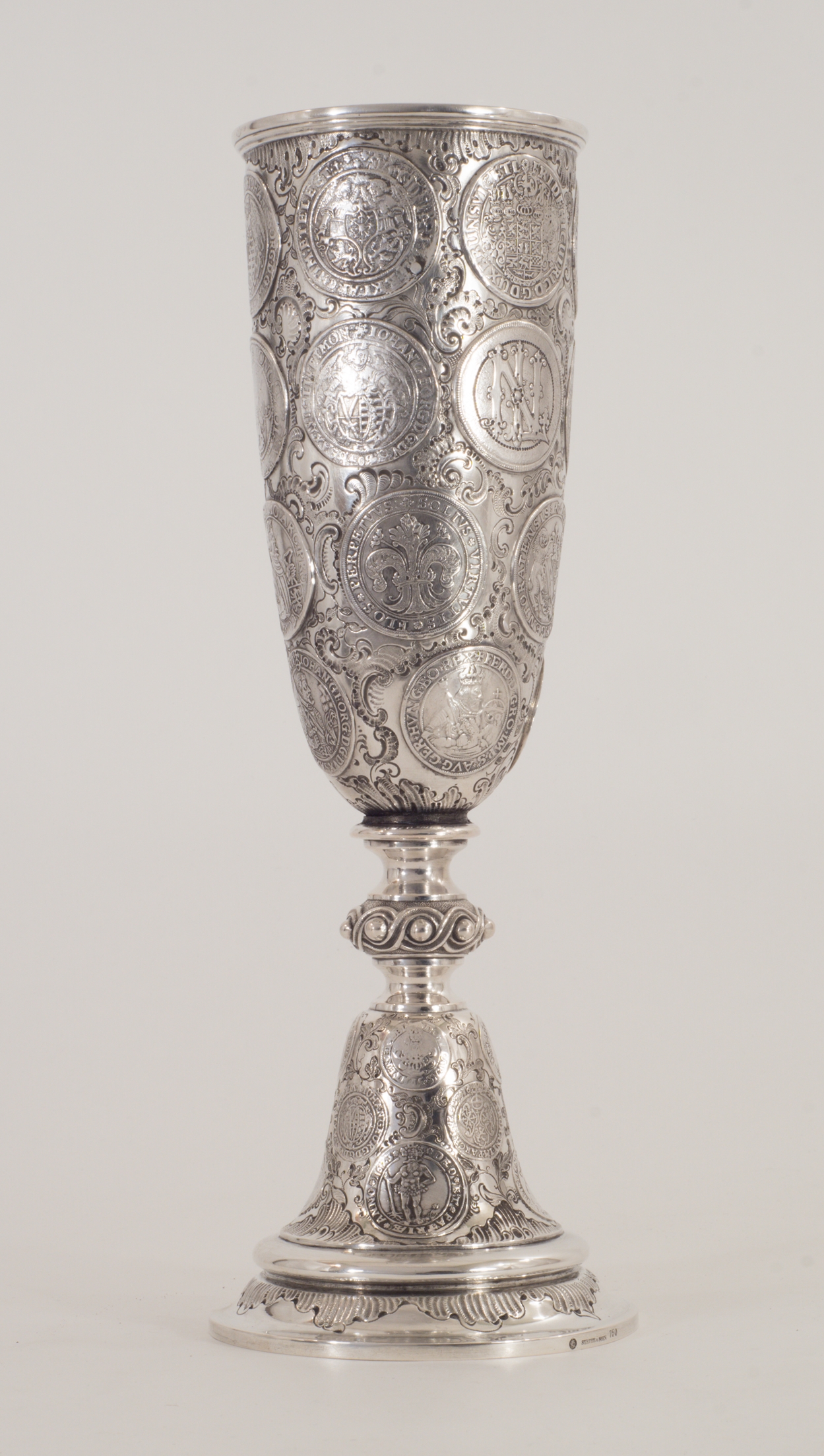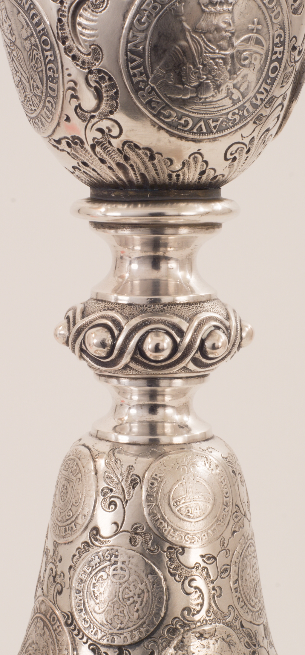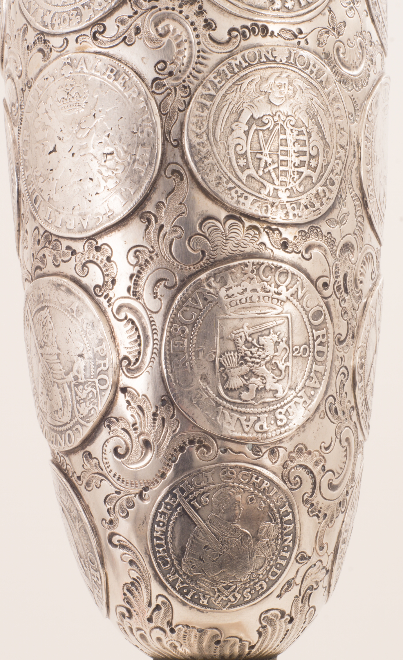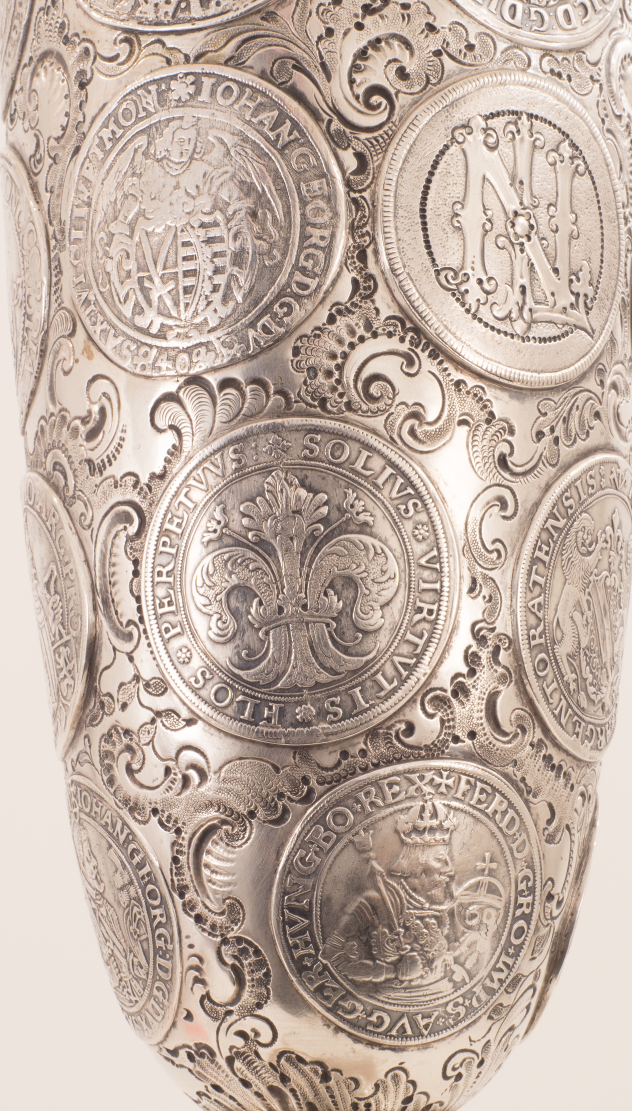 Die Kuppa auf einem balusternden Schaft, getreppter Fuß mit 12 Silbermünzen in 3 Reihen, unter anderem: