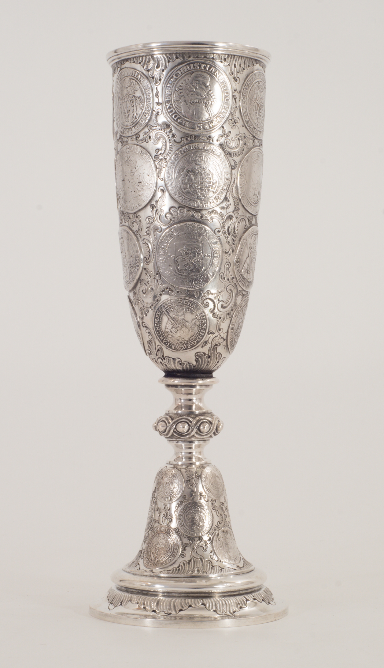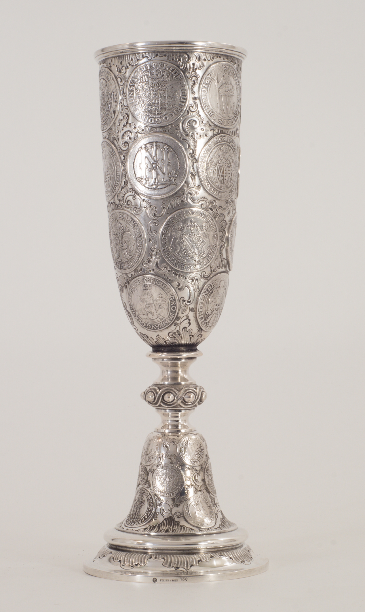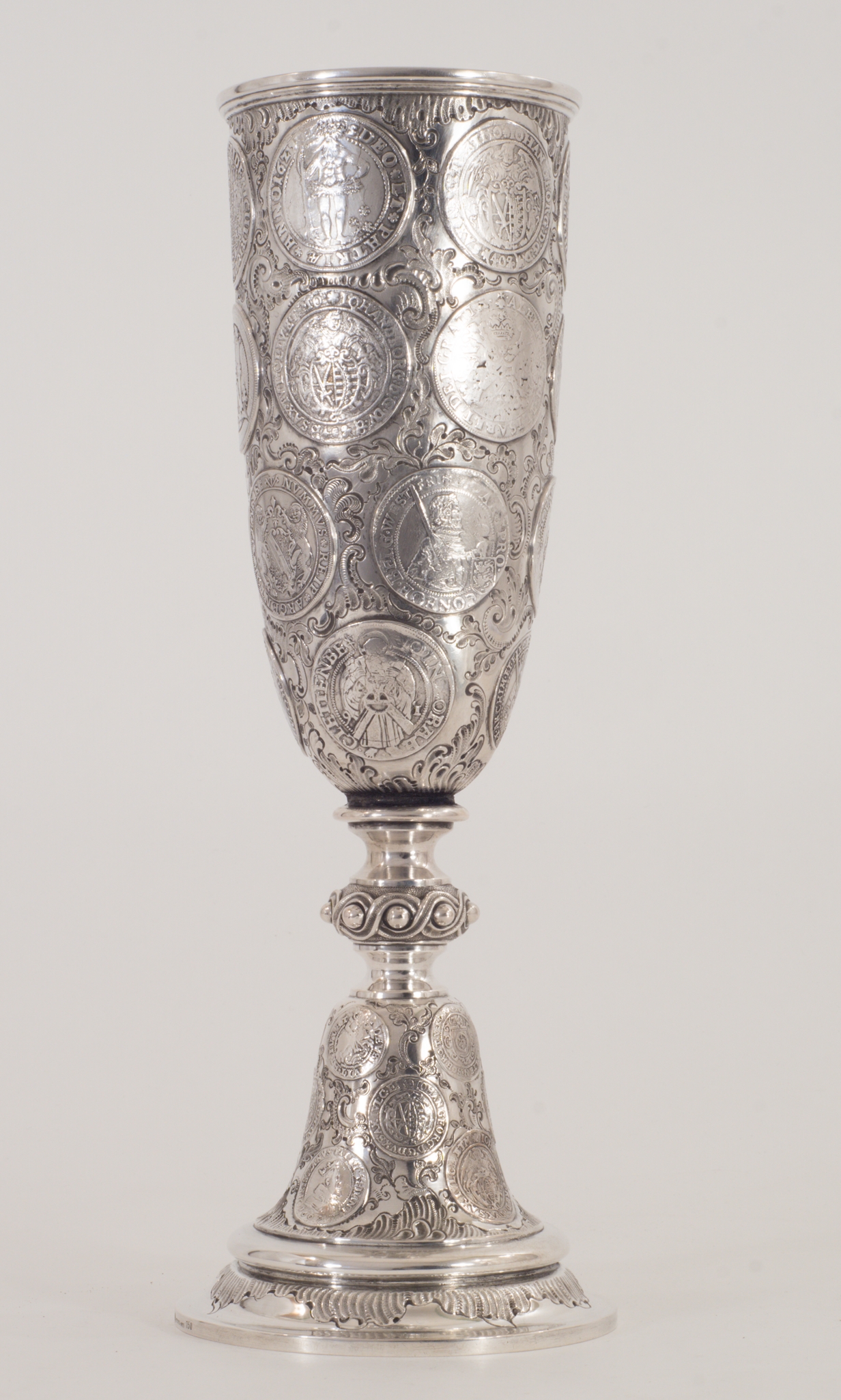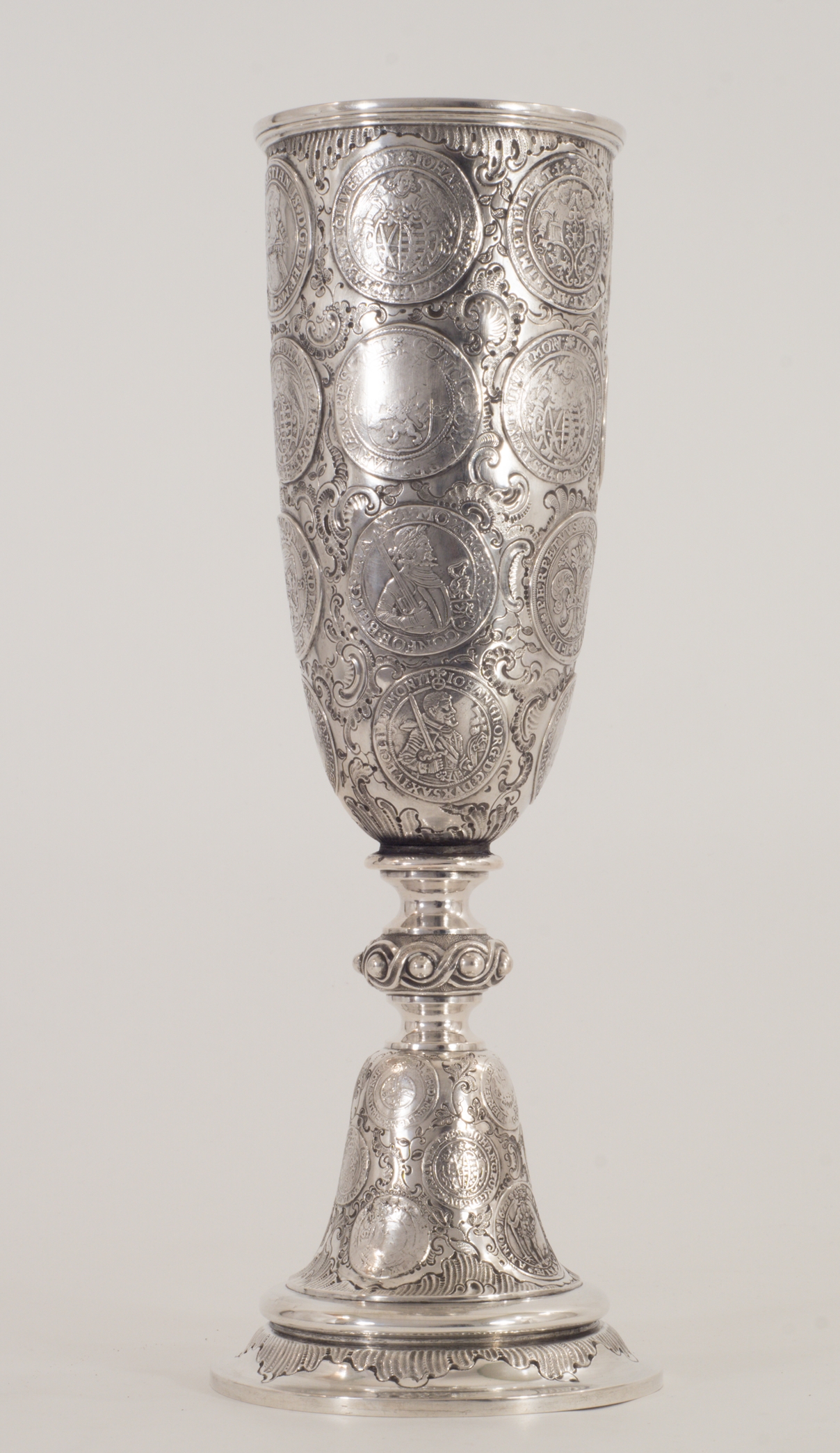 Die Kuppa auf einem balusternden Schaft, getreppter Fuß mit 12 Silbermünzen in 3 Reihen, unter anderem: