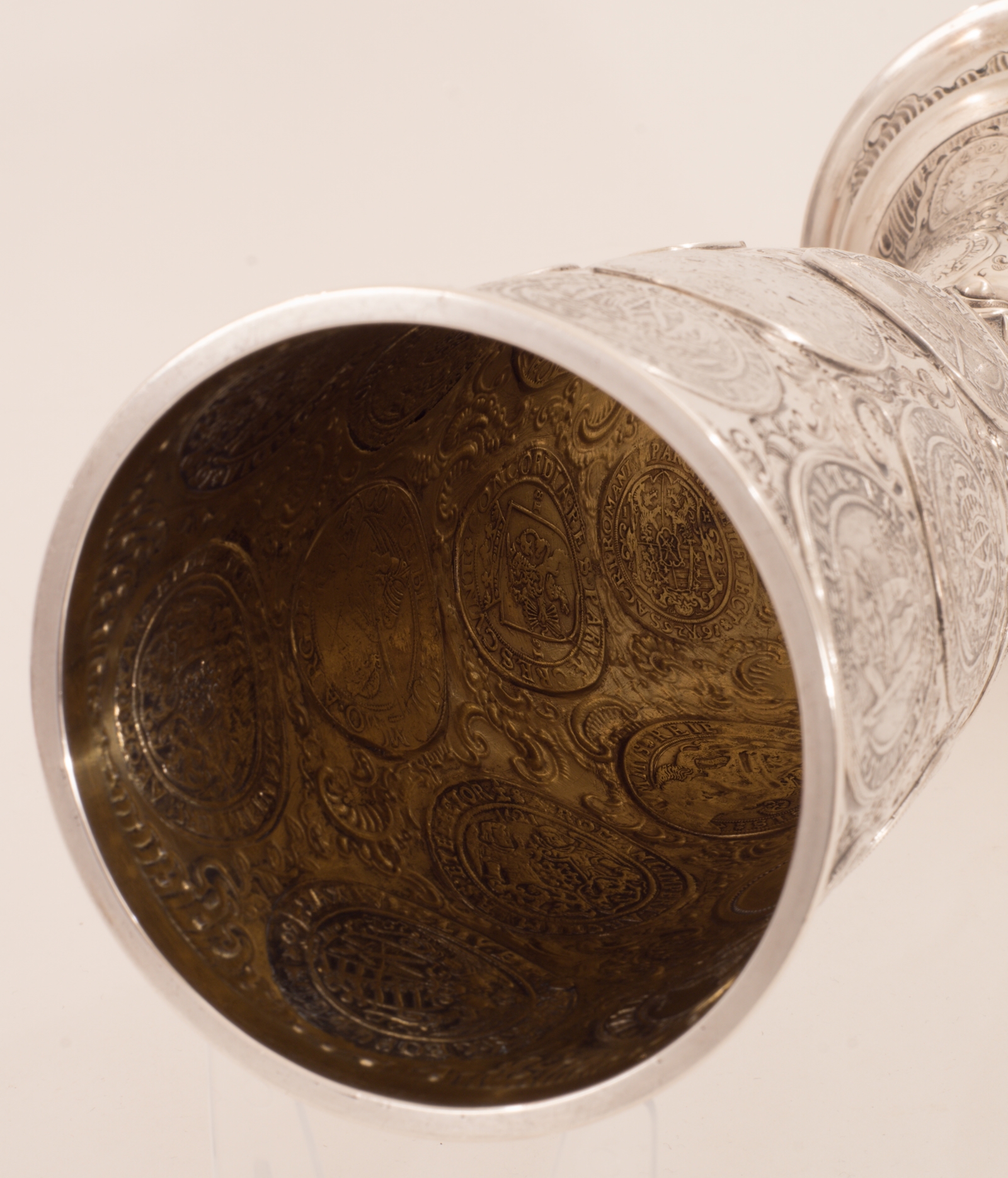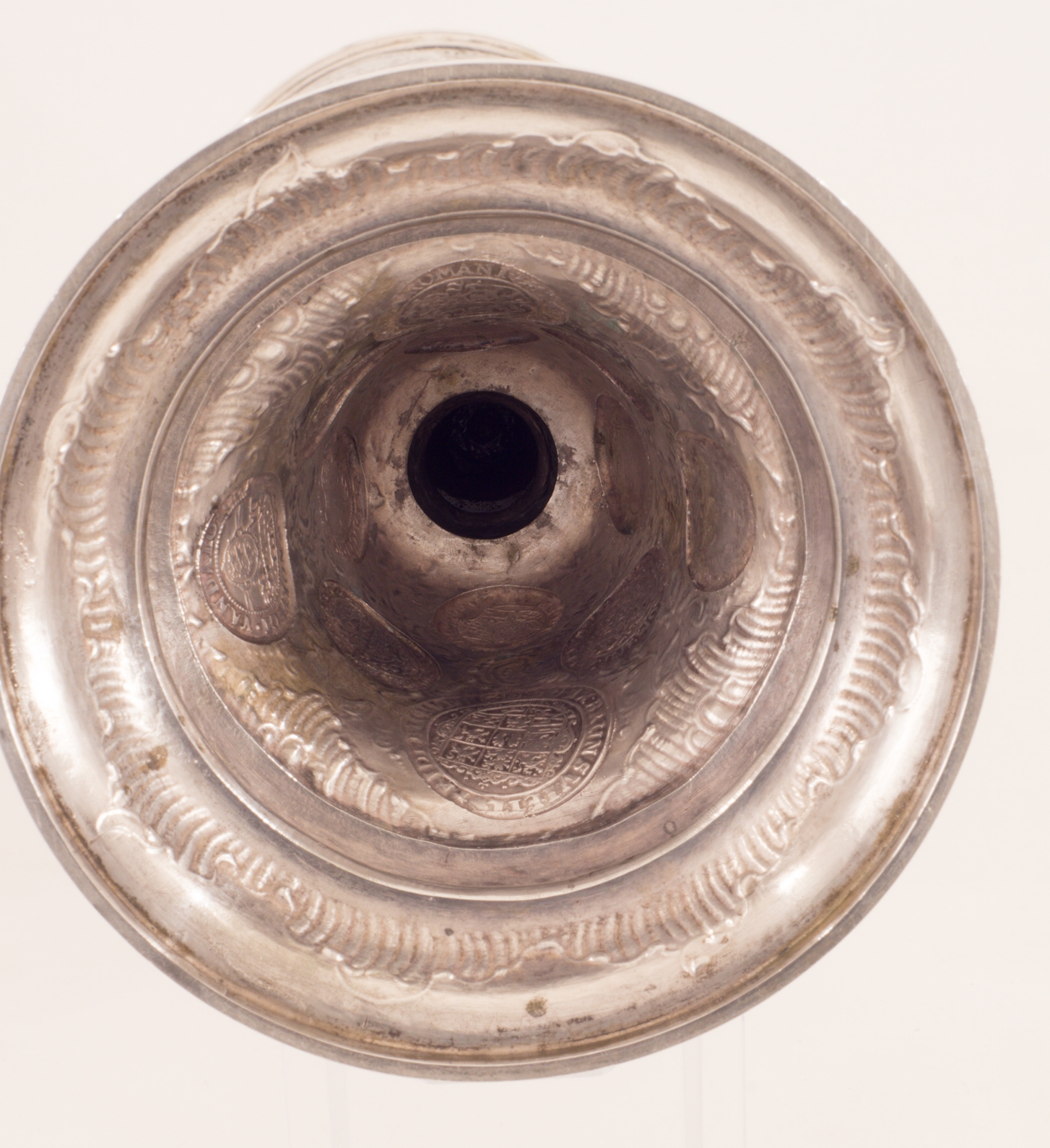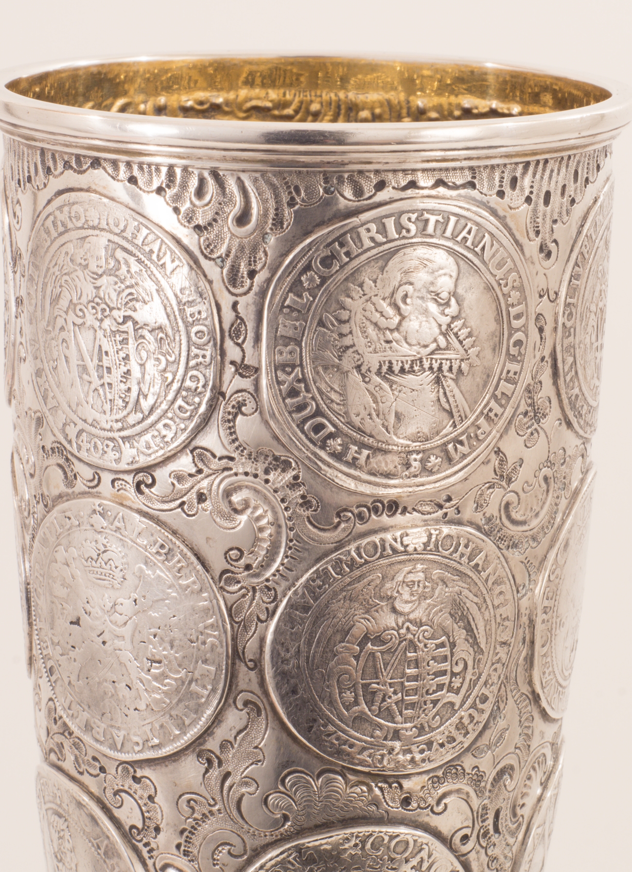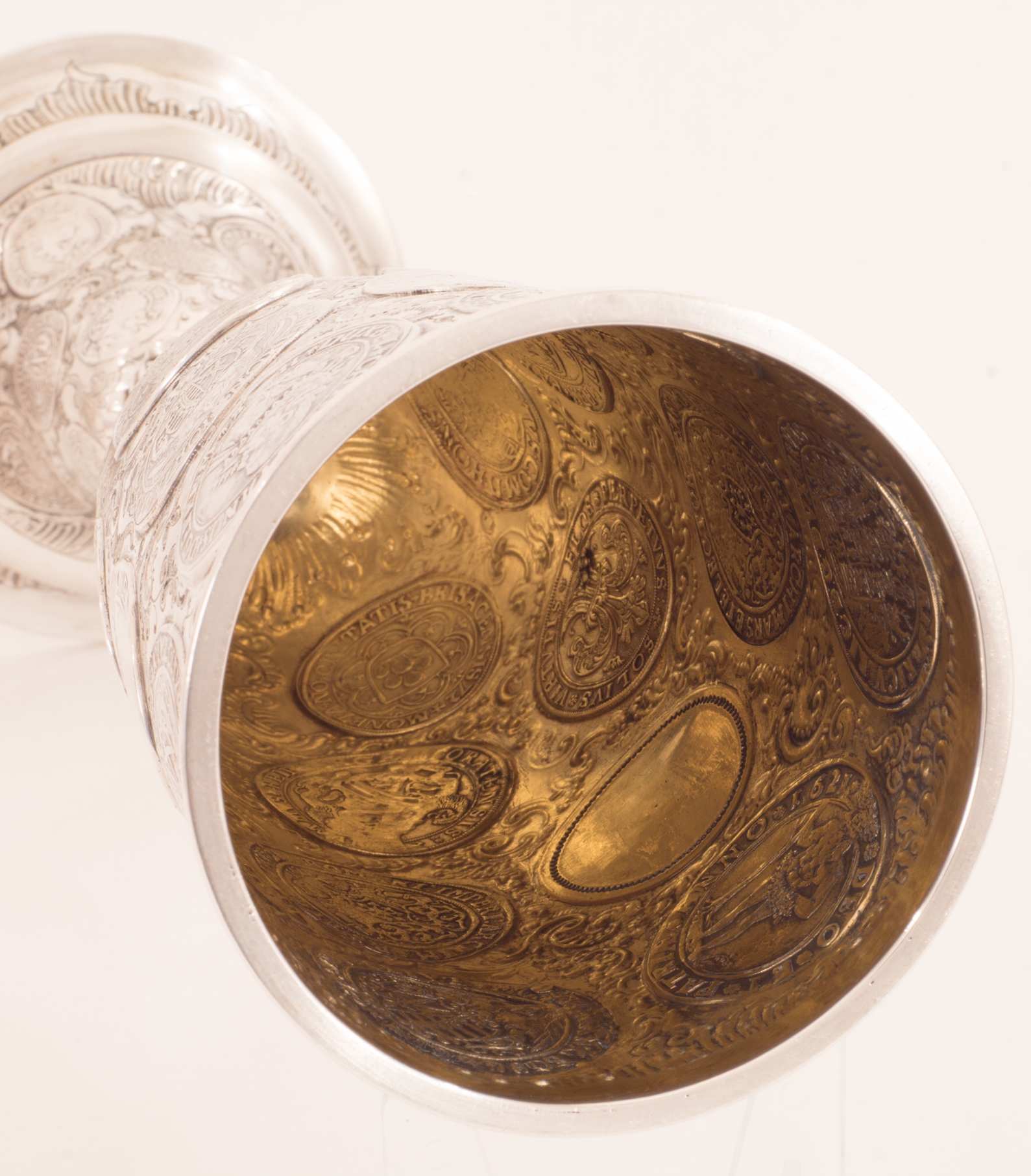 Die Kuppa auf einem balusternden Schaft, getreppter Fuß mit 12 Silbermünzen in 3 Reihen, unter anderem: