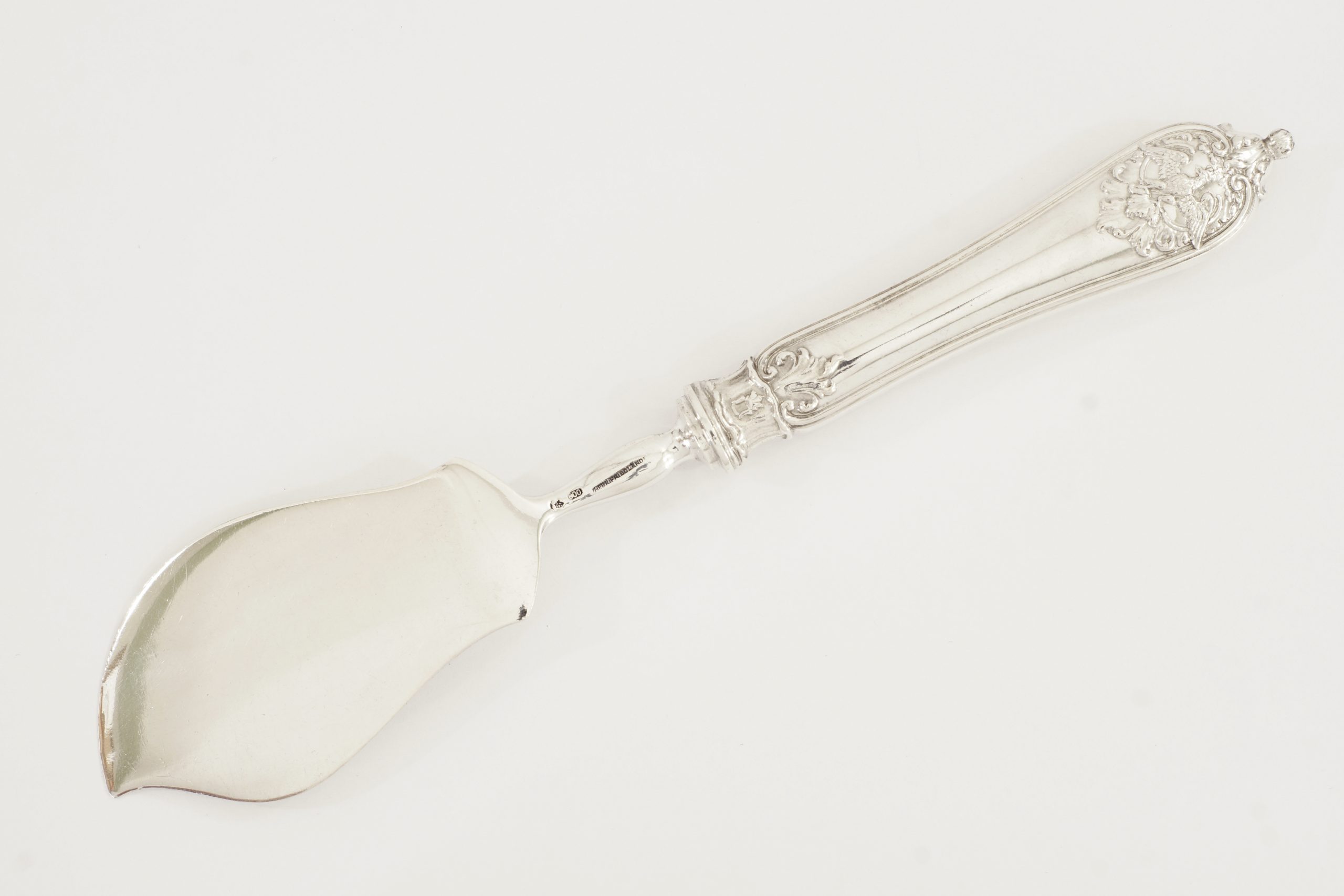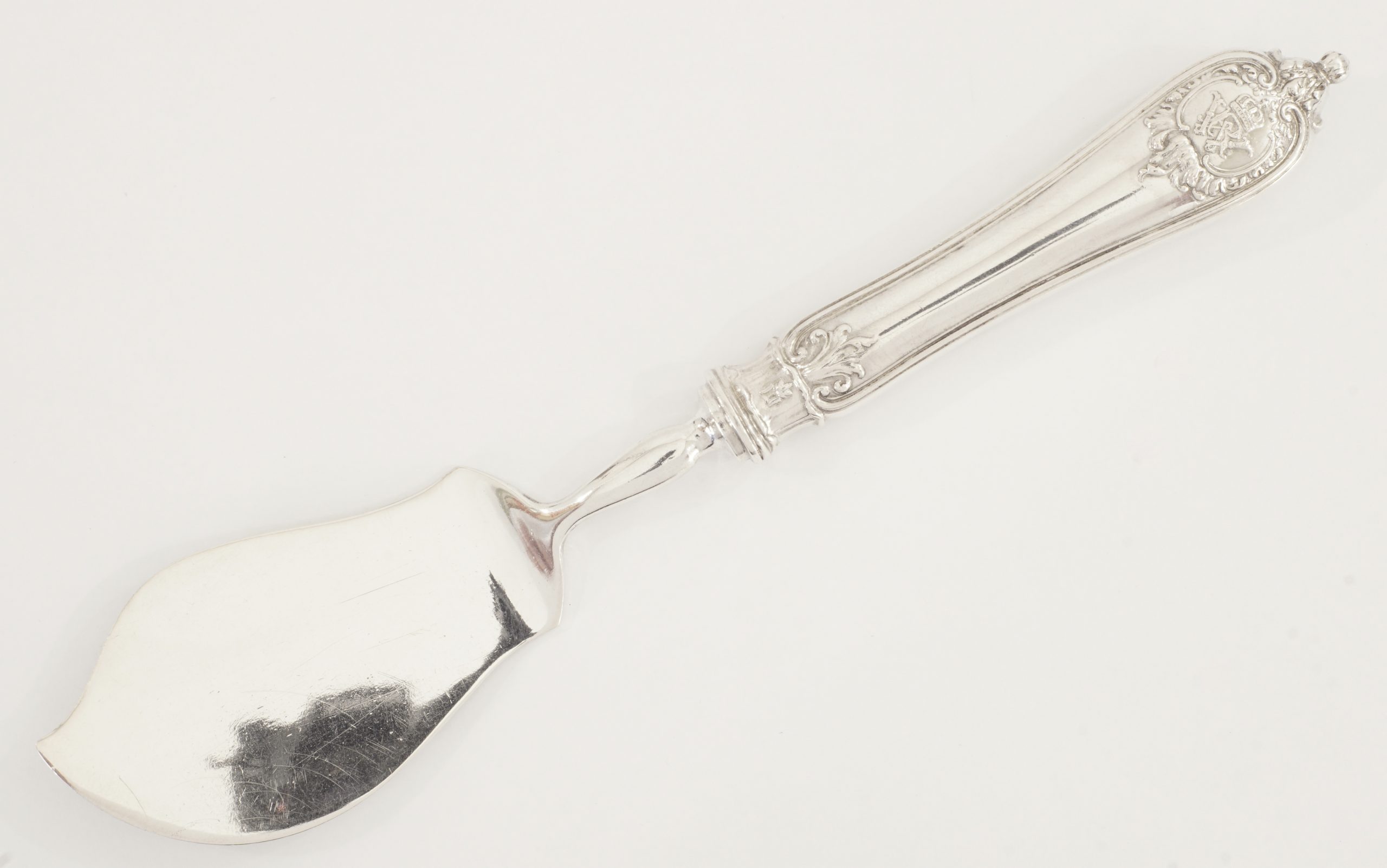 Ein Käsemesser aus dem kaiserlichen Staatsservice für Kaiser Wilhelm II., in 800er Silber, gearbeitet im Stil des Rokoko