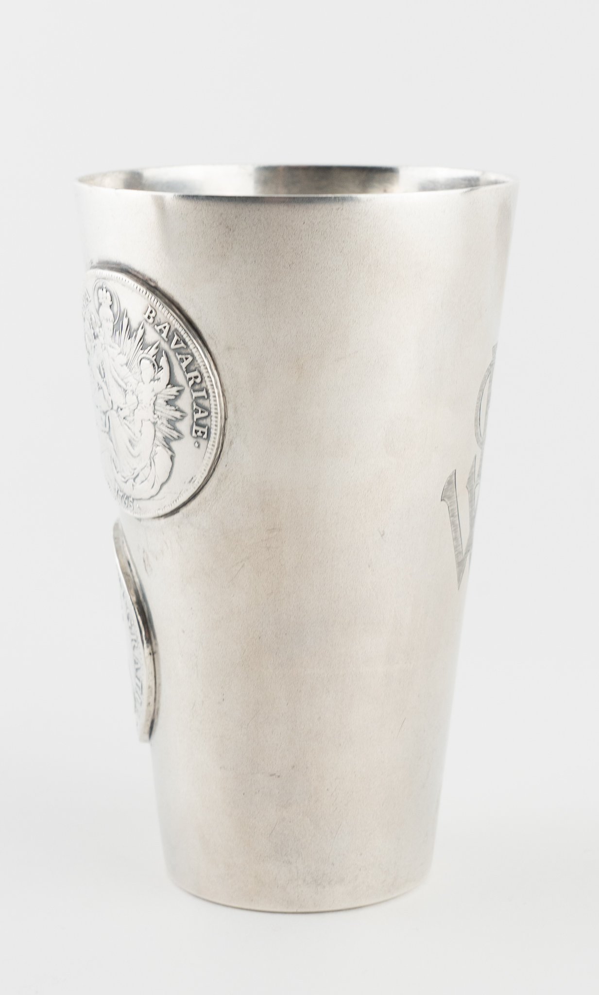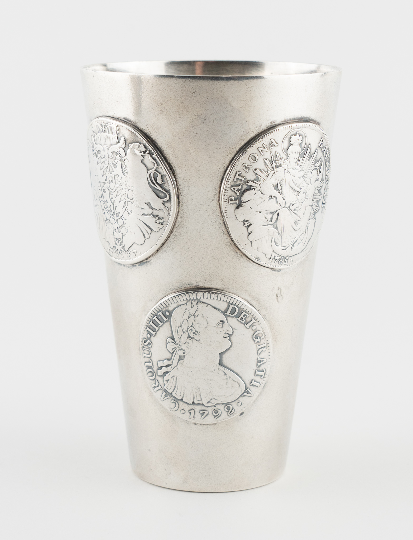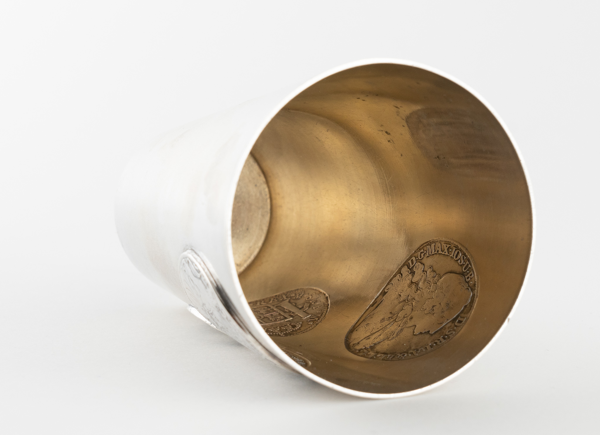 Ein Münzbecher gearbeitet in 800er Silber – mattiert – schauseitig mit 3 Münzen aus dem 18. Jahrhundert: