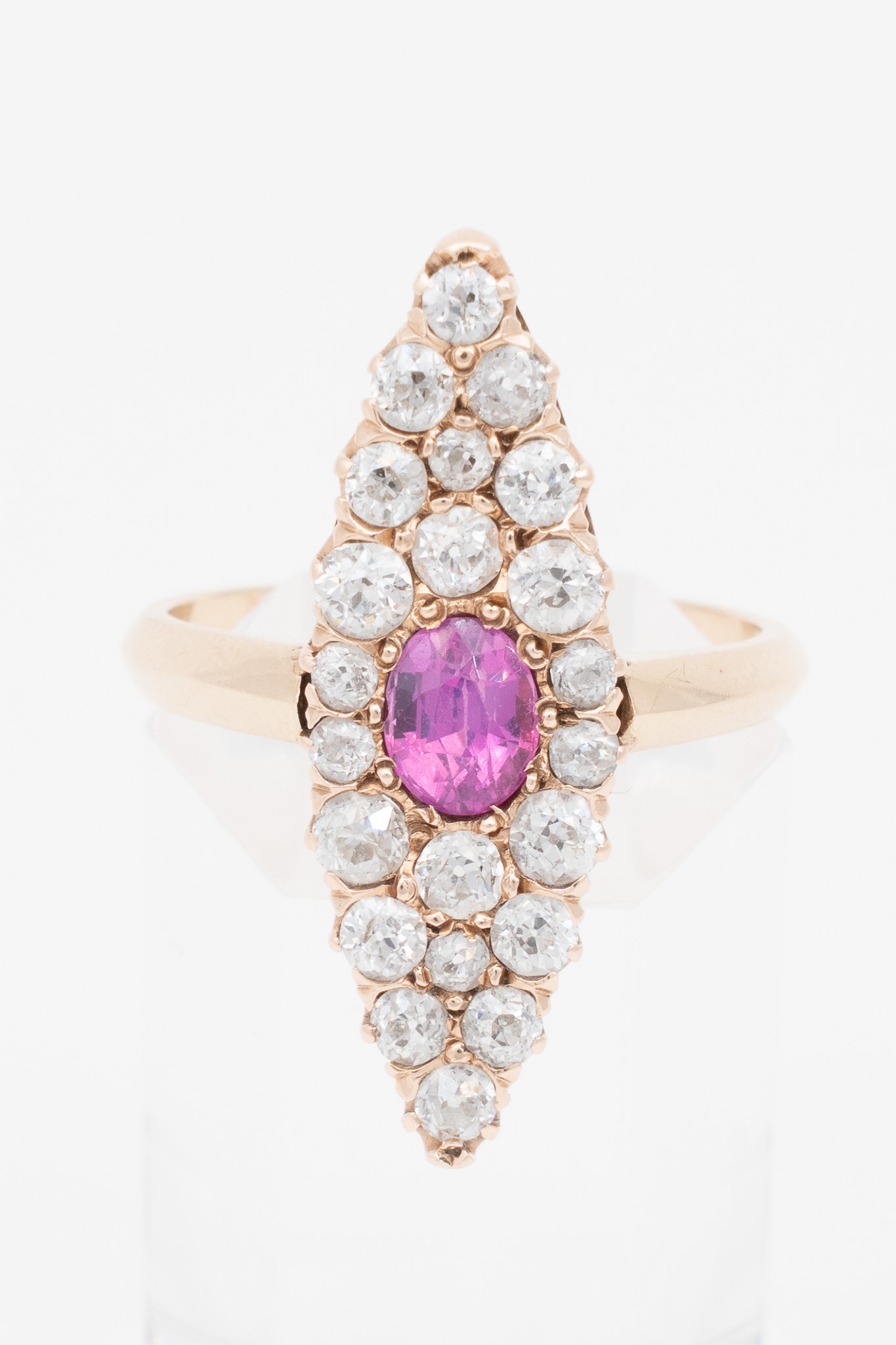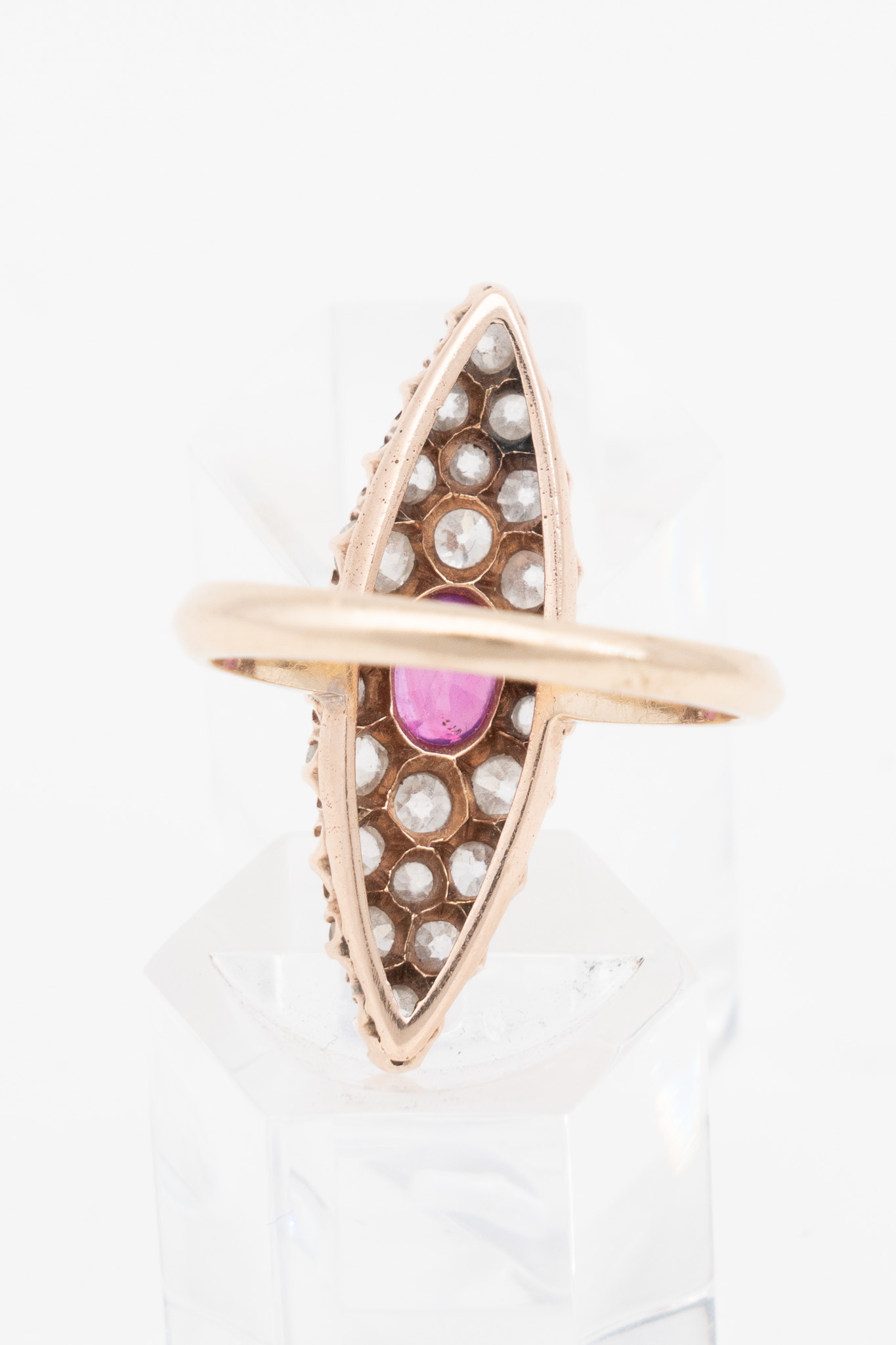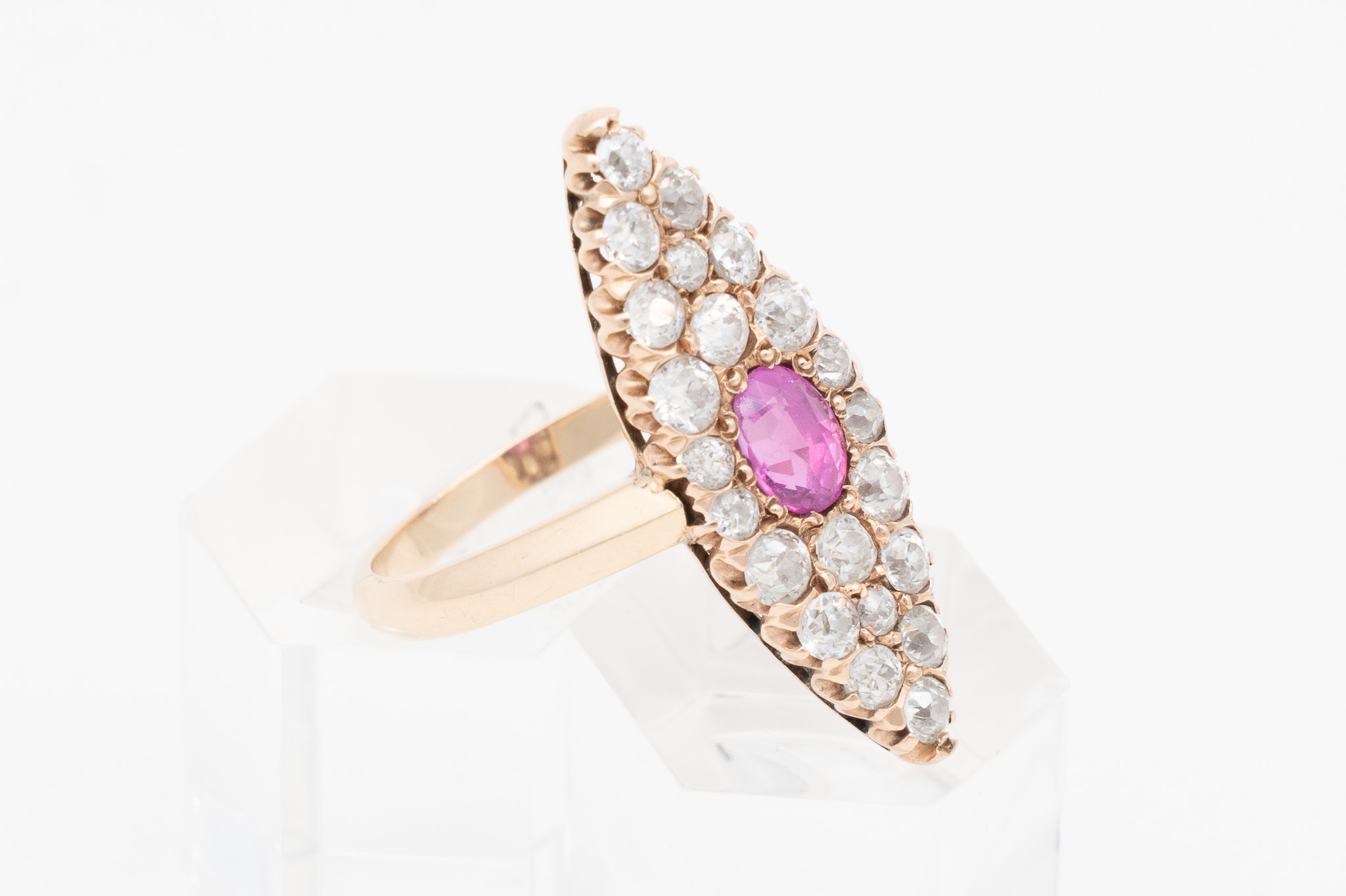 in Navette-Ring, gearbeitet in 14 Karat Gelbgold (585/1000) mit 22 Altschliff-Diamanten von zusammen ca. 1,62 ct. Und einem roten Saphir von ca. 0,5 ct.