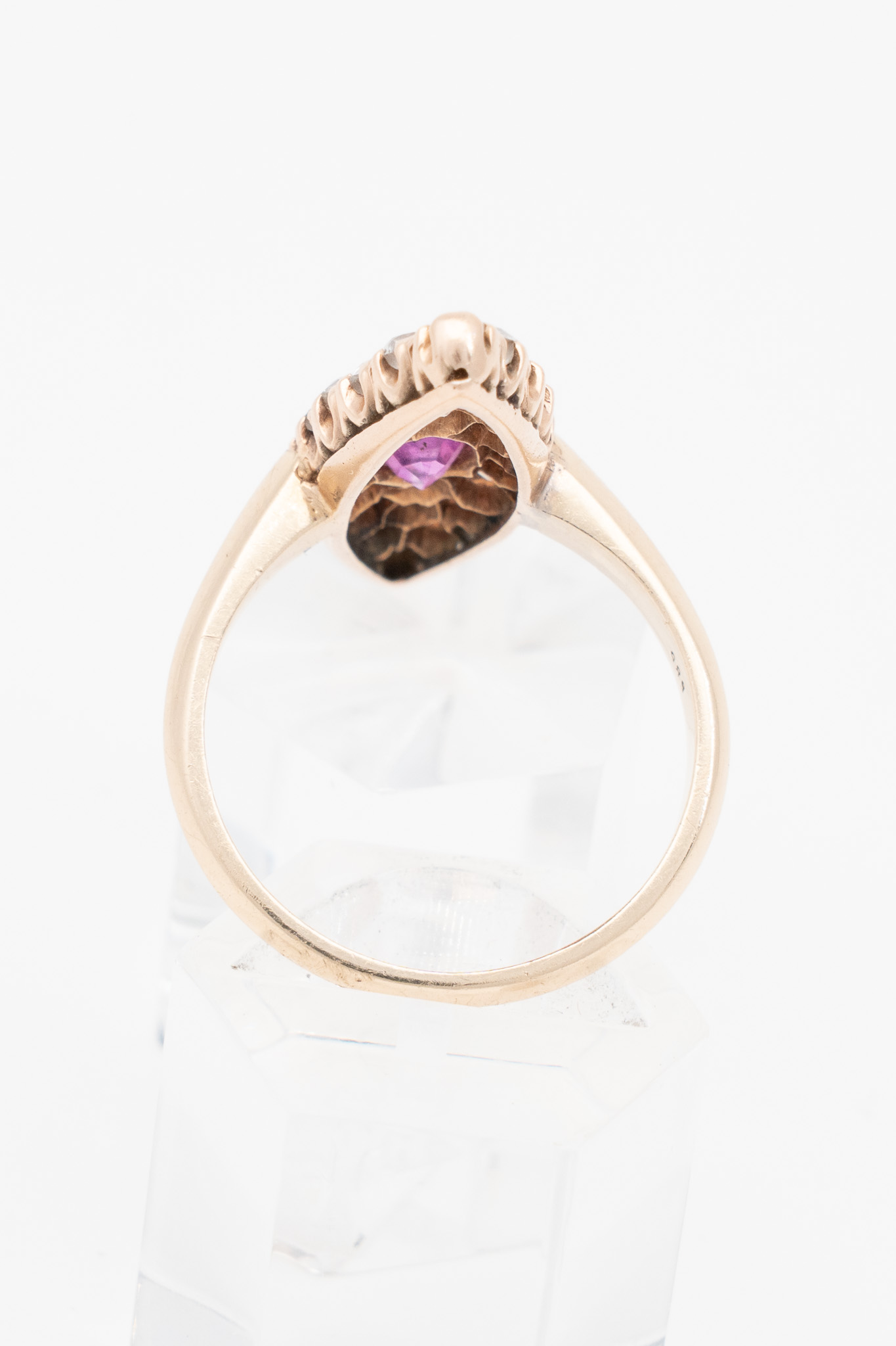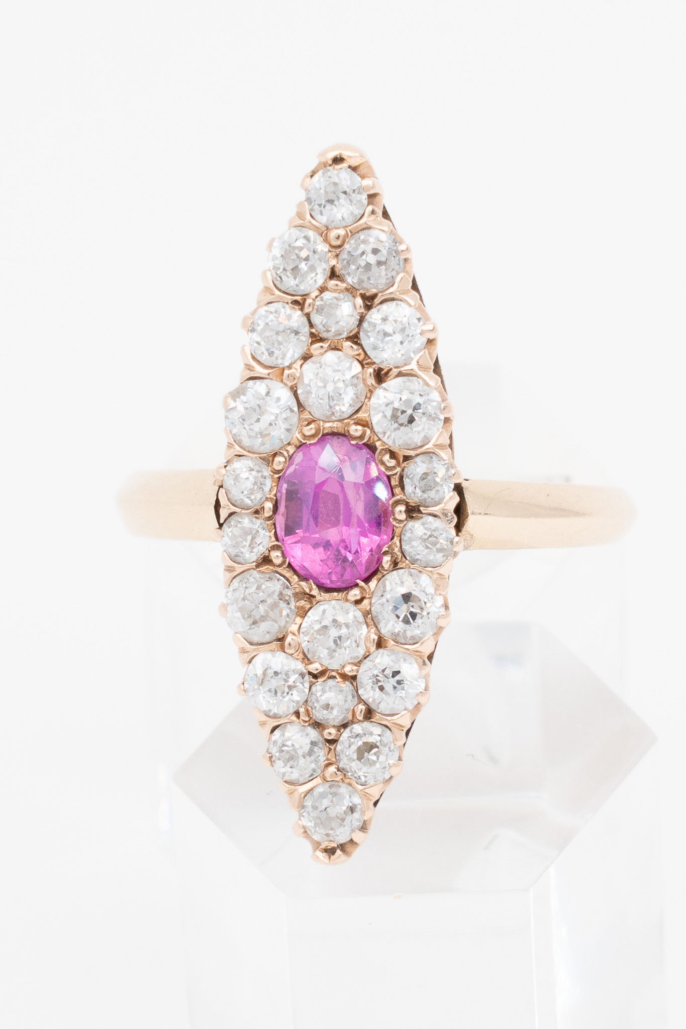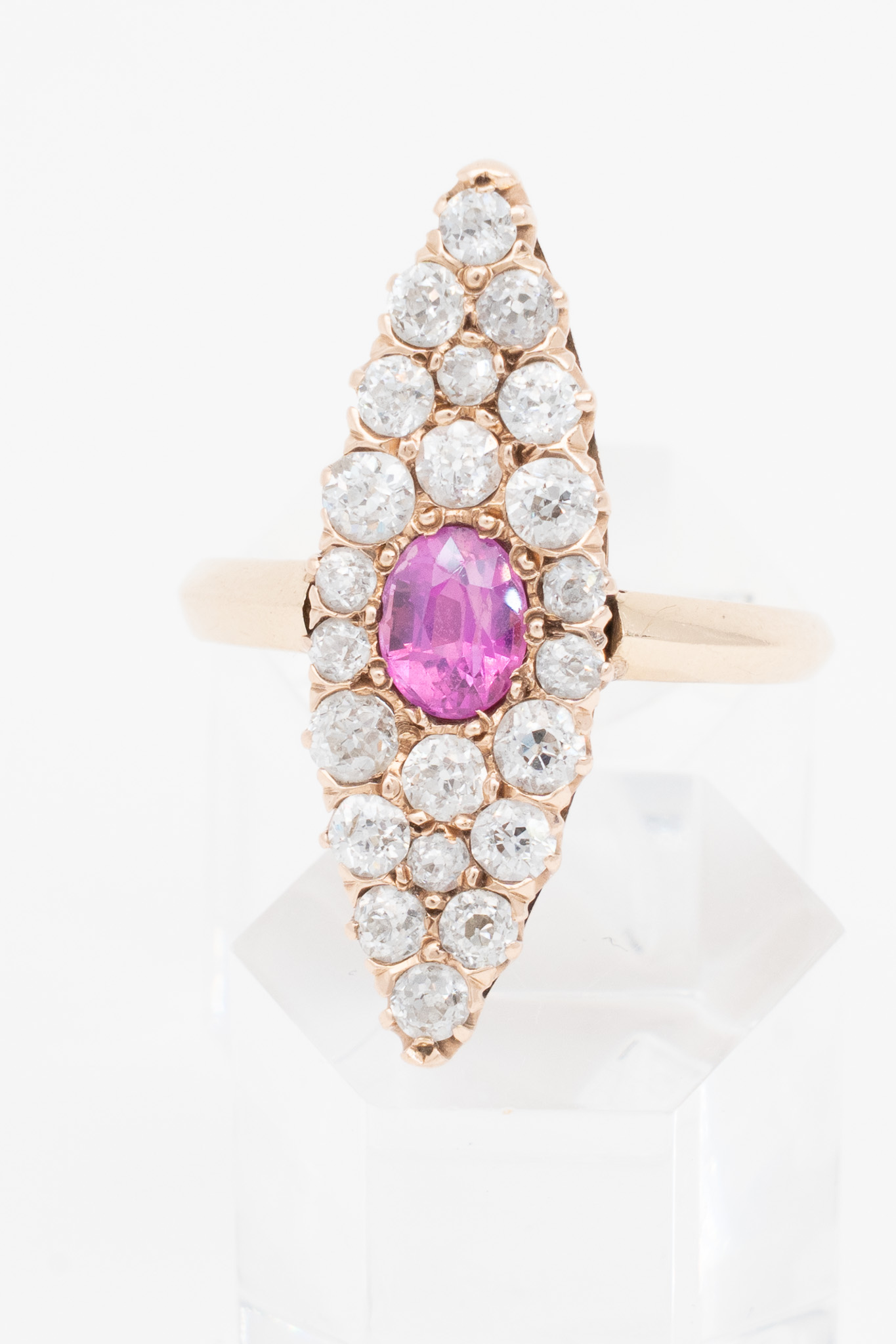in Navette-Ring, gearbeitet in 14 Karat Gelbgold (585/1000) mit 22 Altschliff-Diamanten von zusammen ca. 1,62 ct. Und einem roten Saphir von ca. 0,5 ct.