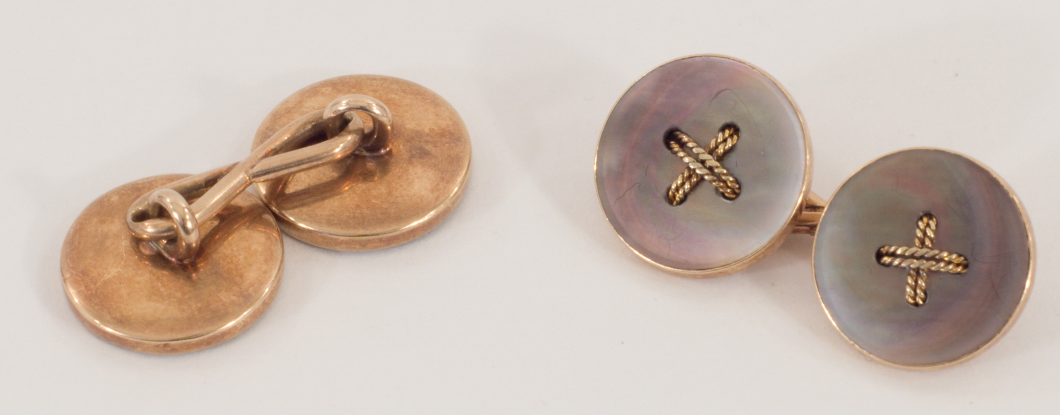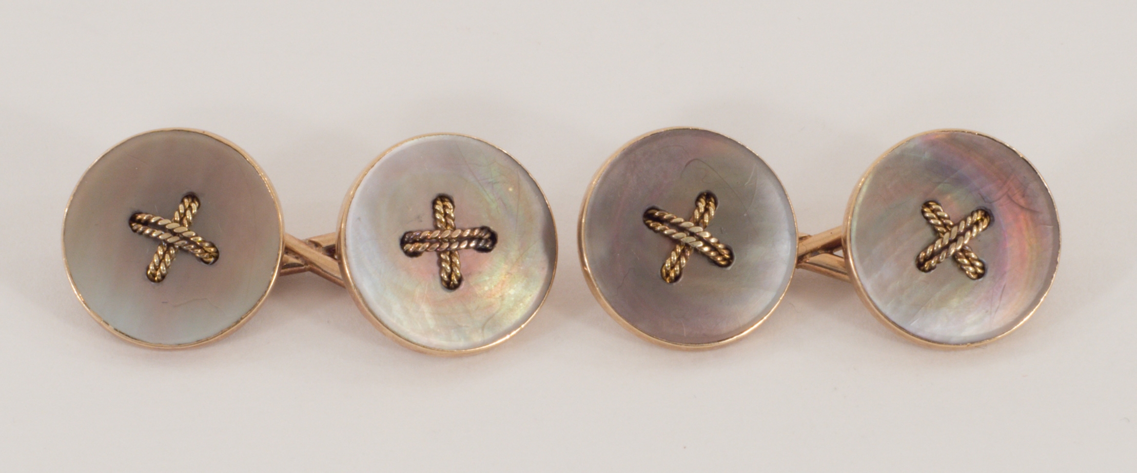 Ein Paar doppelte Manschettenknöpfe in 14 Karat (585/1000) Rotgold mit Perlmutt-Einlagen im Design eines festgenähten Knopfes.