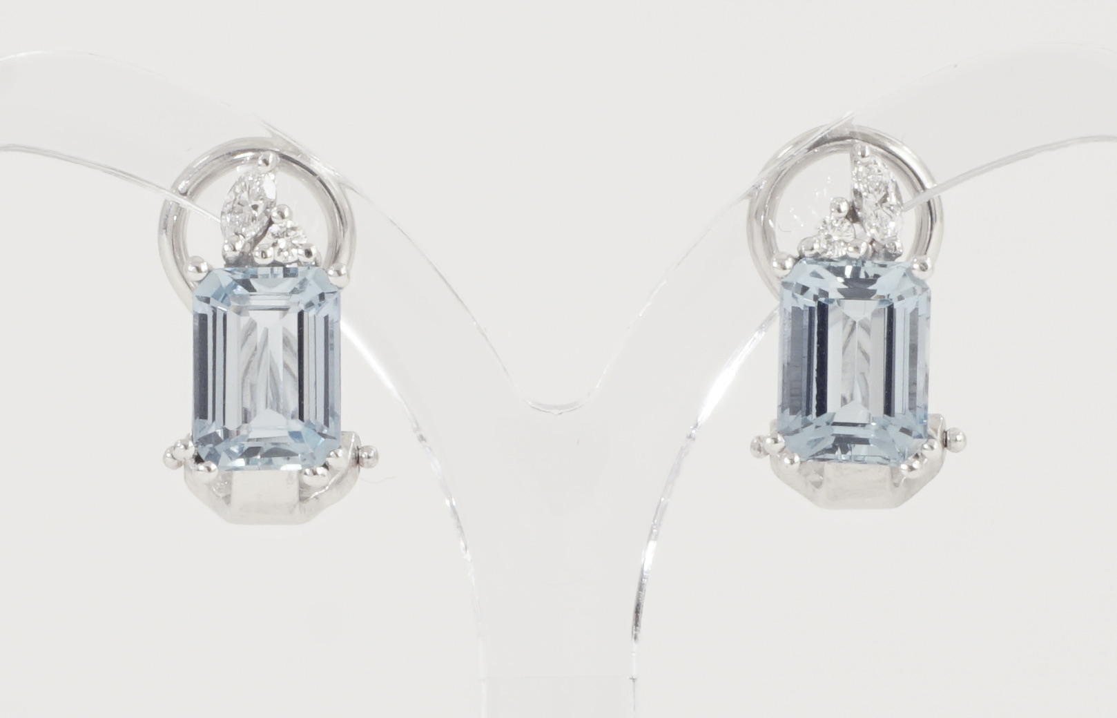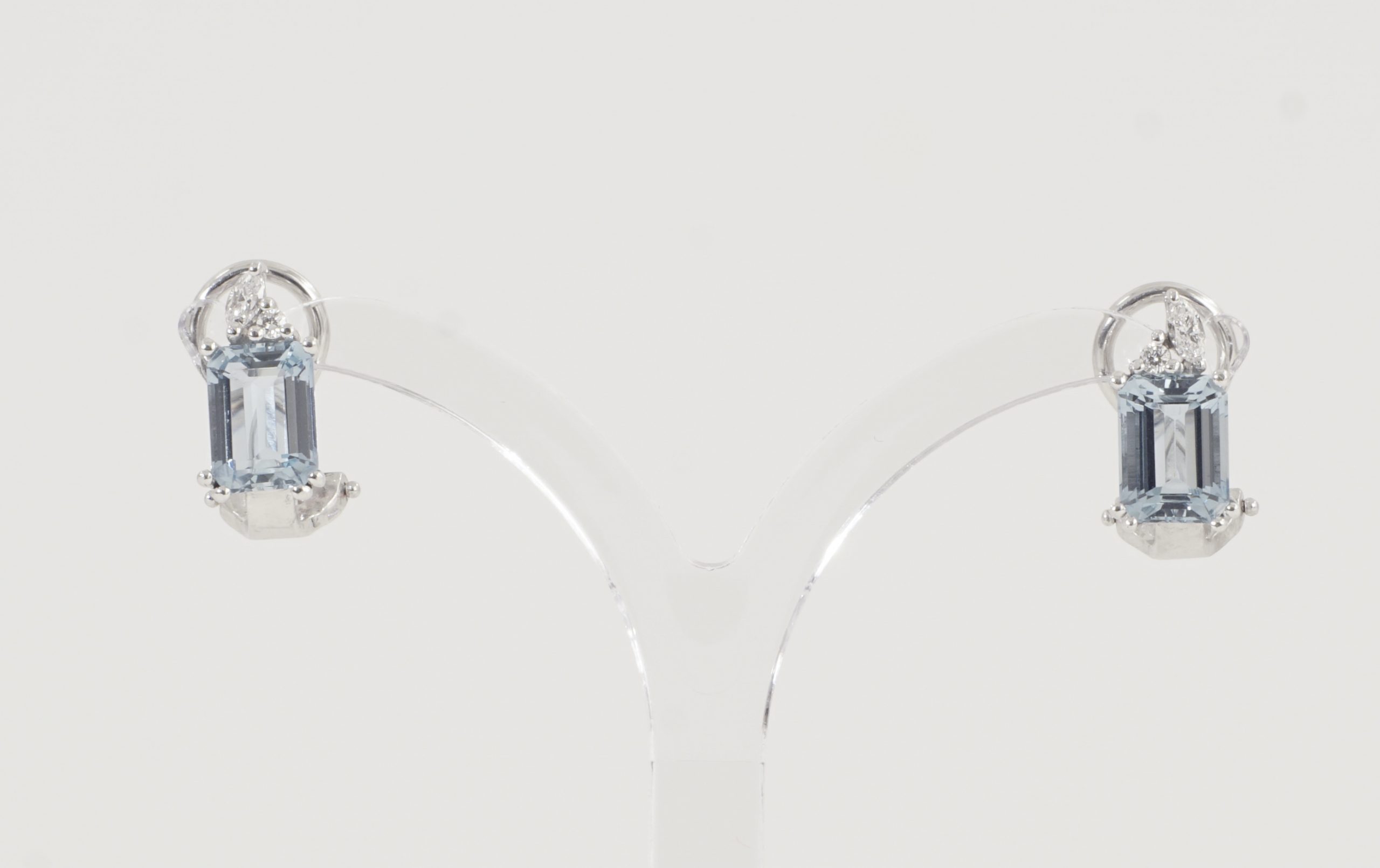 Ein Paar Aquamarin-Ohrclips mit Diamantbesatz in 18 Karat (750/1000) Weissgold – ausgefasst mit zwei Aquamarinen im Tafelschliff von zusammen ca. 2 ct. sowie zwei Diamant-Navetten und zwei Brillanten von zusammen ca. 0,15 ct.