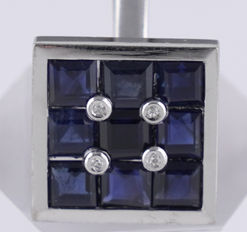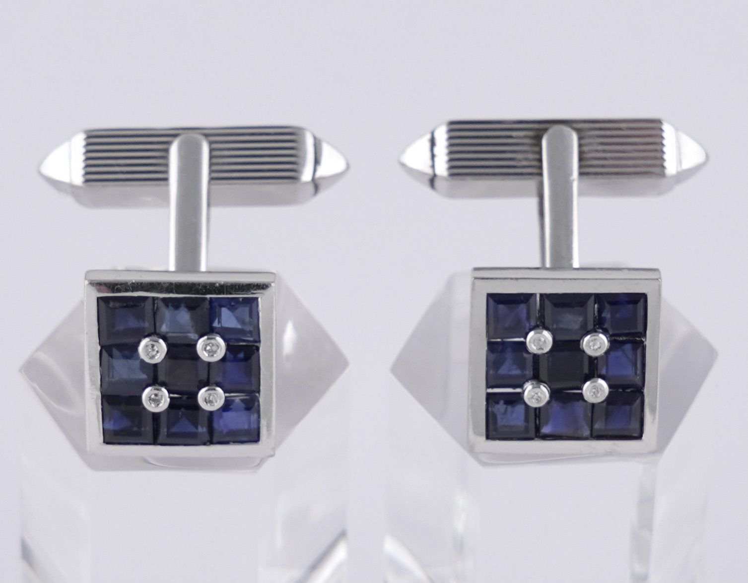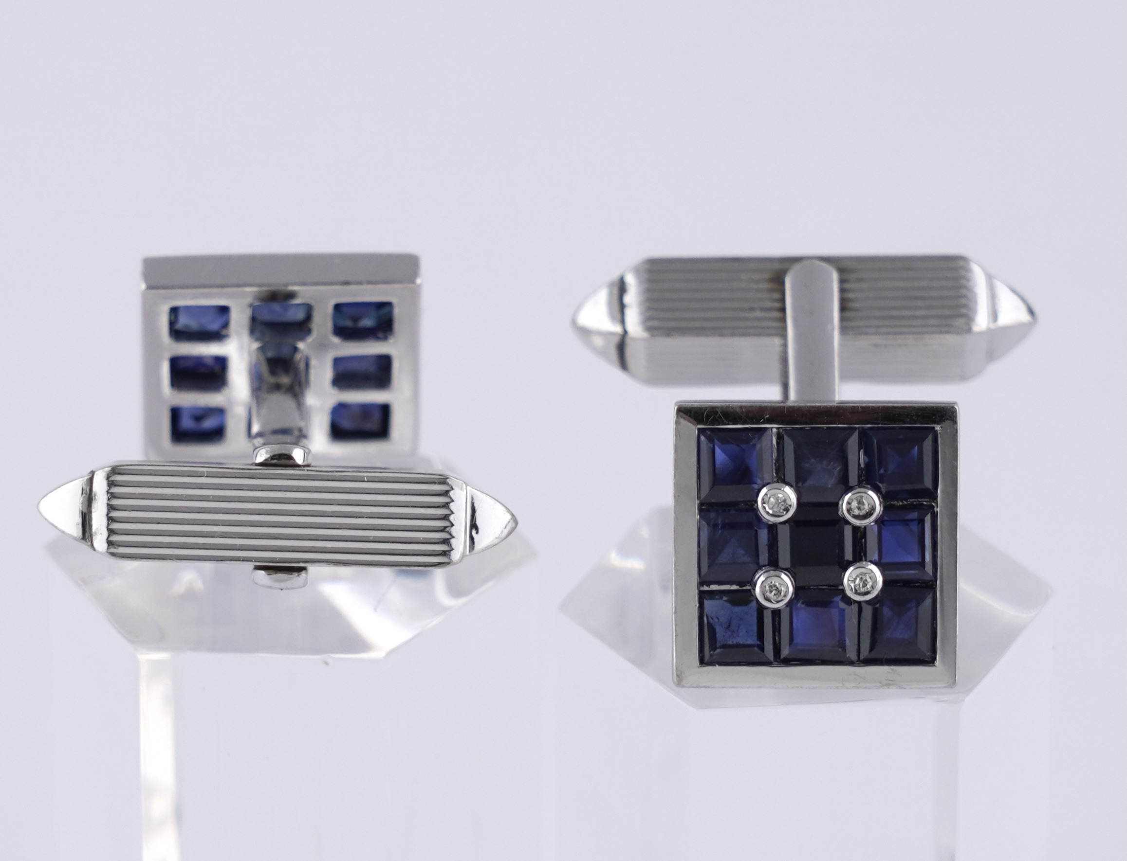 Ein Paar elegante quadratische Manschettenknöpfe gearbeitet in 18 Karat (750/1000) Weißgold. Ausgefasst mit 18 Saphir-Carrés, Pavé gefasst, von zusammen ca. 3,6 ct. und 8 Diamanten.