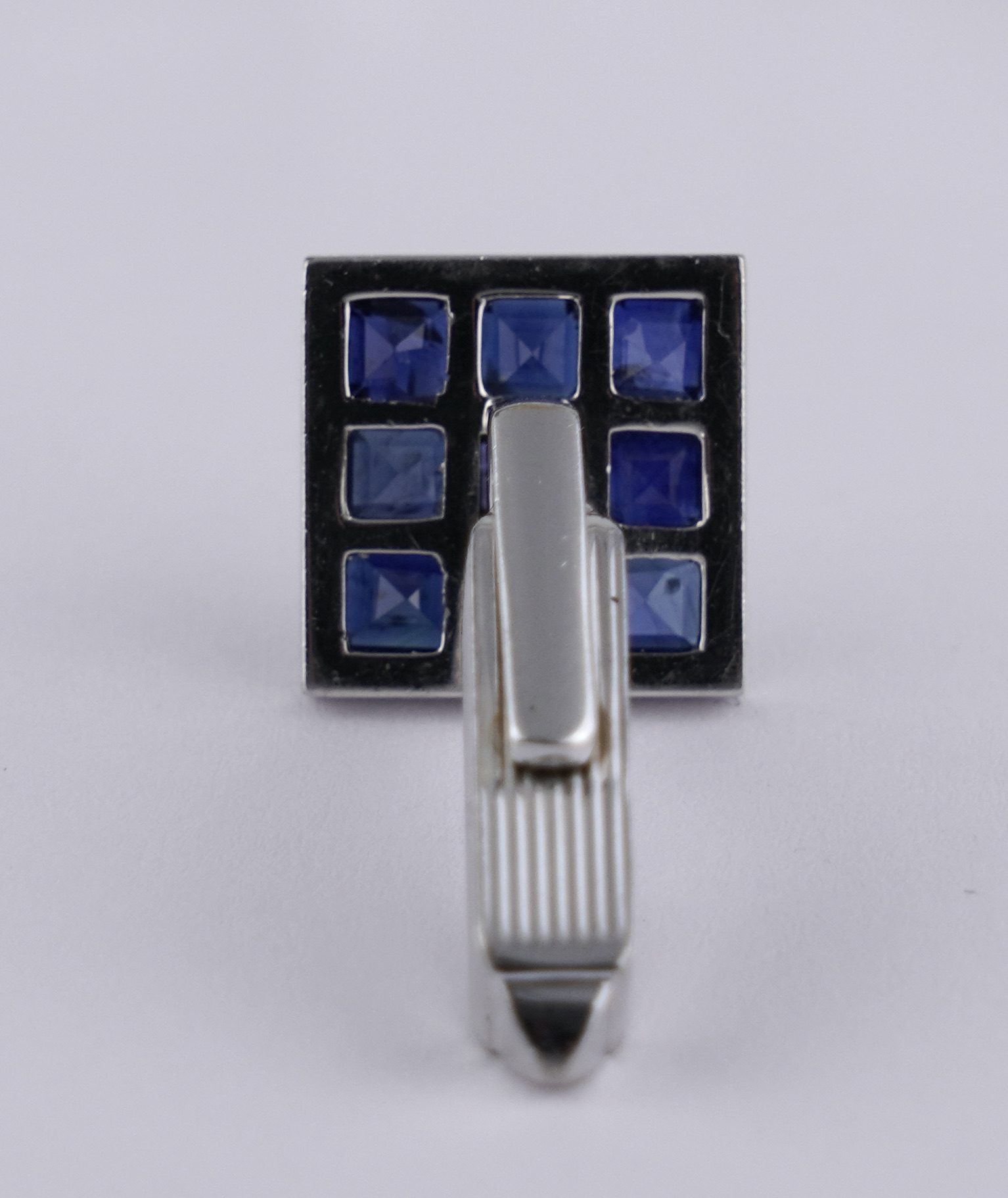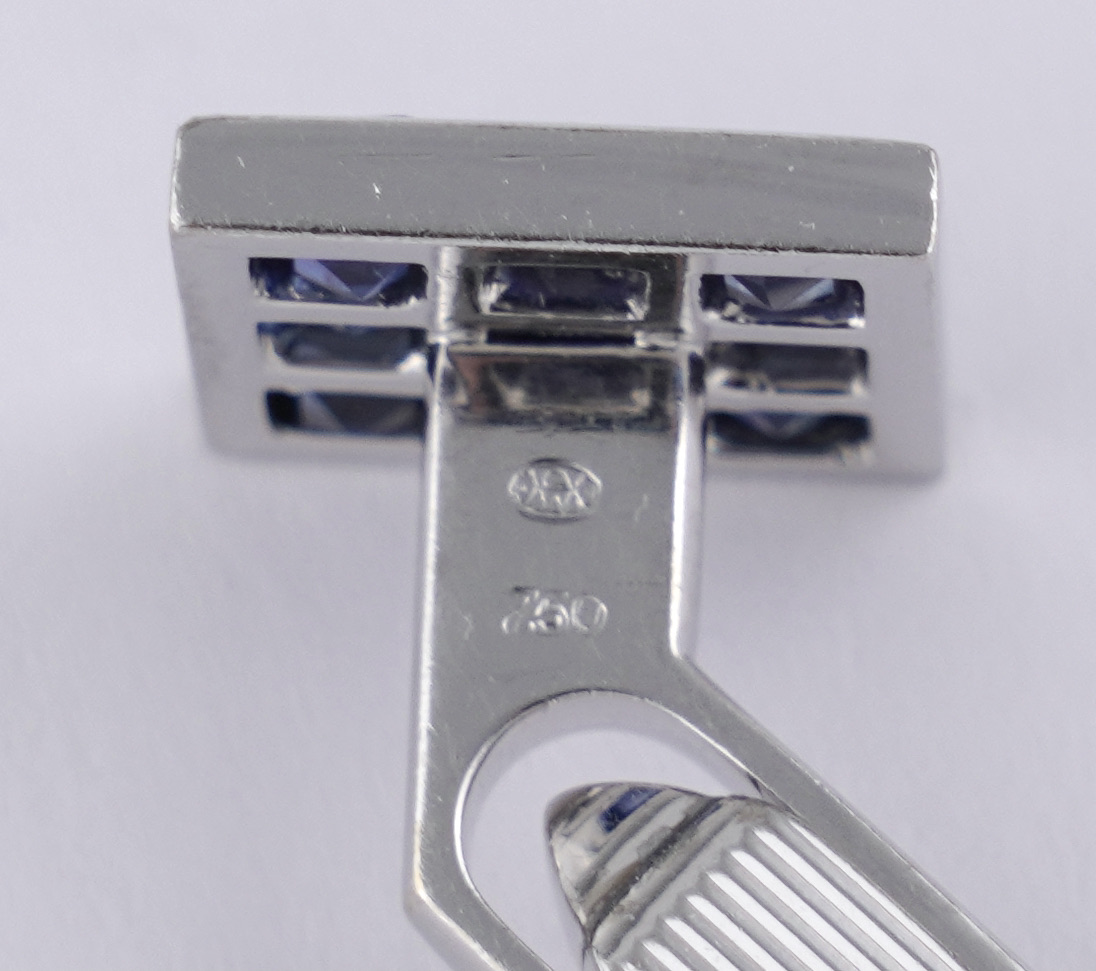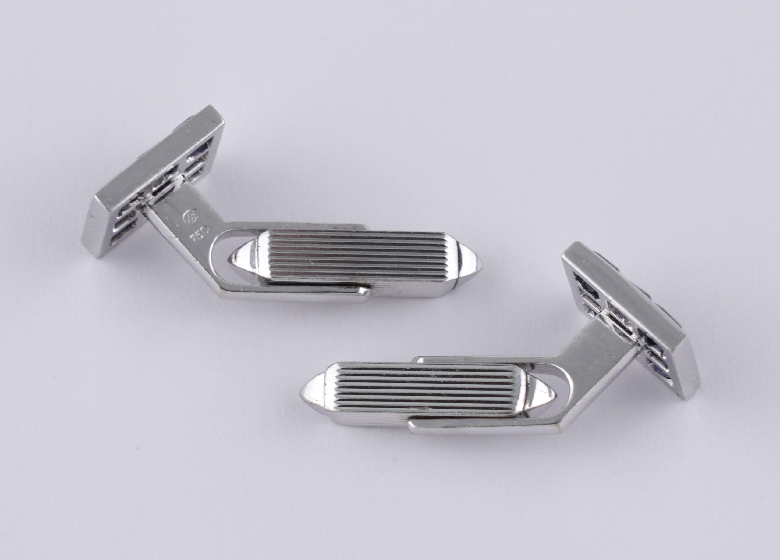 Ein Paar elegante quadratische Manschettenknöpfe gearbeitet in 18 Karat (750/1000) Weißgold. Ausgefasst mit 18 Saphir-Carrés, Pavé gefasst, von zusammen ca. 3,6 ct. und 8 Diamanten.