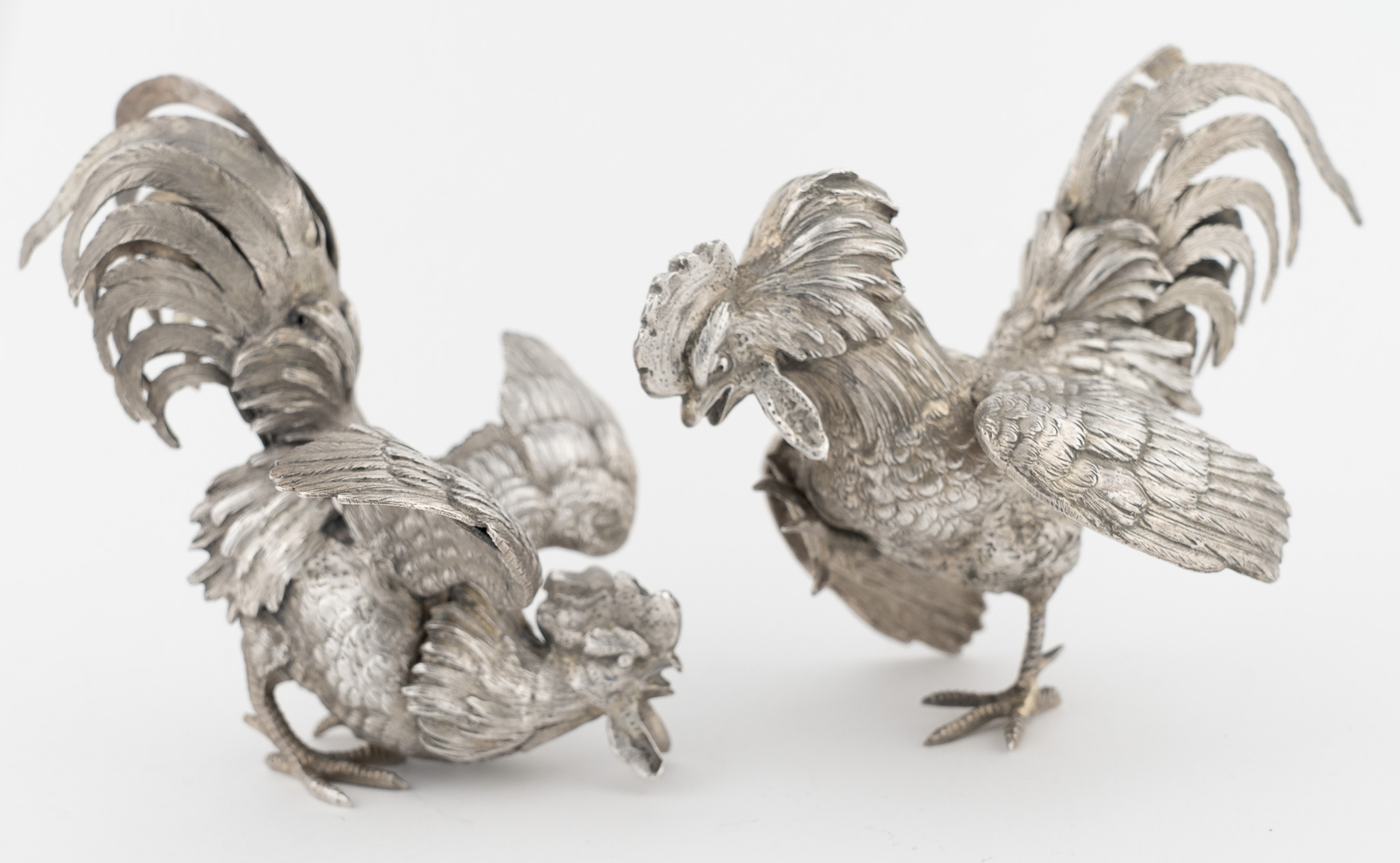Ein Paar Kampfhähne in 925er Silber in Kampfpose – fein ausgearbeitet. Silber gegegossen und ziseliert.