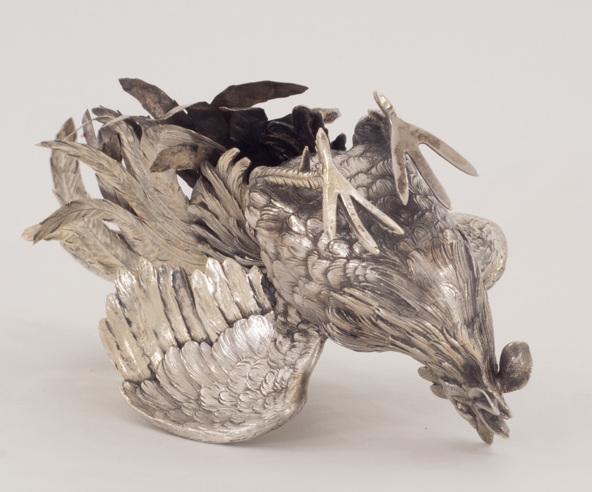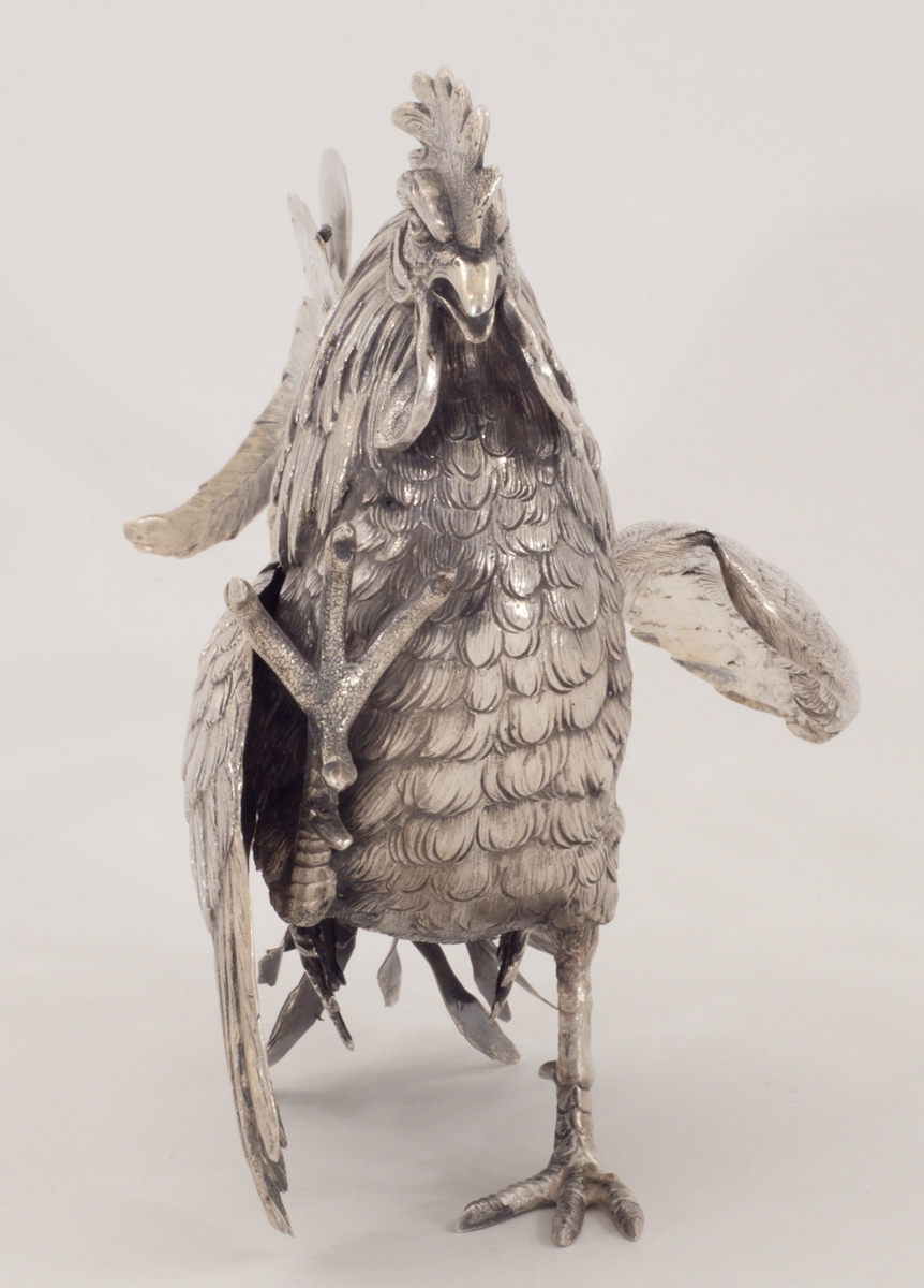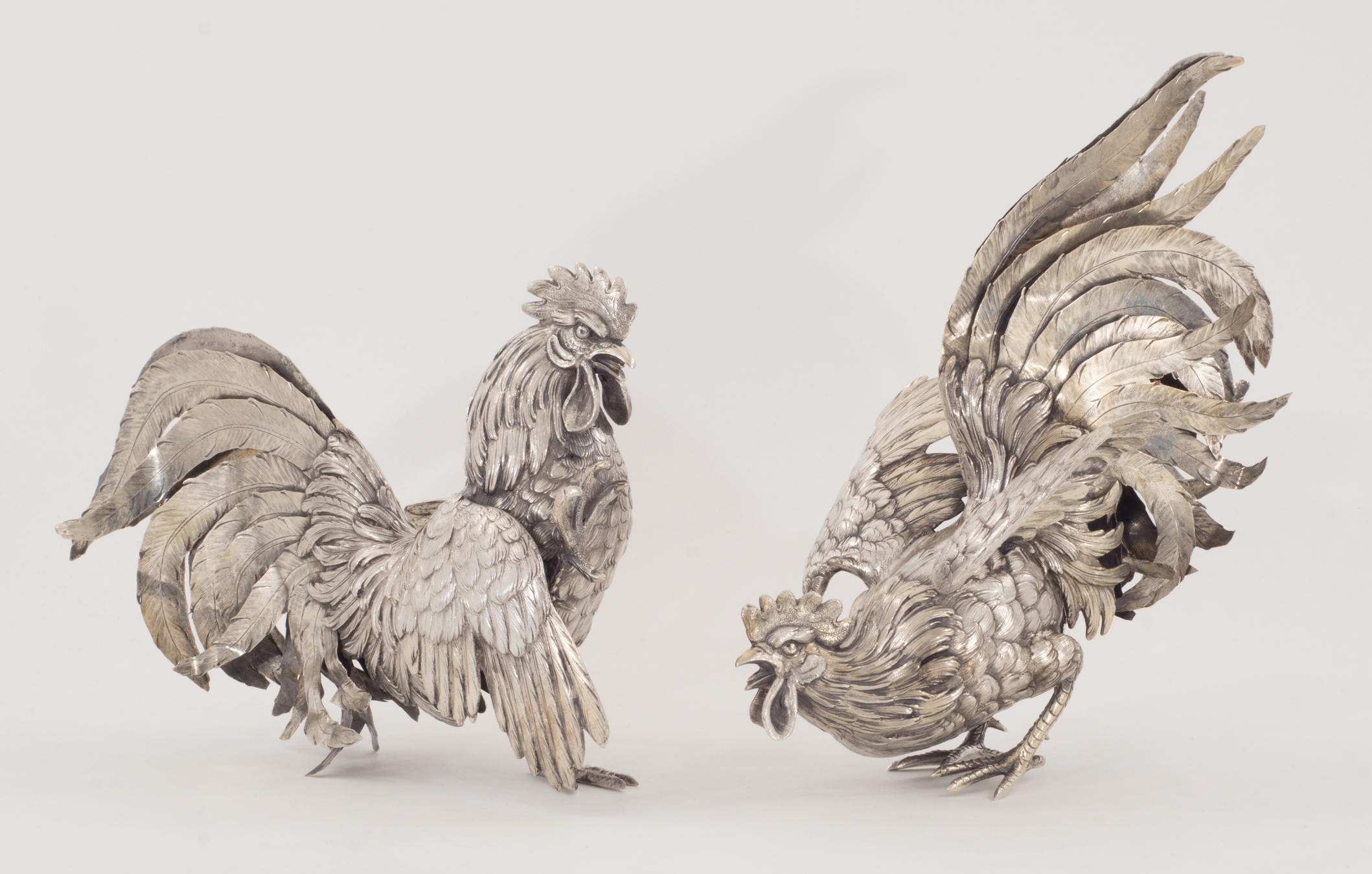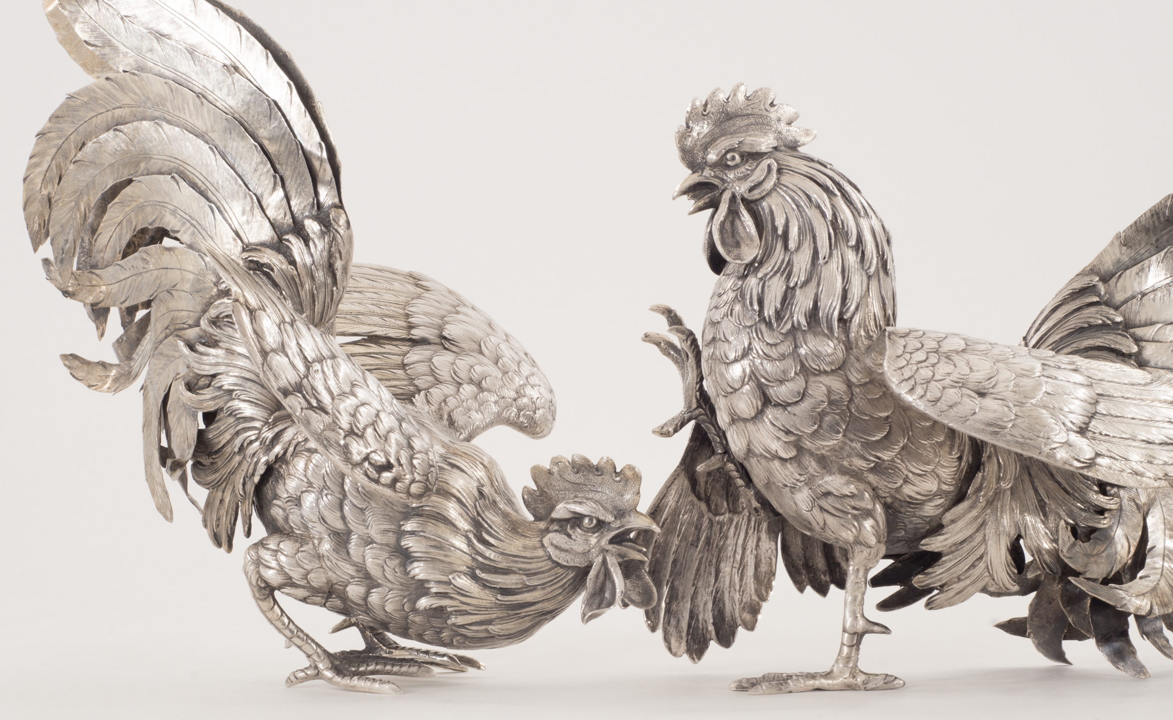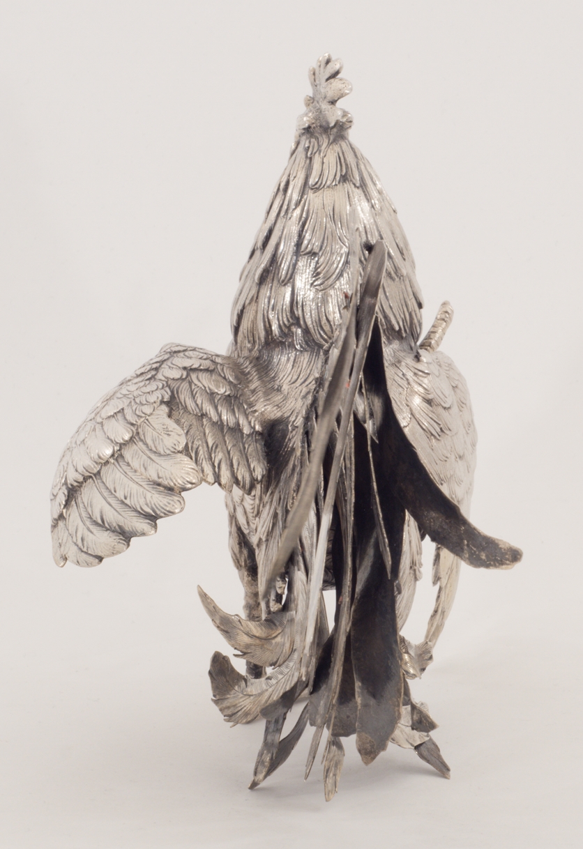 Zwei Kampfhähne in 800er Silber in Kampfpose – aufwendig gearbeitet.